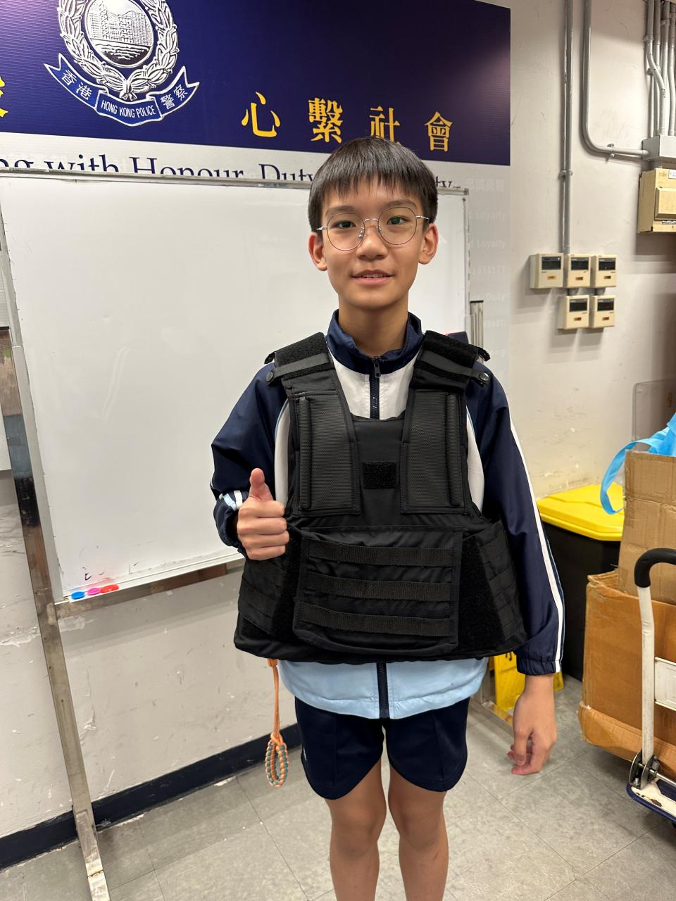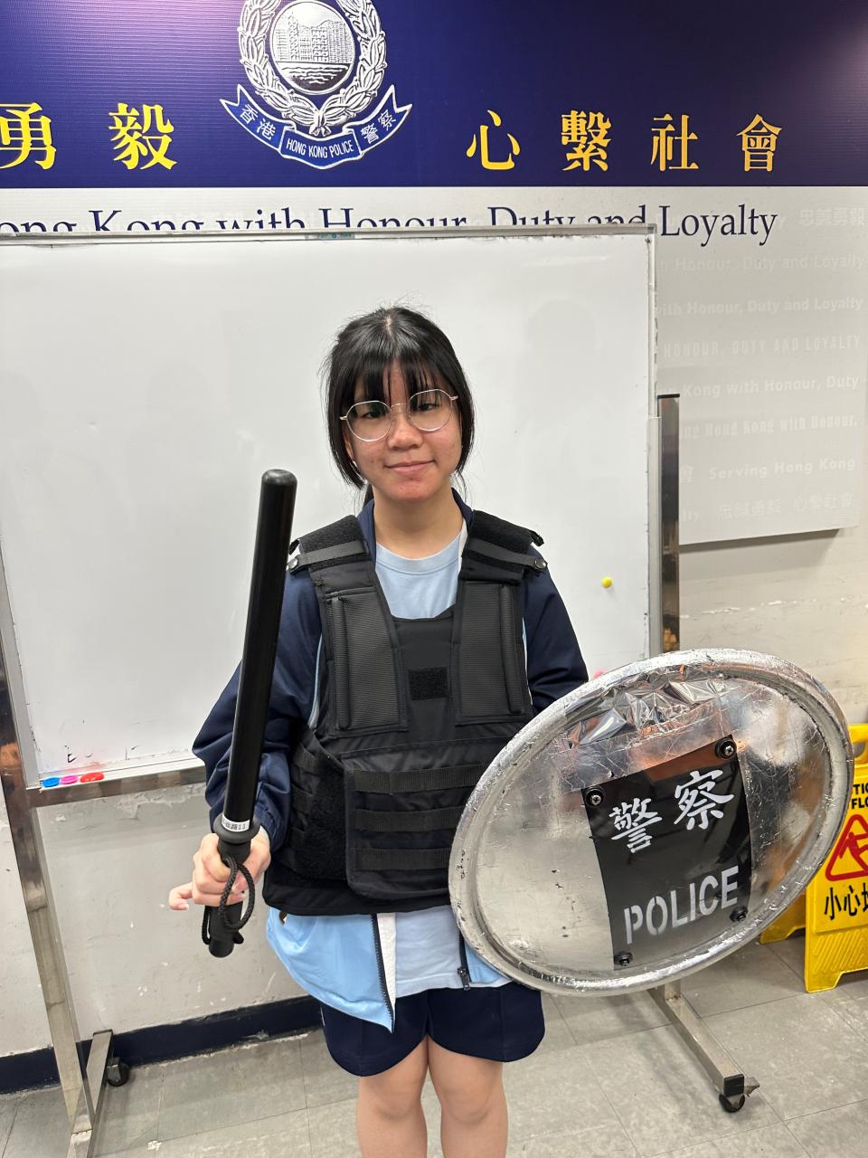 在這次的活動中,我見識到許多關於警隊所用的東西,更令我明白到在警察局的規則和職位。我們不但能夠拍照及拿起警隊常用的近戰武器,還可以穿著防彈衣,體驗到警員的責任,這也令我們十分滿足。