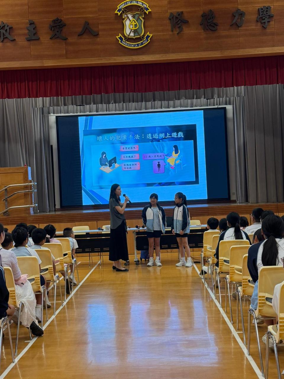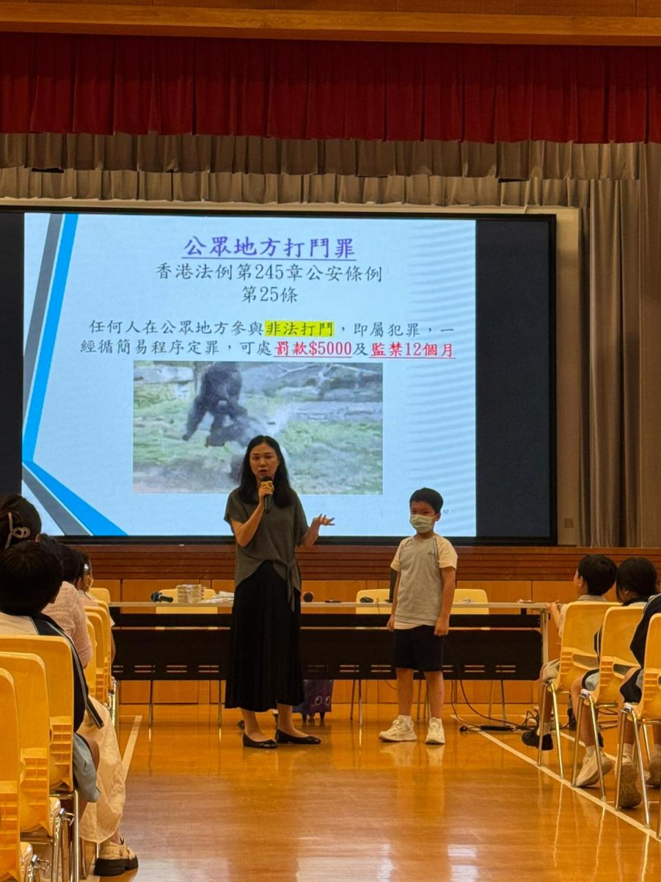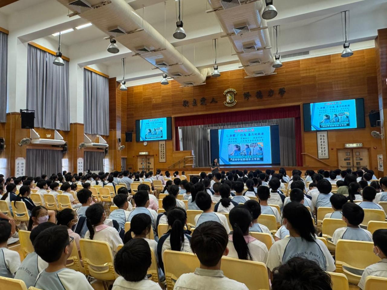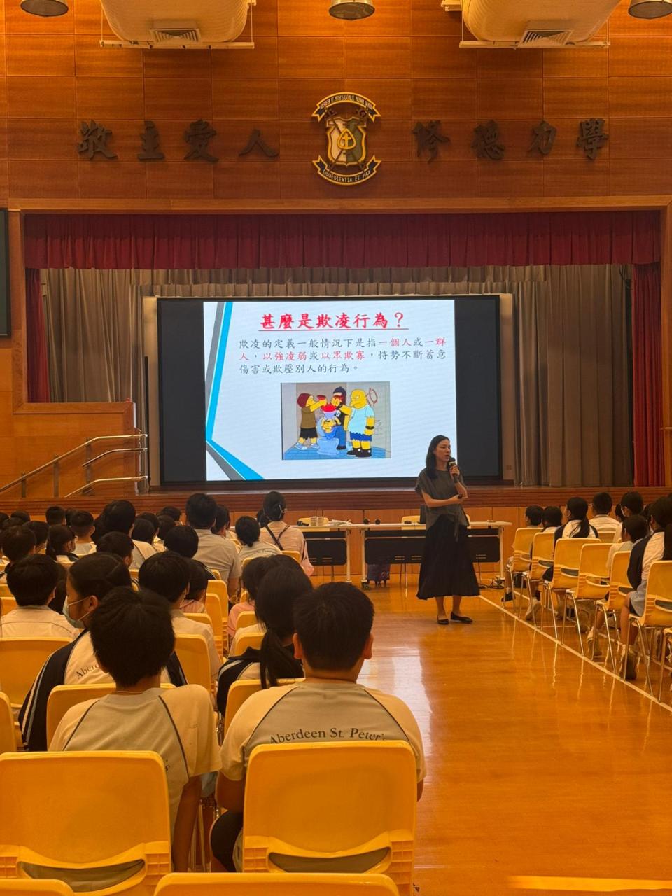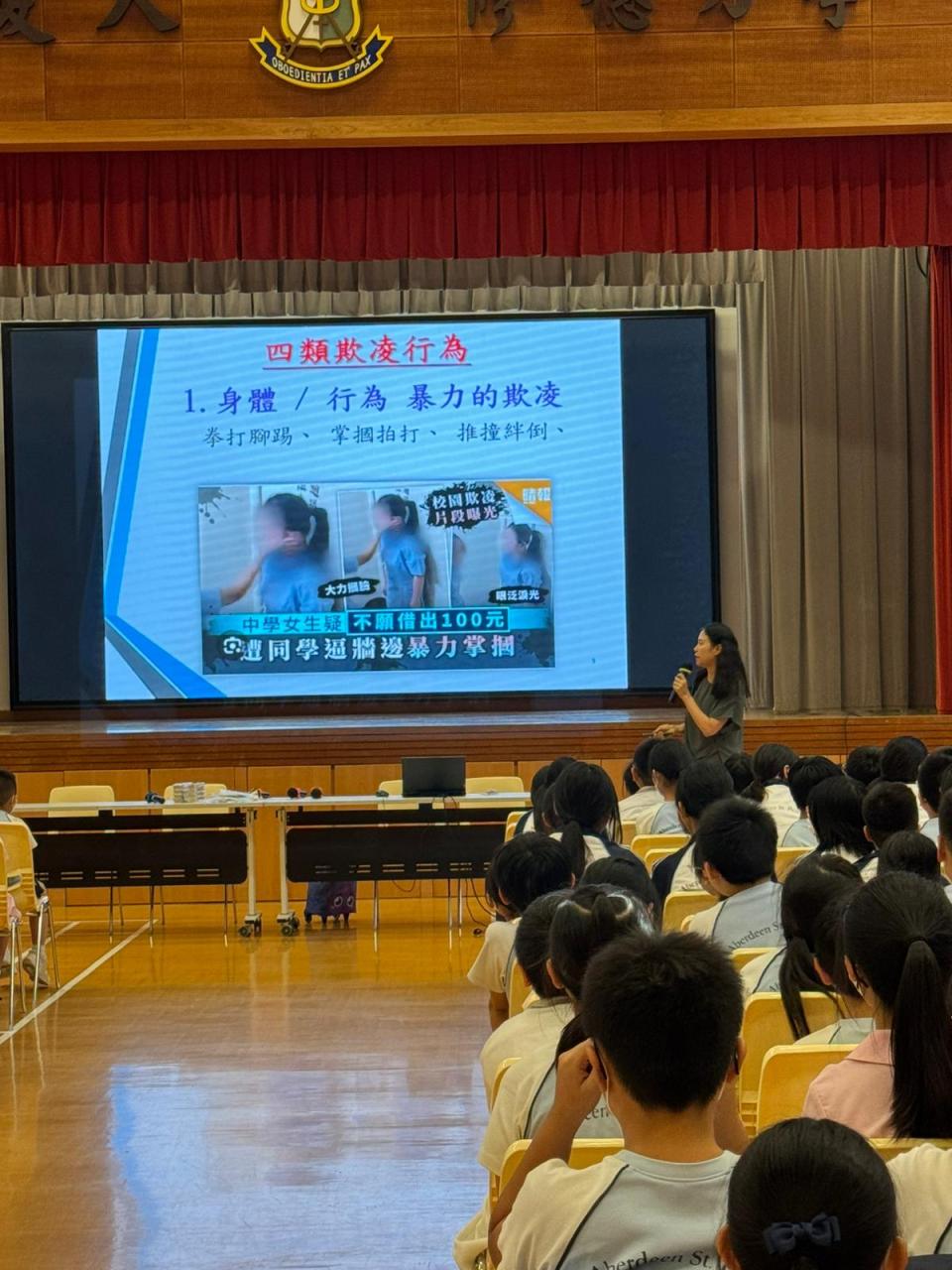 由香港警務處西區警區警民關係組梁素筠警長主持的「認識欺凌」講座活動,讓學生認識欺凌,如何處理欺凌問題,培養學生正確價值觀。