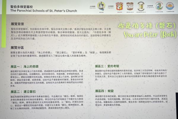 你是伯多祿(磐石)聯合視藝展已於六月二十四至二十七日,假香港大會堂展出聖伯多祿堂五間屬校的學生作品。本校學生均就四展區主題:海上的奇蹟、愛的考驗、建立磐石及蛻變,發揮無限創意,創作了不同媒體的平面及立體作品,予觀眾欣賞。