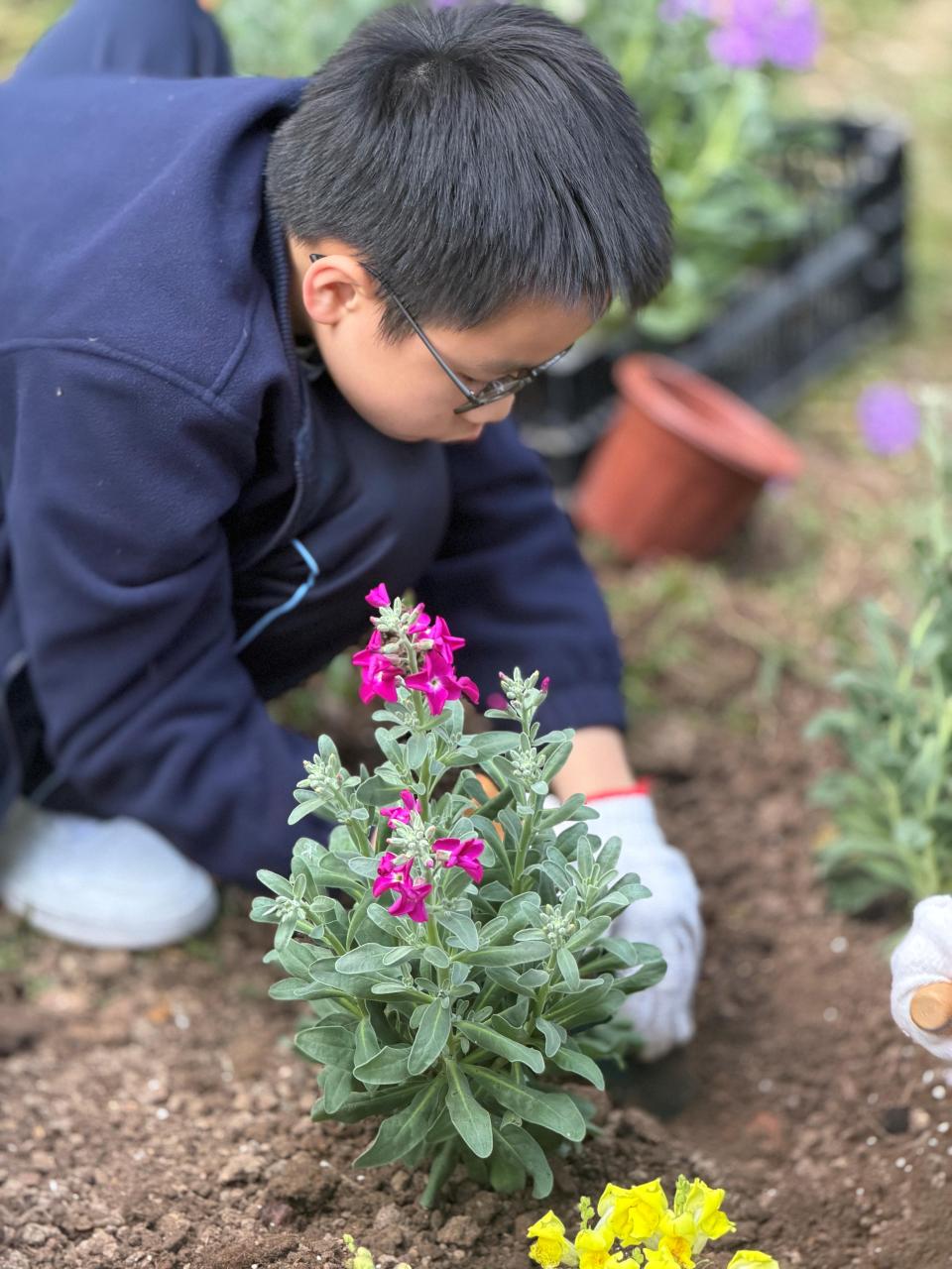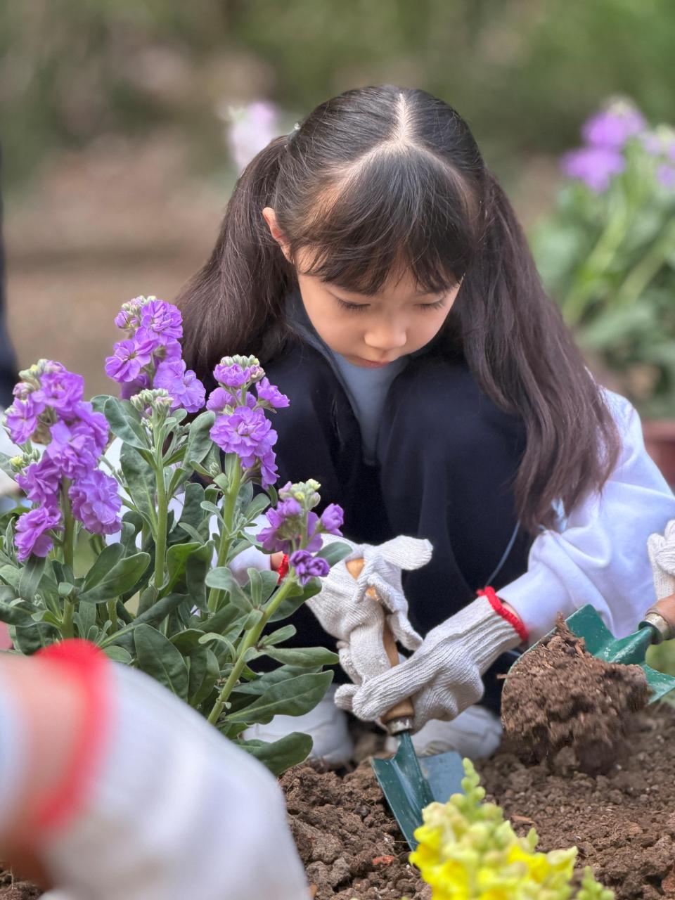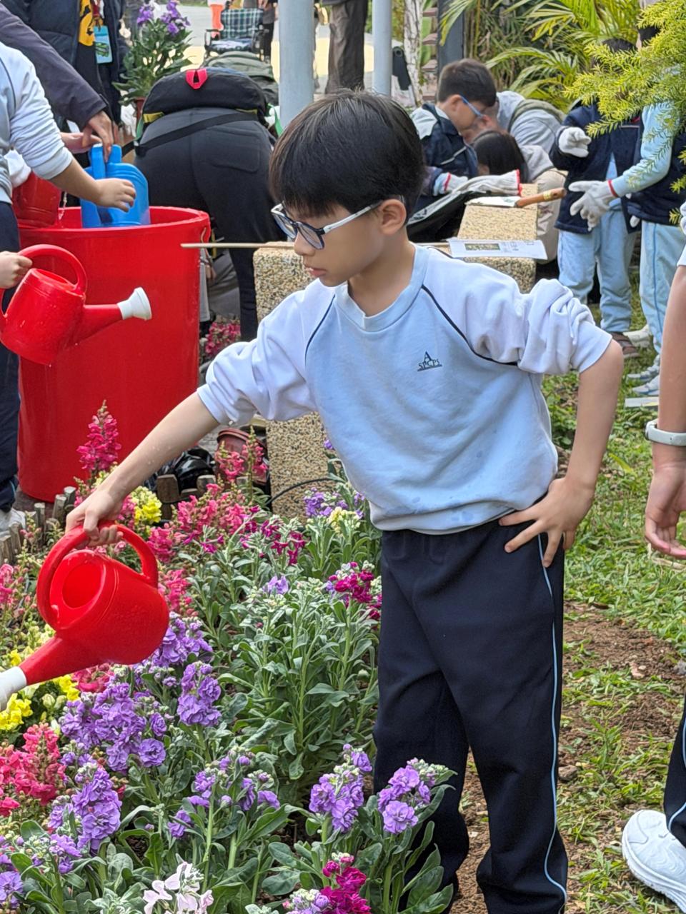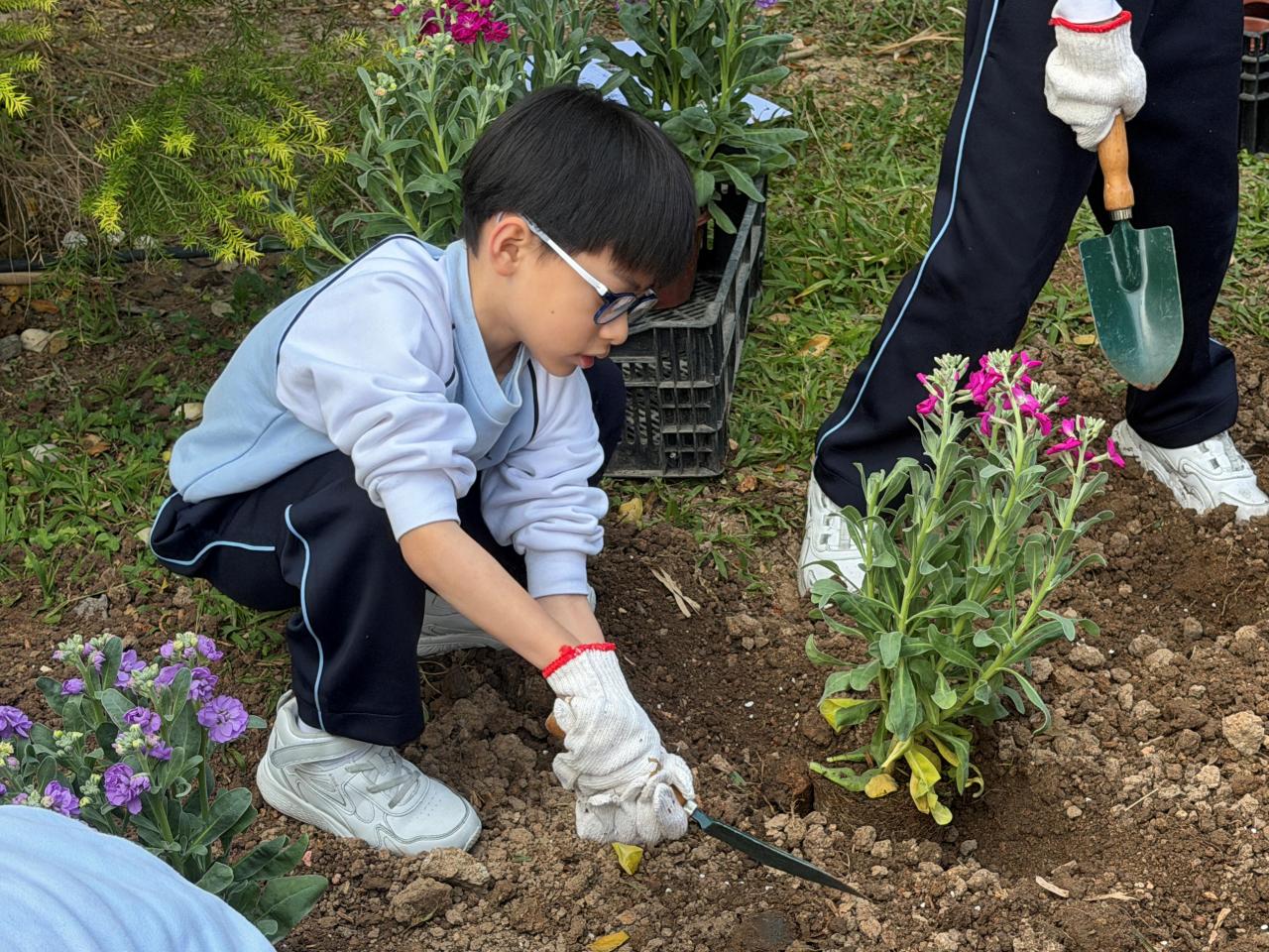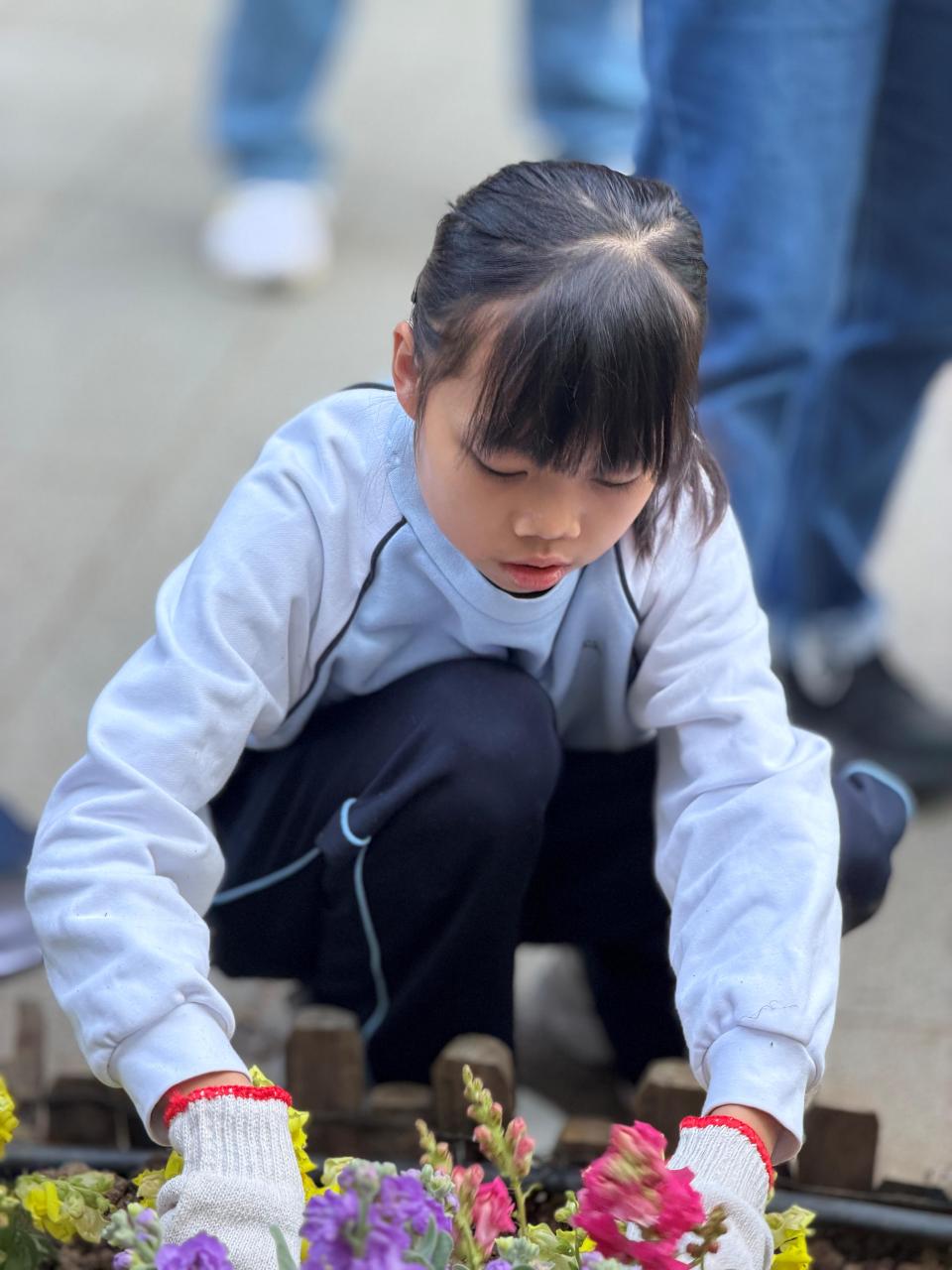 活動當日,低年級學生絲毫不遜於高年級的師兄師姐,每人都身體力行、專注投入。在家長的悉心指導下,同學們熟練操作種植工具,將紫羅蘭、小金魚草的花苗細心栽種於花圃中。從放苗、培土至澆水,每個步驟皆有板有眼,小小身軀盡顯對自然的珍視與責任感。