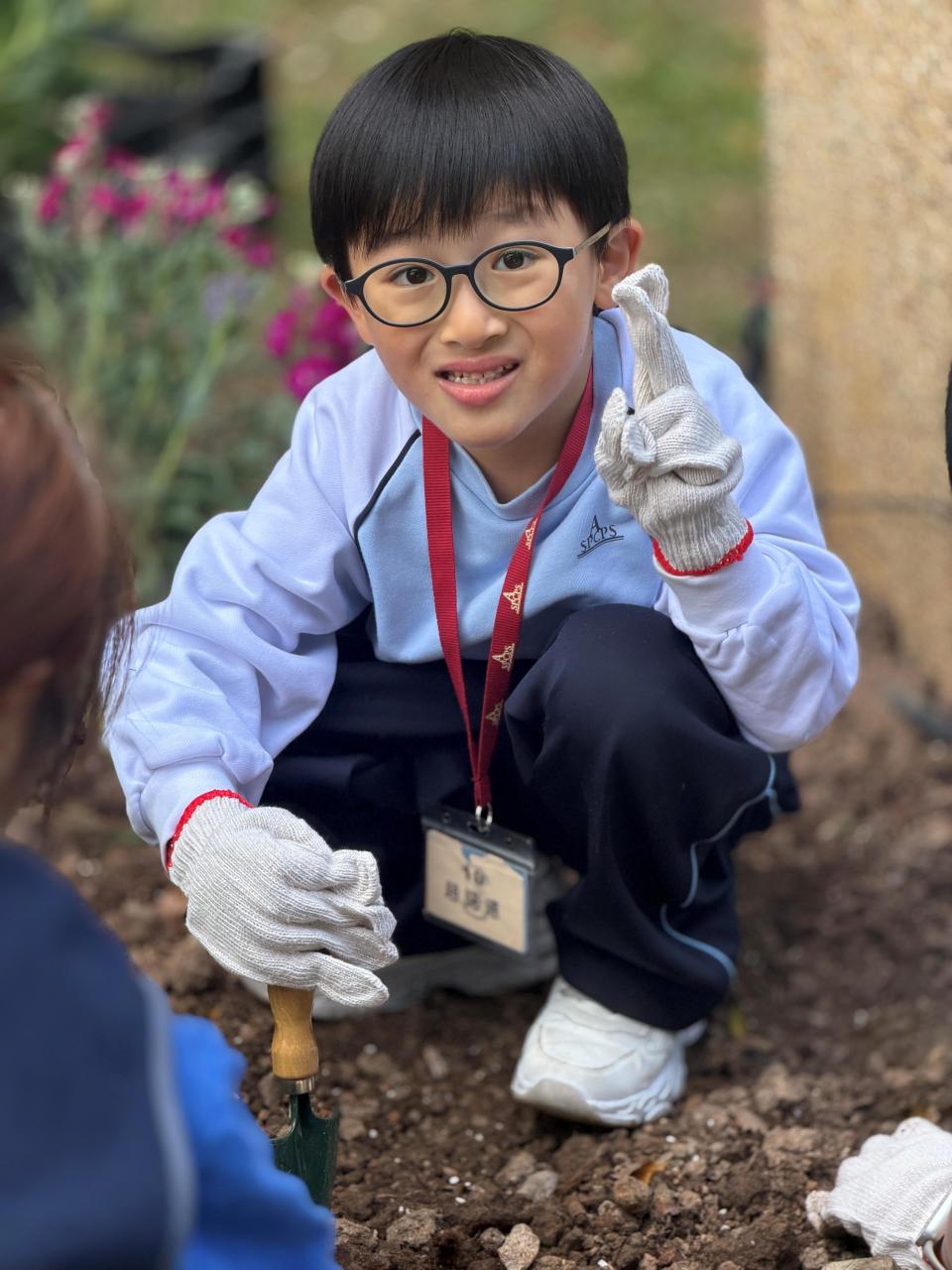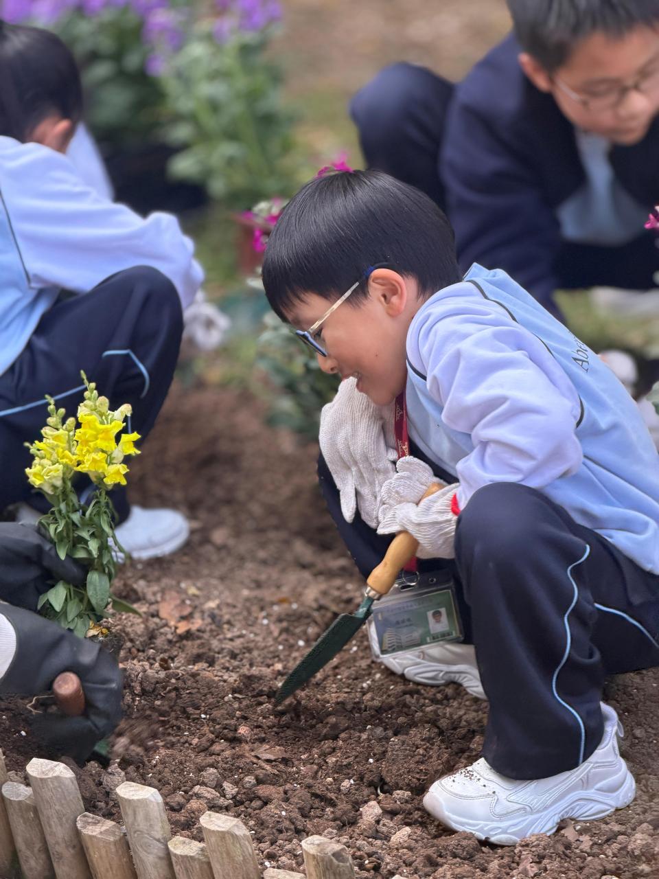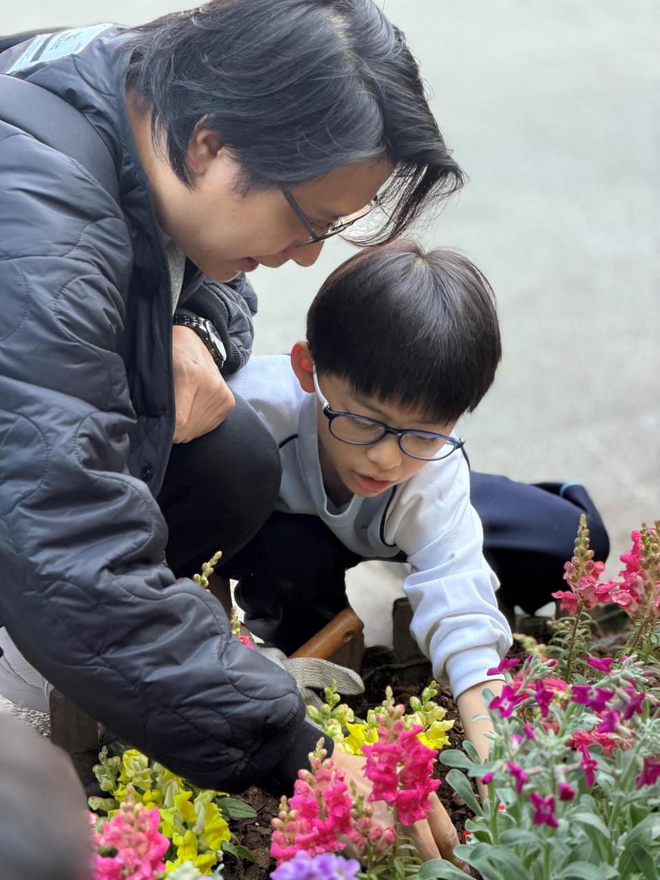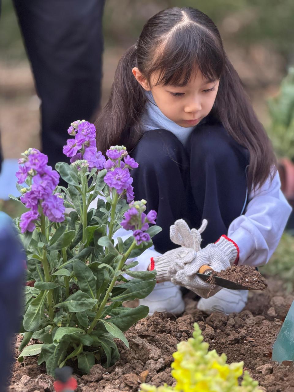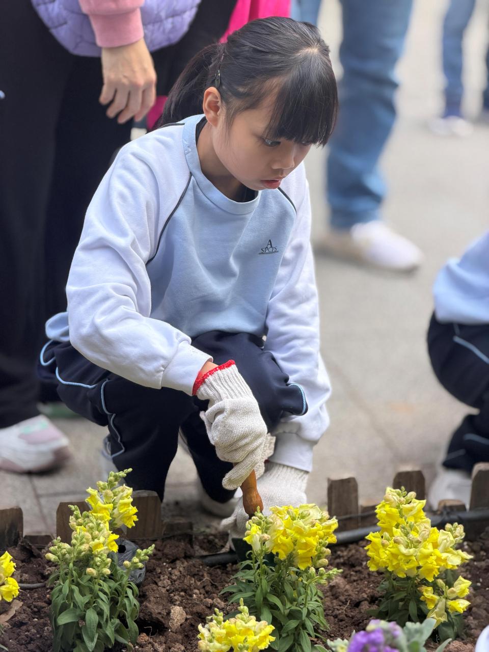 活動當日,低年級學生絲毫不遜於高年級的師兄師姐,每人都身體力行、專注投入。在家長的悉心指導下,同學們熟練操作種植工具,將紫羅蘭、小金魚草的花苗細心栽種於花圃中。從放苗、培土至澆水,每個步驟皆有板有眼,小小身軀盡顯對自然的珍視與責任感。