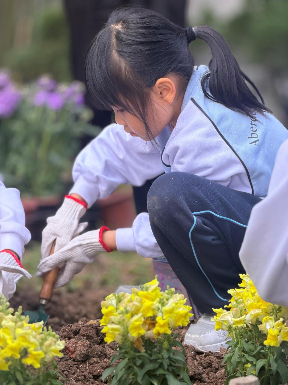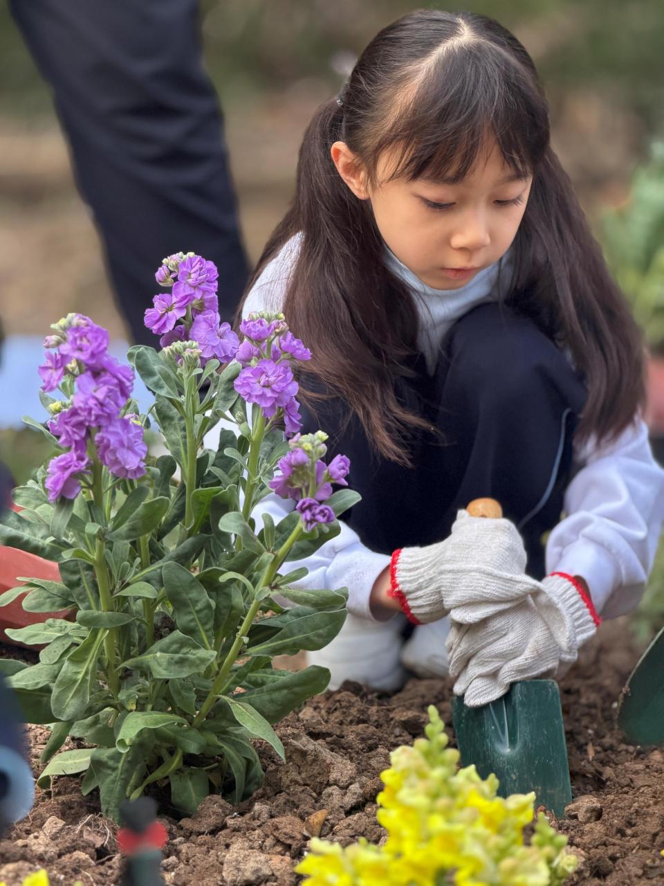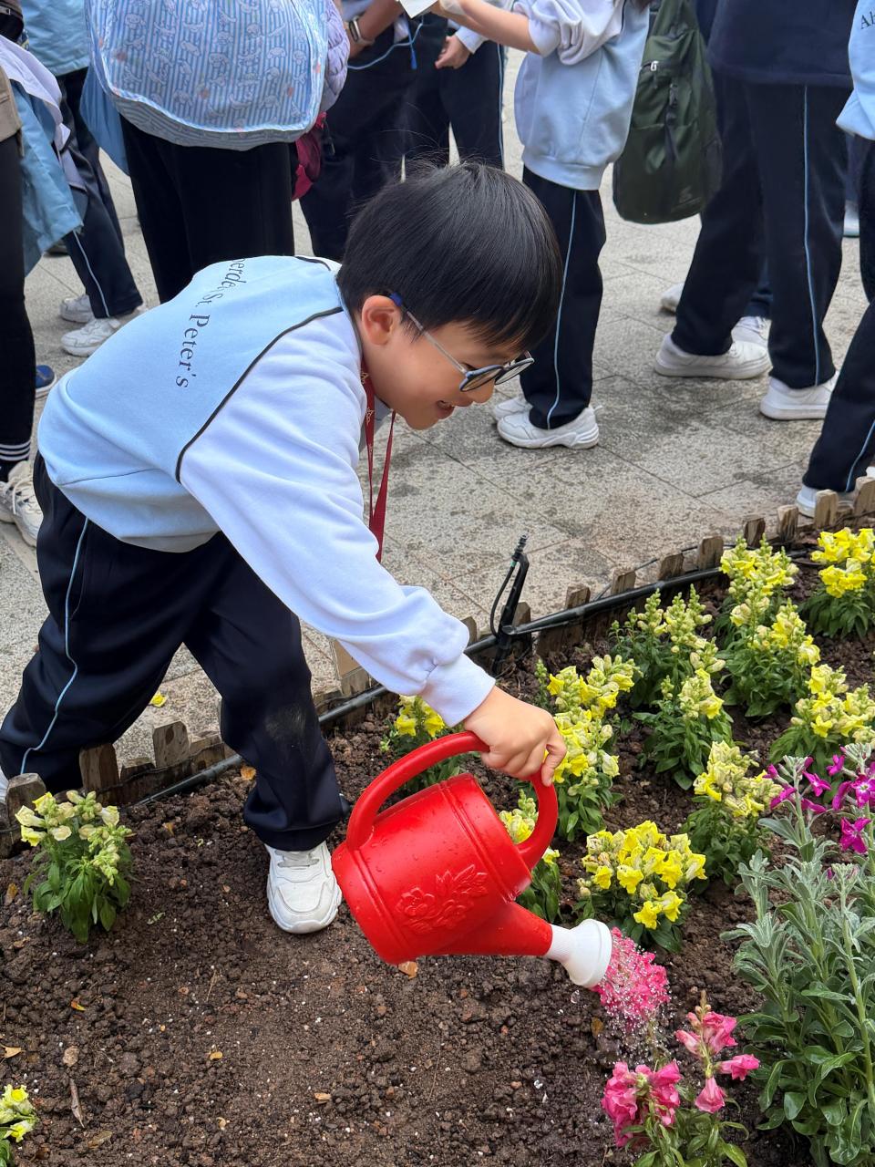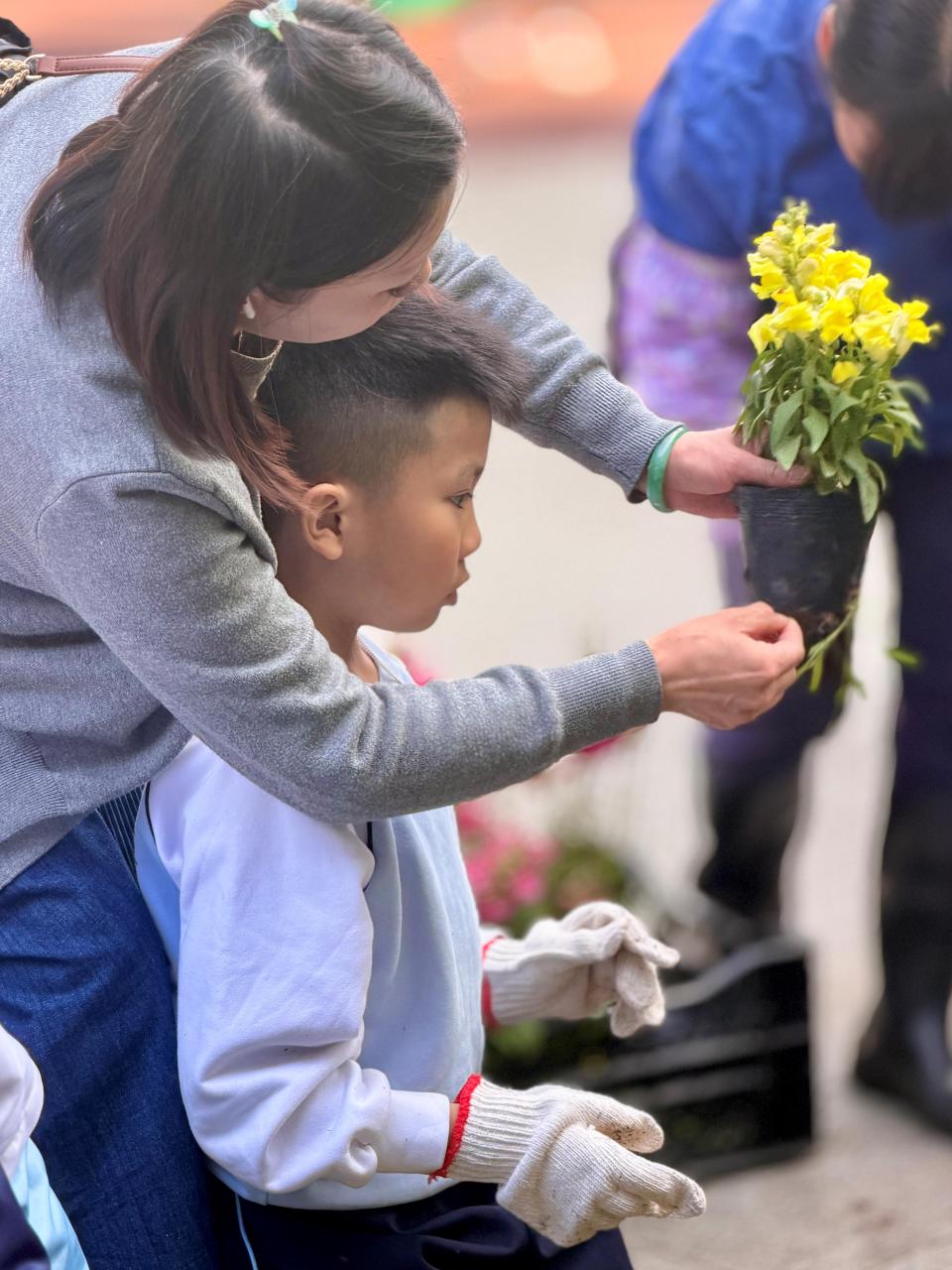 活動當日,低年級學生絲毫不遜於高年級的師兄師姐,每人都身體力行、專注投入。在家長的悉心指導下,同學們熟練操作種植工具,將紫羅蘭、小金魚草的花苗細心栽種於花圃中。從放苗、培土至澆水,每個步驟皆有板有眼,小小身軀盡顯對自然的珍視與責任感。