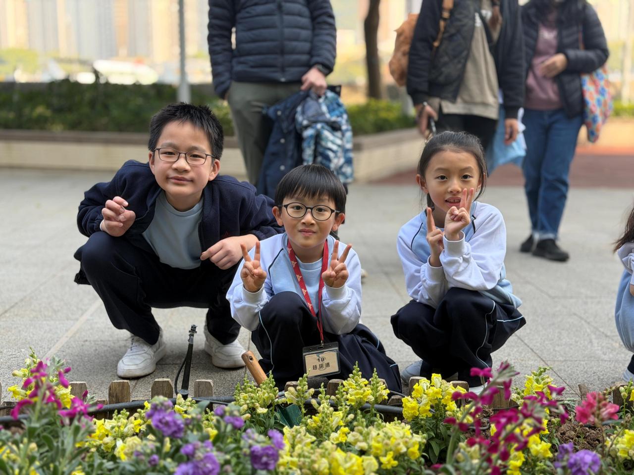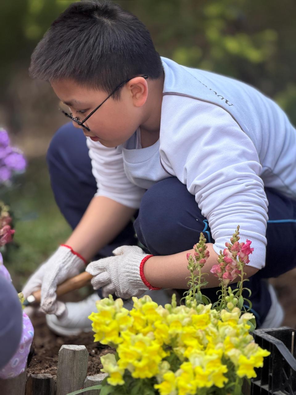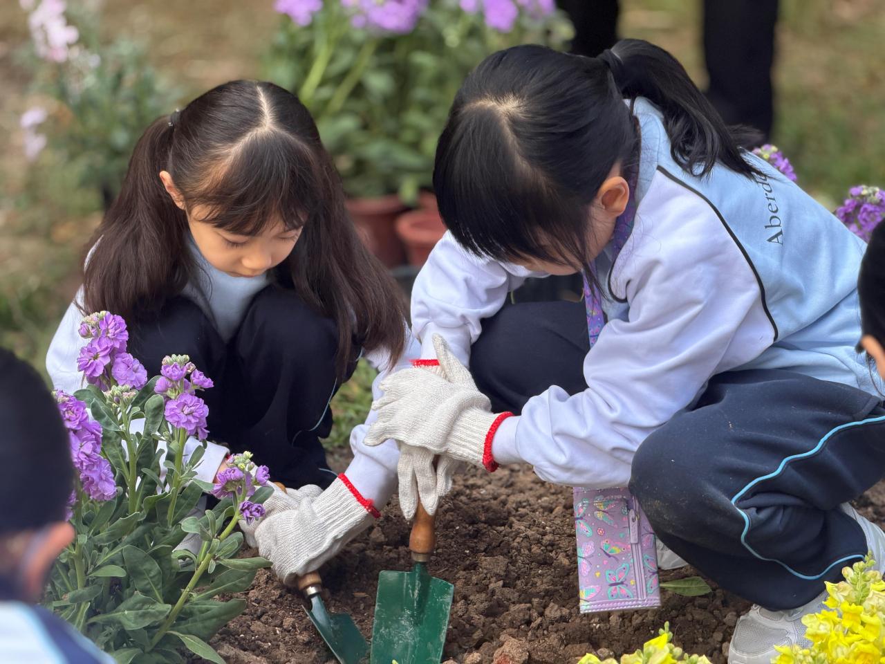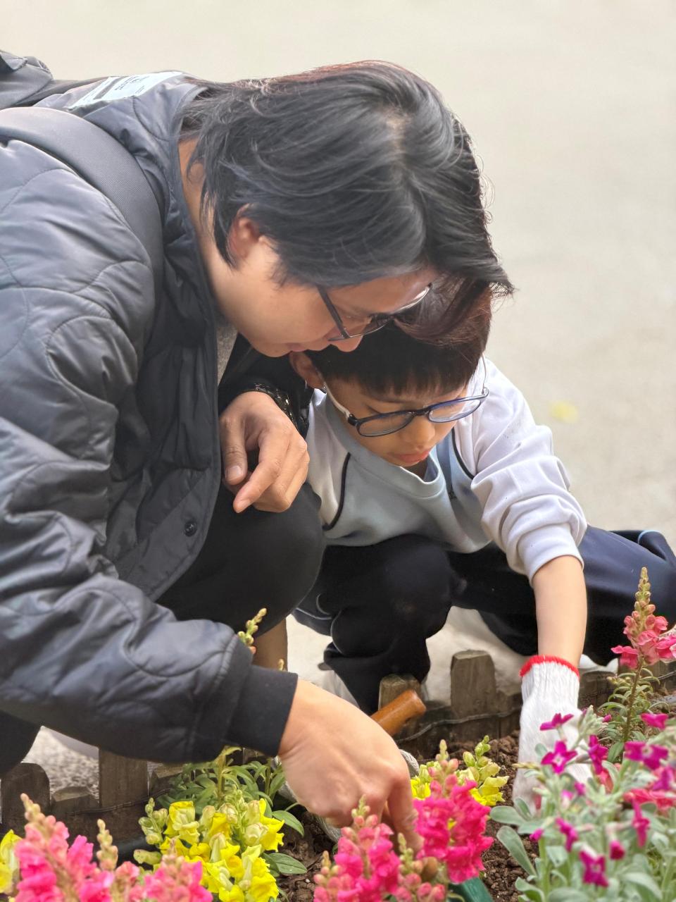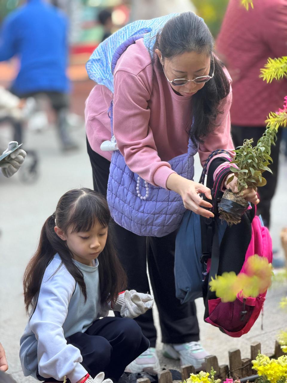 活動當日,低年級學生絲毫不遜於高年級的師兄師姐,每人都身體力行、專注投入。在家長的悉心指導下,同學們熟練操作種植工具,將紫羅蘭、小金魚草的花苗細心栽種於花圃中。從放苗、培土至澆水,每個步驟皆有板有眼,小小身軀盡顯對自然的珍視與責任感。