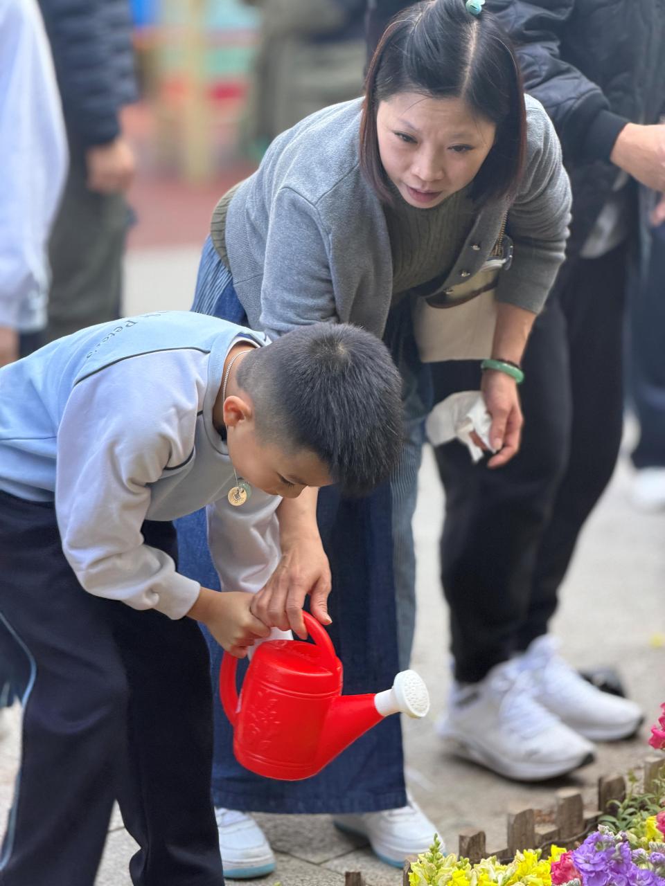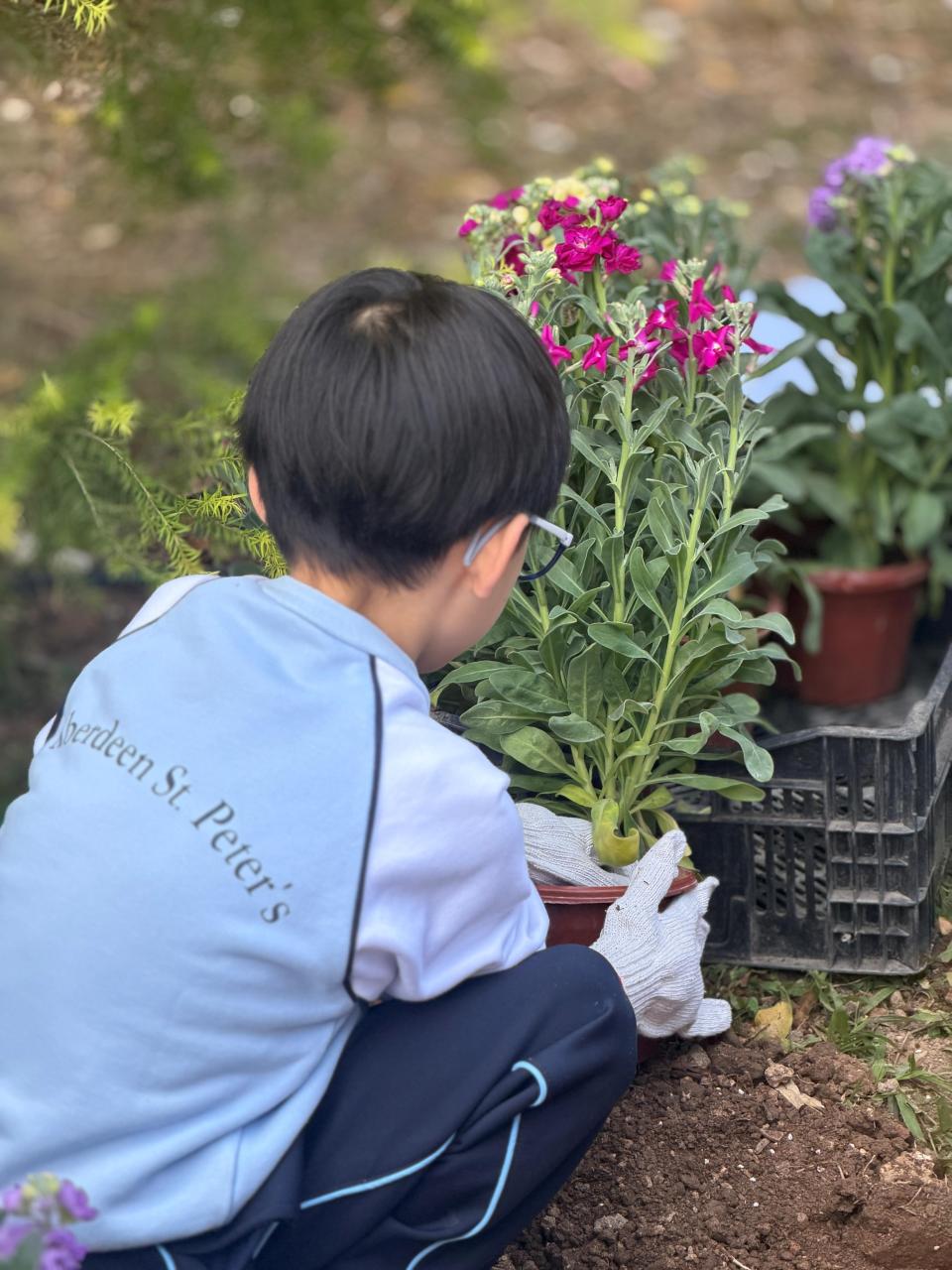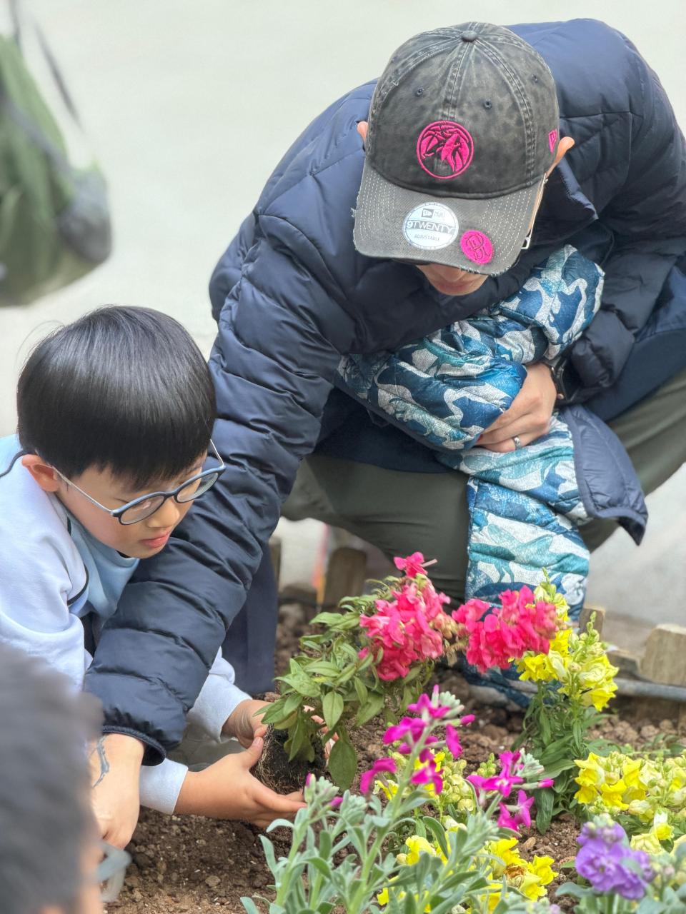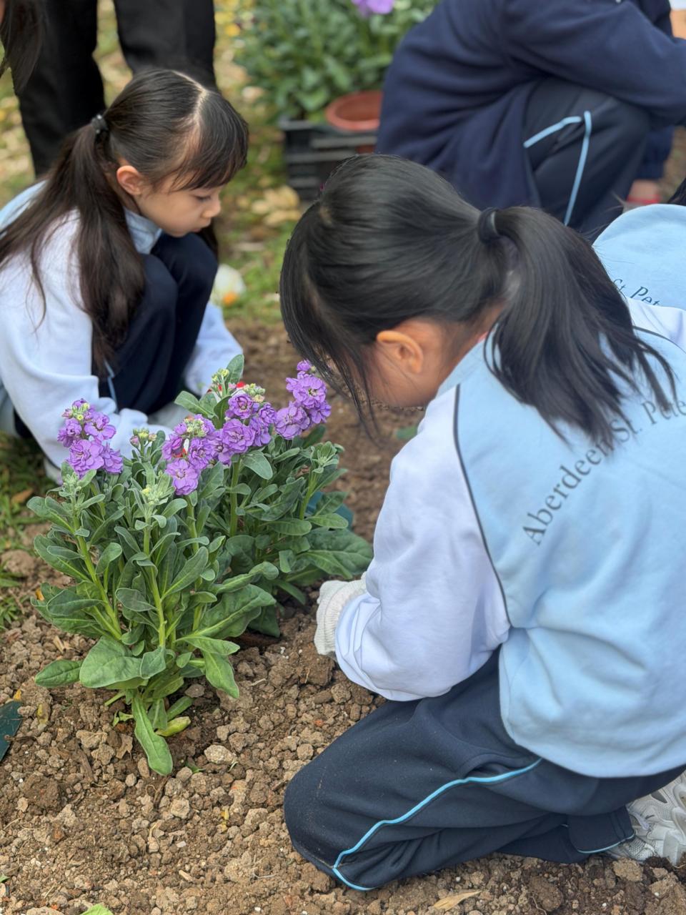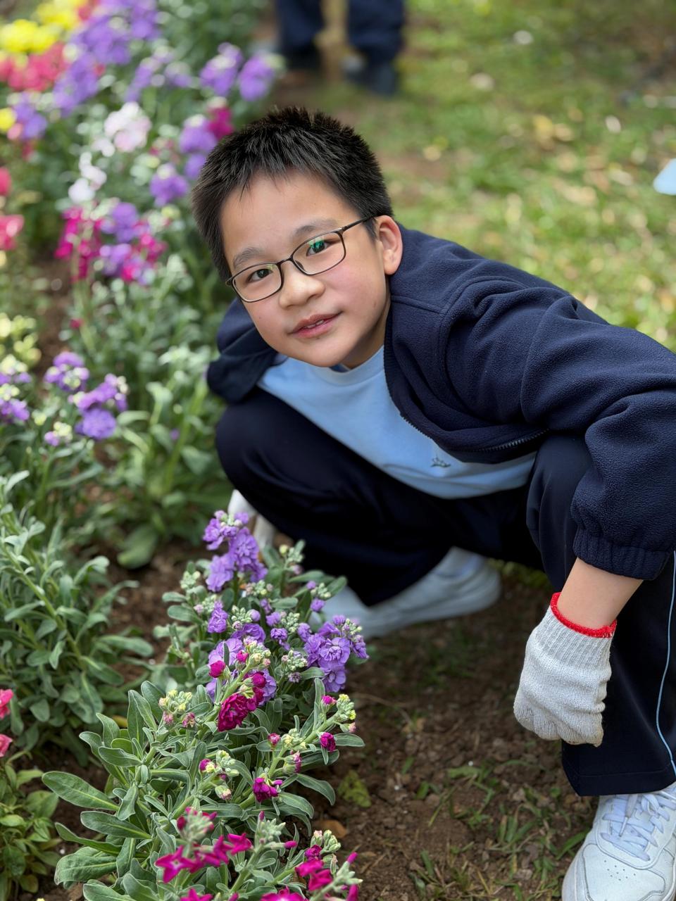 活動當日,低年級學生絲毫不遜於高年級的師兄師姐,每人都身體力行、專注投入。在家長的悉心指導下,同學們熟練操作種植工具,將紫羅蘭、小金魚草的花苗細心栽種於花圃中。從放苗、培土至澆水,每個步驟皆有板有眼,小小身軀盡顯對自然的珍視與責任感。
