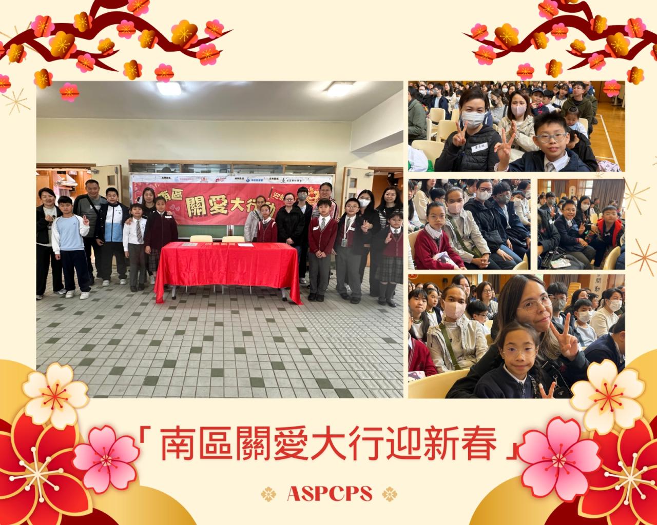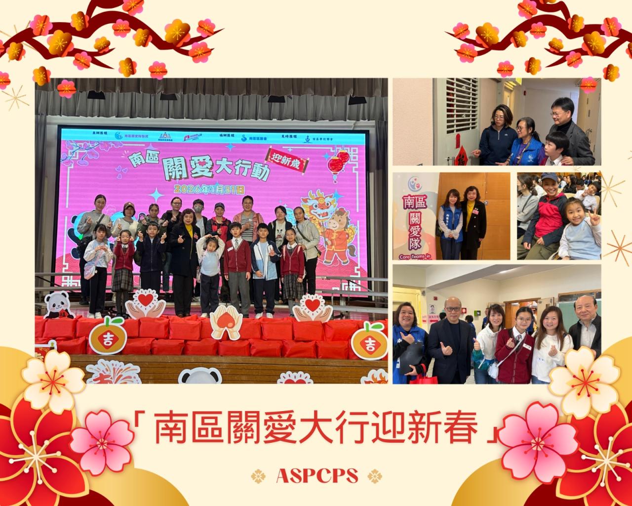31/01/2026(六),南區民政事務處南區民政事務專員張佩珊女士, JP、中聯辦港島工作部宣教處副處長黃鵬舉先生、全國人大代表朱立威先生, MH、全國政協委員周厚立先生, MH, JP、香港南區各界聯會理事長陳南坡先生, SBS, JP、立法會議員陳學鋒先生, MH, JP、南區關愛隊聯席召集人彭兆基先生以及南區學校聯會主席侯麗珊校長蒞臨本校,和我們學校的親子義工一同出席「南區關愛大行動迎新歲」活動。