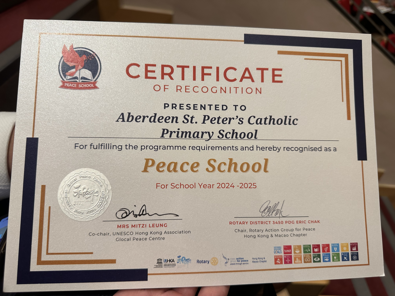 長期以來,我們秉持「敬主愛人 修德力學」的校訓,傳揚福音、締造和平,努力擔任和平使者。和平學校計劃旨在緊密聯繫各學校,攜手邁向共同目標,培育積極心態,在青年心中深植和平理念,我校也一直為此積極踐行。