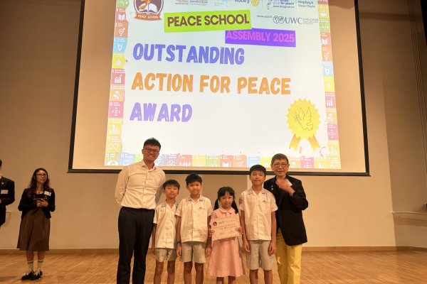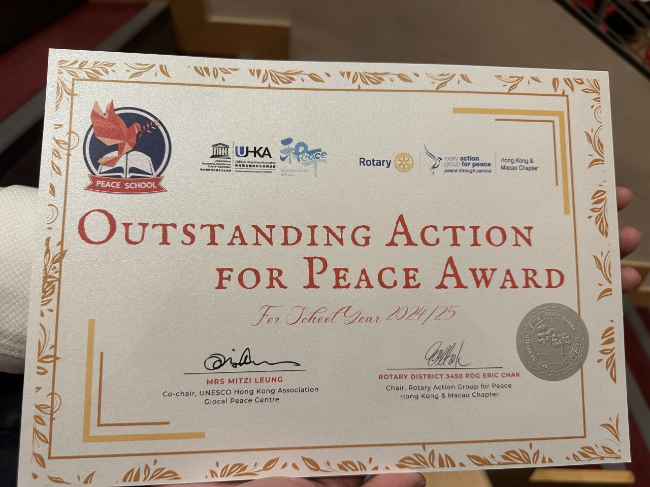 和平學校高峰會 和平學校高峰會上,本校載譽而歸!13/09/2025(六),已成功獲得和平學校計劃的認證,並且獲邀在峰會分享經驗。6A 胡淦泓、4E 譚泓晞、2C 王嘉莉三位同學的精彩分享,經公眾投票,為學校贏得「Outstanding Action For Peace Award」榮譽!