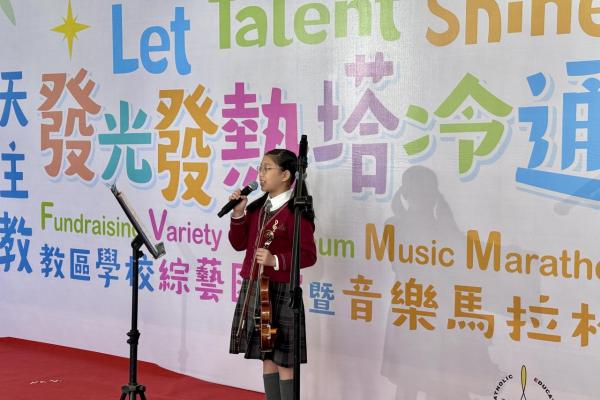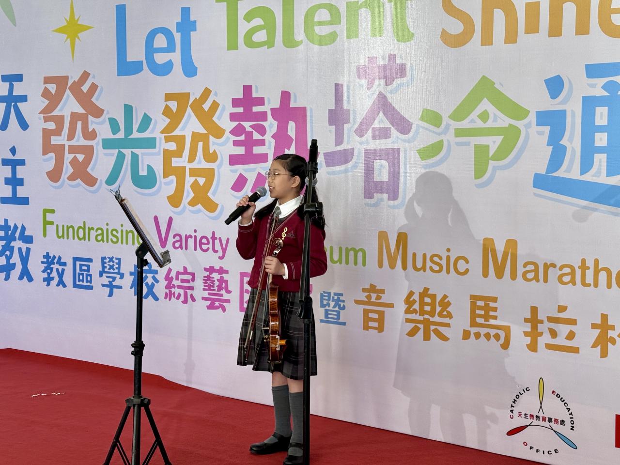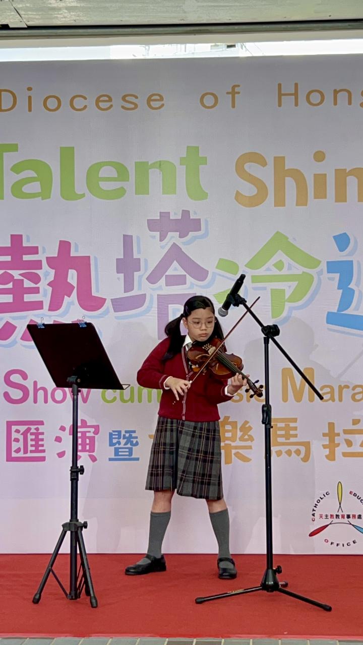 本校5A班莊楚翹同學於三月二十二日參加「天主教教區學校綜藝匯演暨音樂馬拉松籌款」活動,以小提琴獨奏形式演出。演奏曲目為小提琴曲 'Allegro Second movement from Sonata in F, Op.1 No.12, HWV370'。她的演出技藝精湛,表現自信。