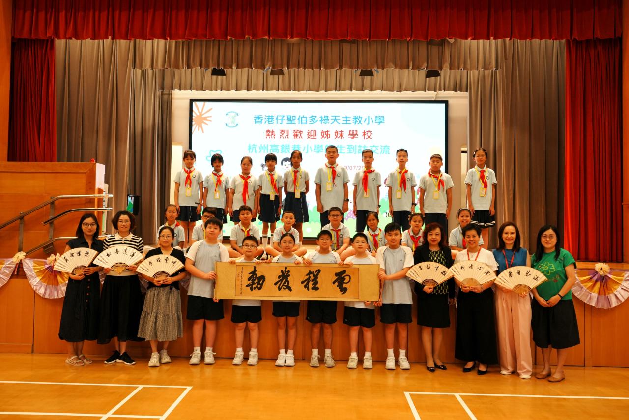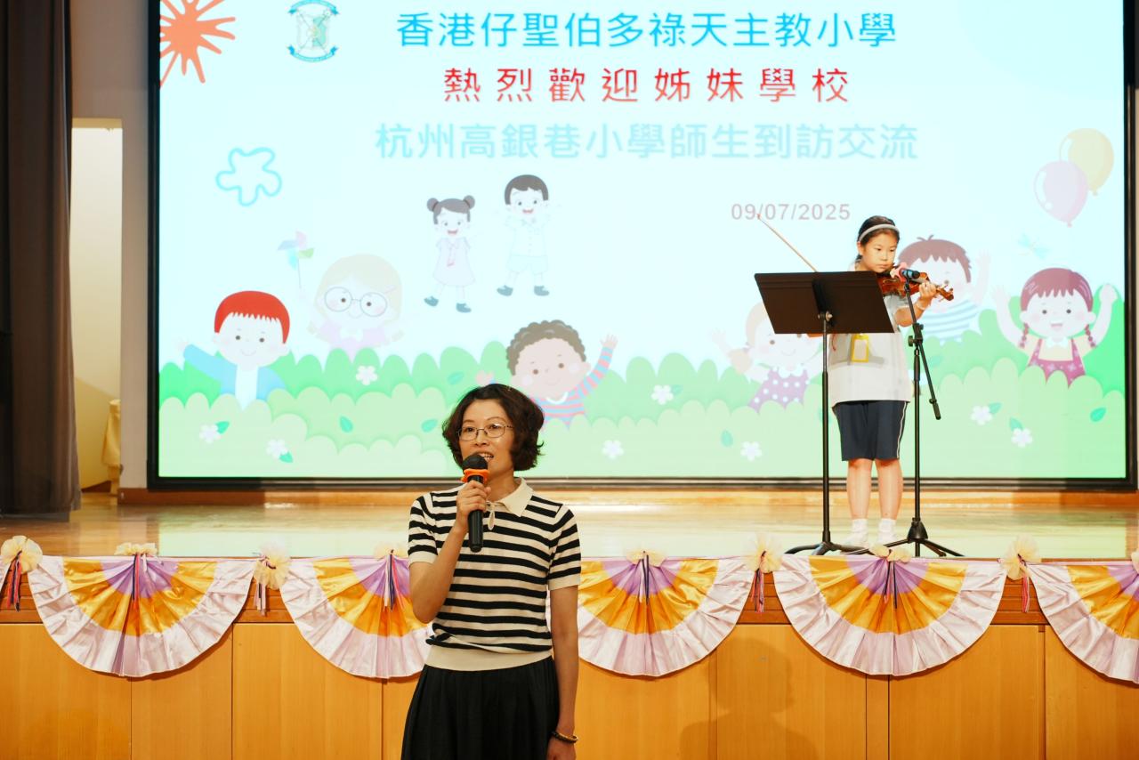09-07-2025(三),杭州市高銀巷小學師生蒞臨本校。賓客們參觀校舍,與本校學生一起上課,與學生一起互動,還欣賞了精彩的英語話劇,氣氛熱烈融洽,參觀尾聲,杭州同學更表演🎻,為兩校交流添上了生動的一曲。
