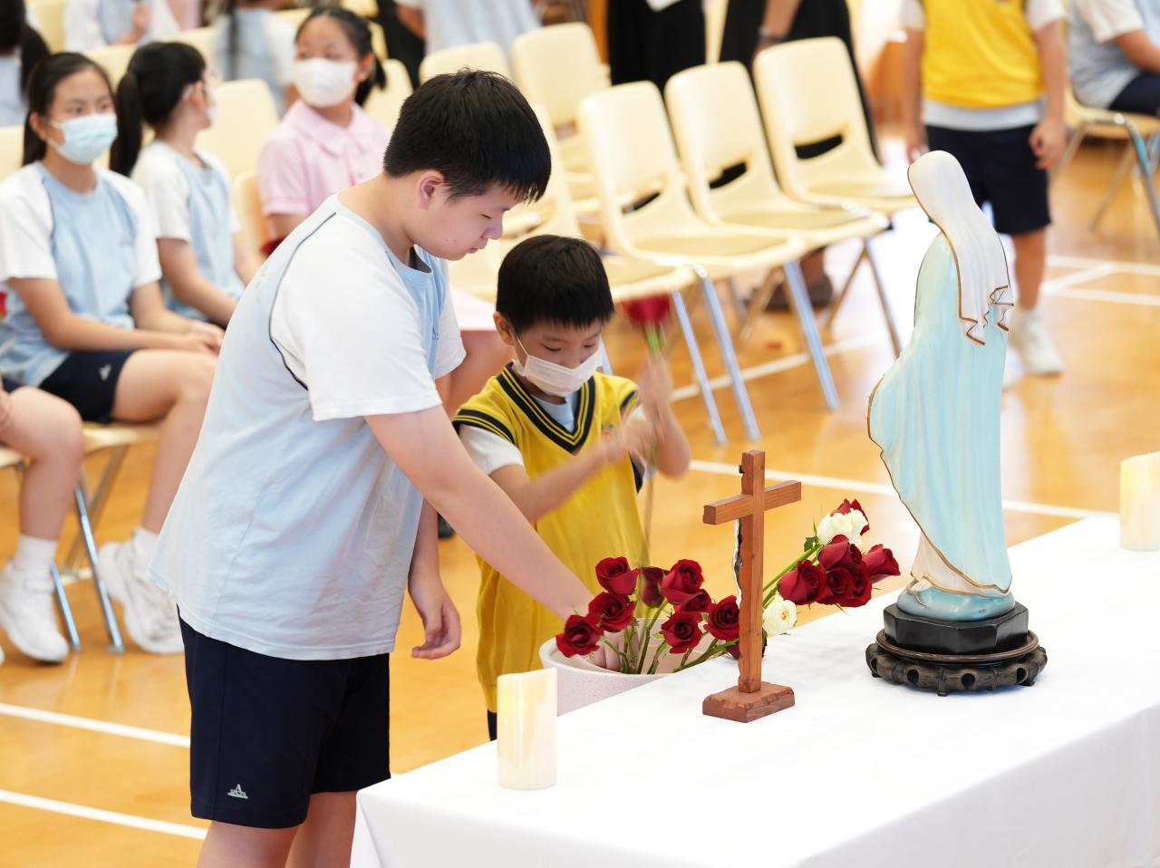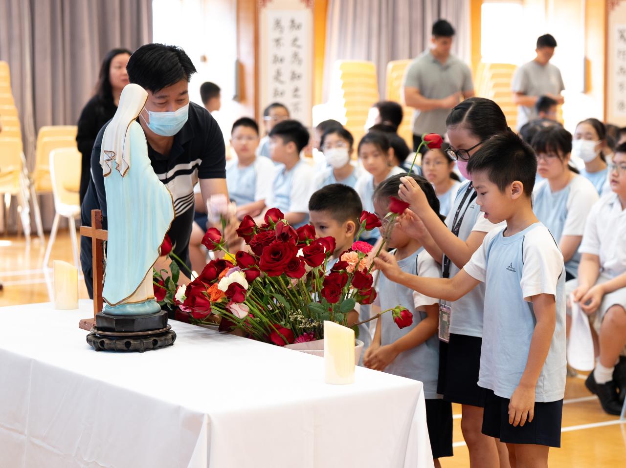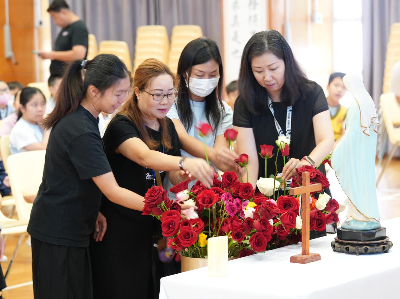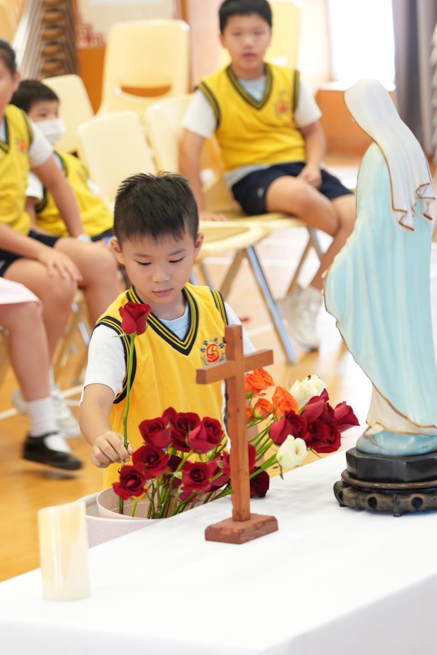 10/10/2025(五)本校舉行玫瑰月敬禮聖母禮儀。禮儀中,校長、老師、同學和家長向聖母獻上玫瑰花以表敬意。