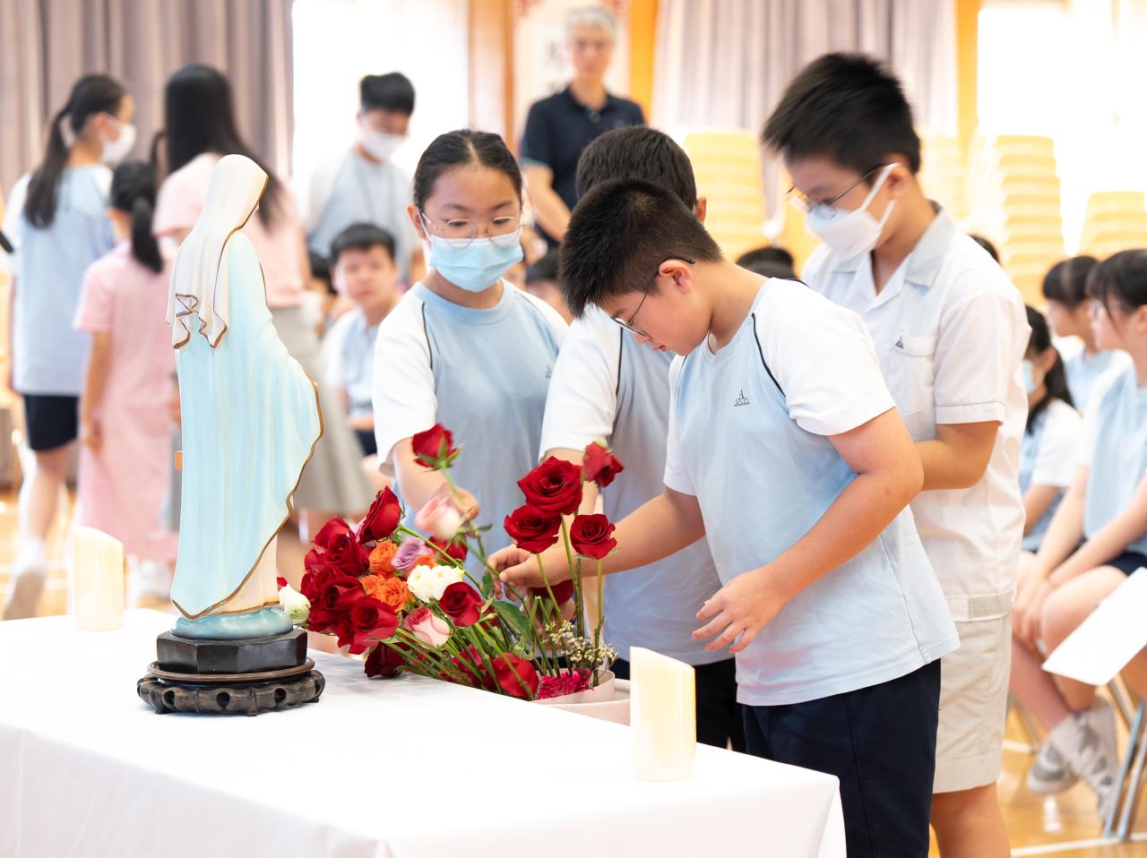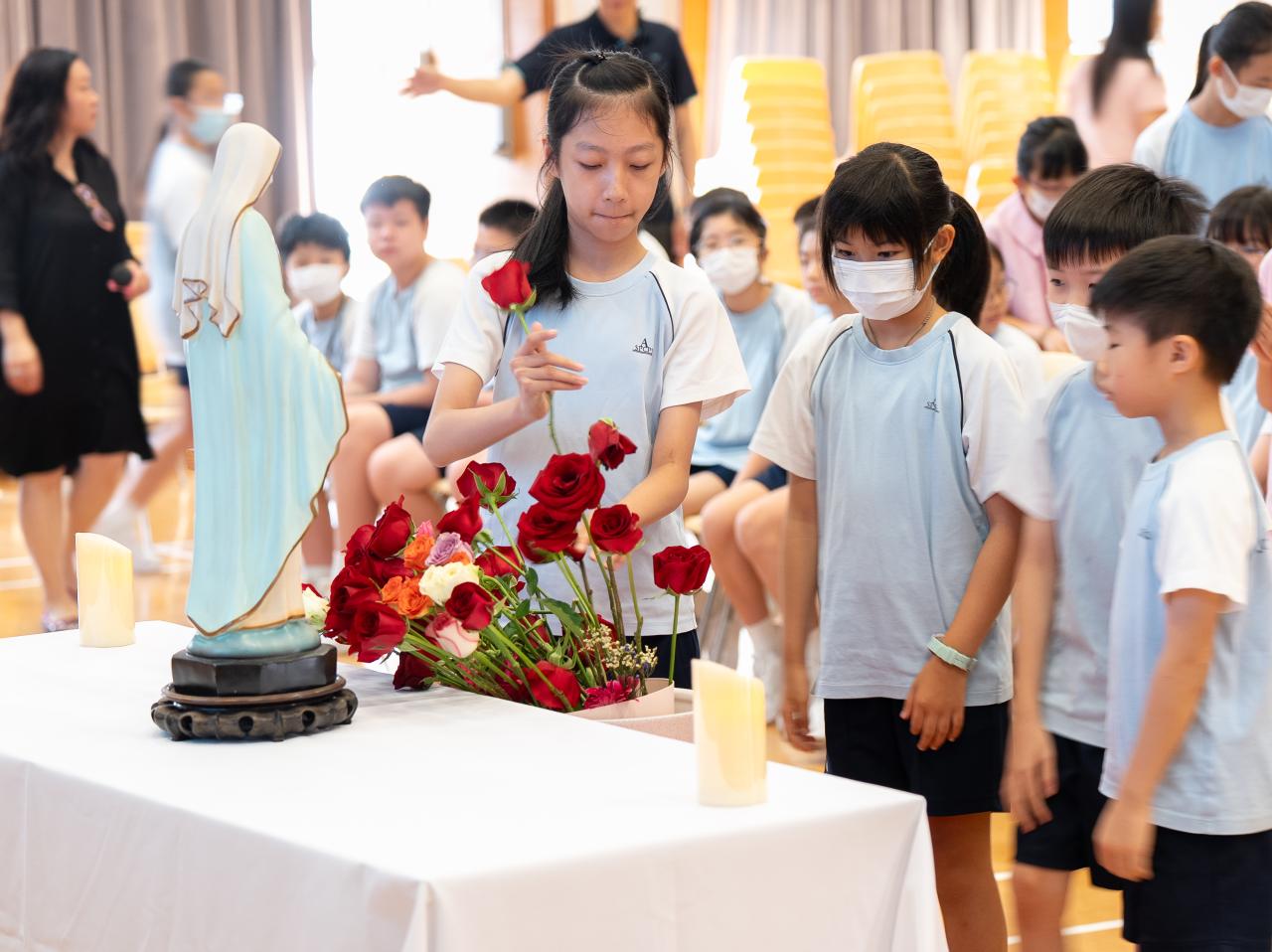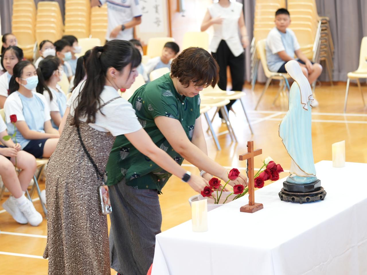 10/10/2025(五)本校舉行玫瑰月敬禮聖母禮儀。禮儀中,校長、老師、同學和家長向聖母獻上玫瑰花以表敬意。