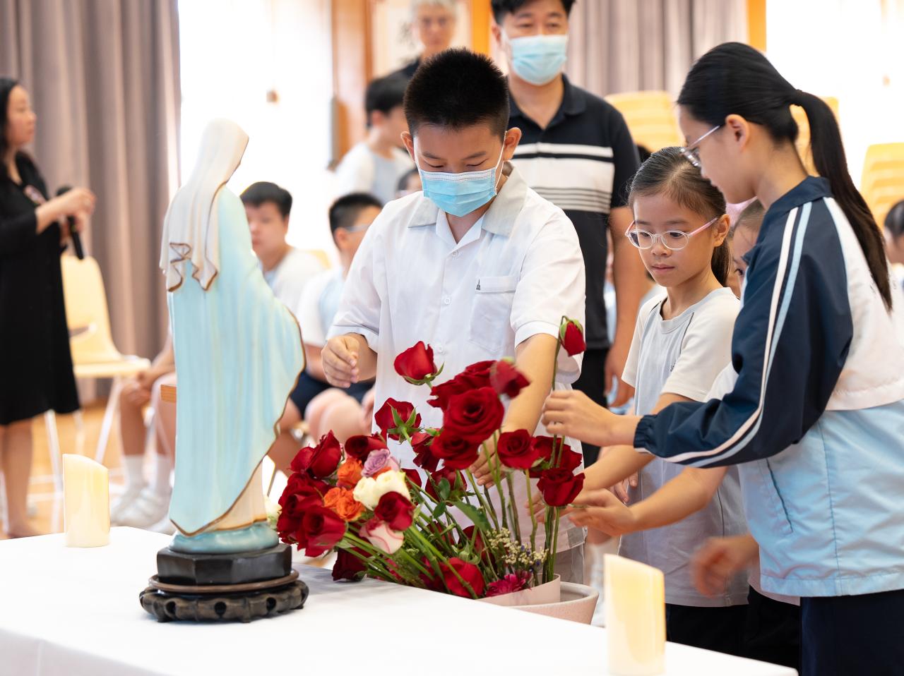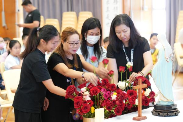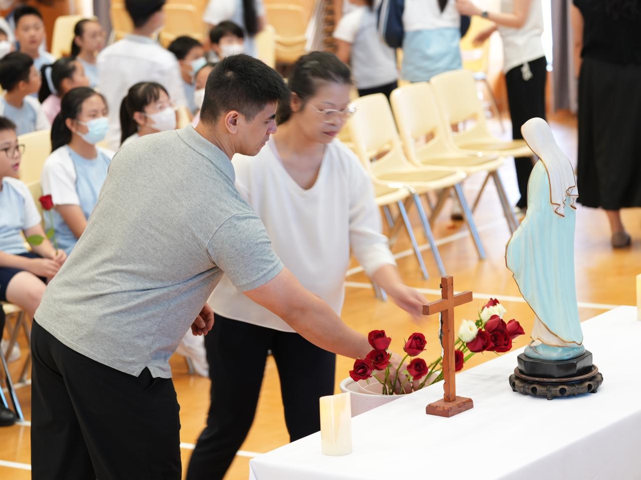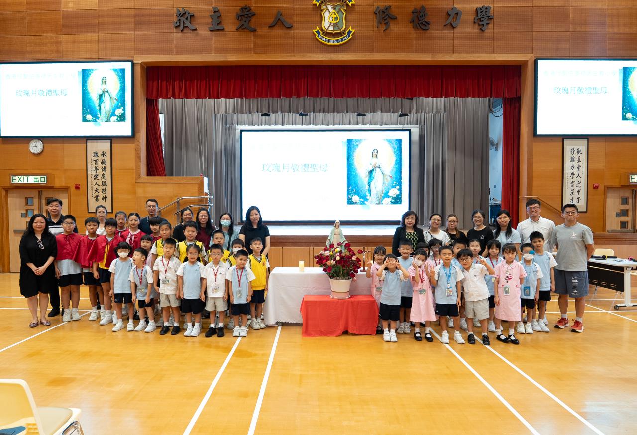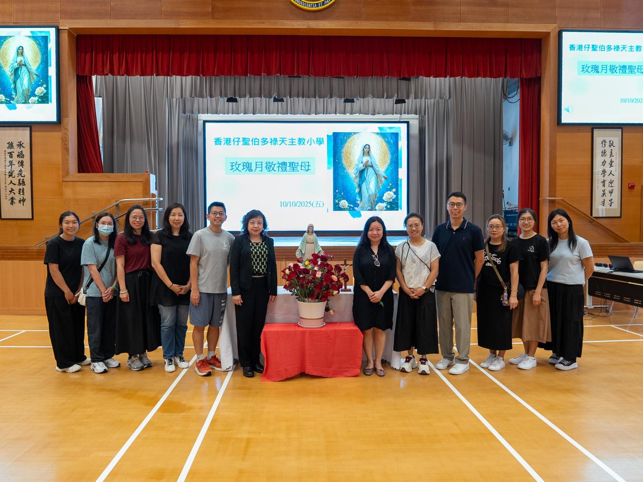 10/10/2025(五)本校舉行玫瑰月敬禮聖母禮儀。禮儀中,校長、老師、同學和家長向聖母獻上玫瑰花以表敬意。