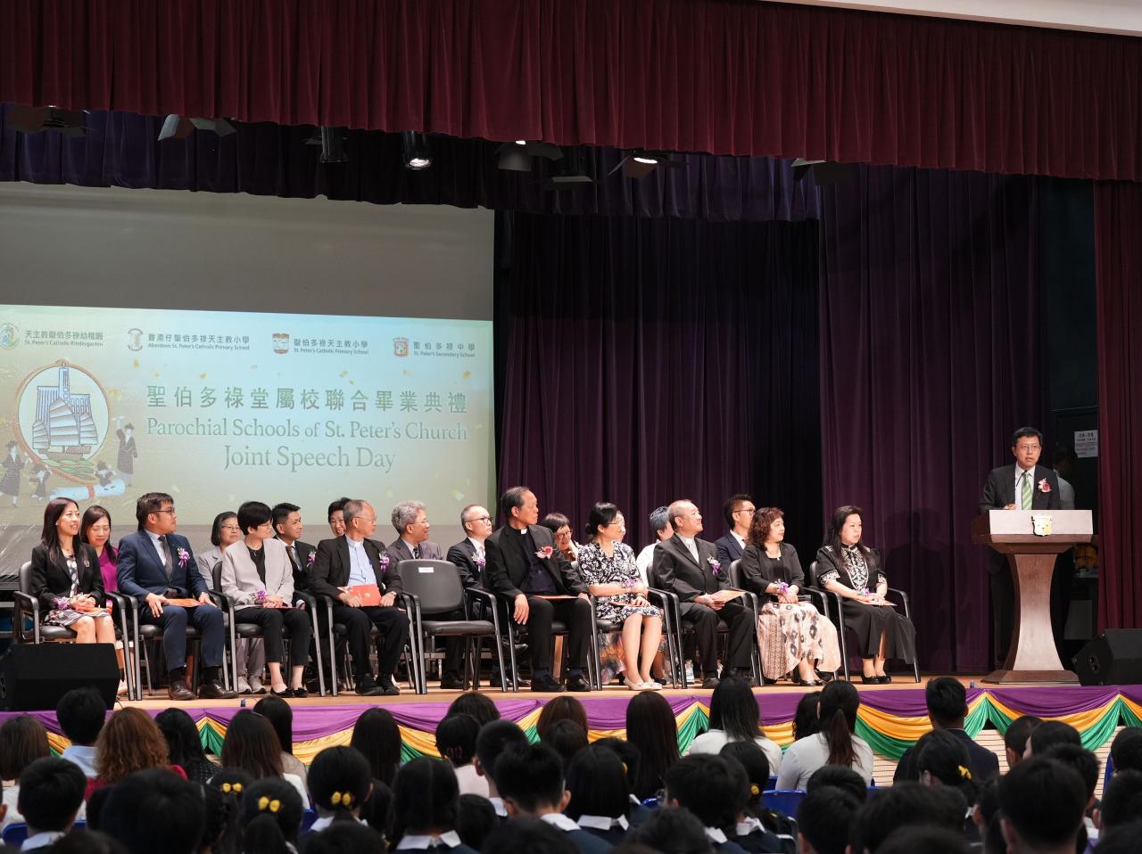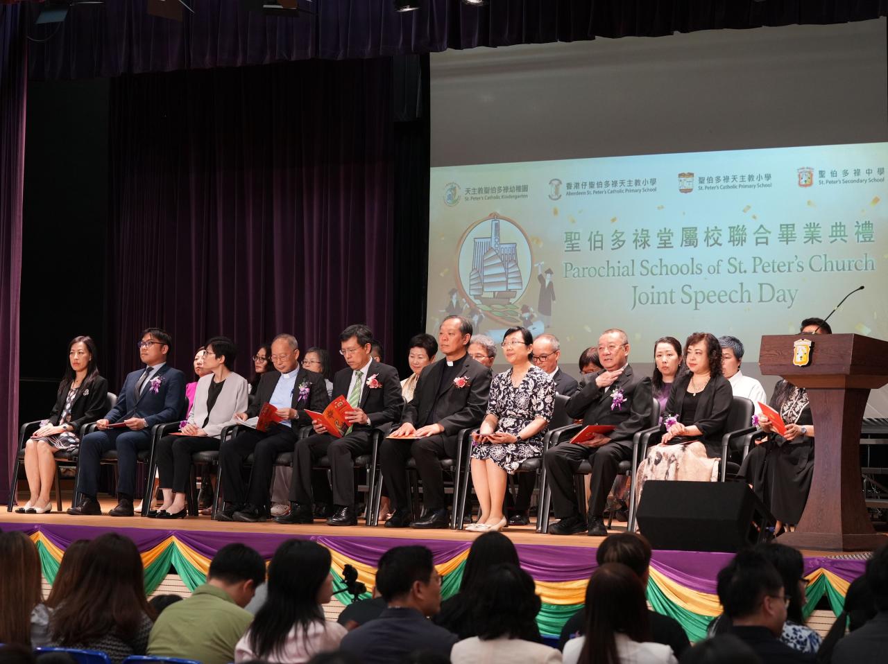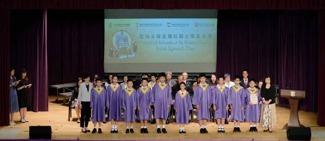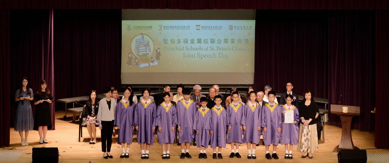 2024-2025聖伯多祿堂屬校(聖伯多祿中學、聖伯多祿天主教小學、天主教聖伯多祿幼稚園及本校)聯合畢業典禮已於23/05/2025(五)假聖伯多祿中學禮堂順利舉行。當日出席的嘉賓眾多,包括主禮嘉賓民政事務總署民政事務專員區家盛太平紳士、天主教香港教區陳永超副主教、天主教聖伯多祿幼稚園校董陳德雄神父、本校校監伍國寶神父及各校校董等人,場面既莊嚴又熱鬧。於授憑及頒發獎狀後,四校的畢業生代表演說致謝辭,向一眾校監、校董、校長、老師及家長表示謝意。除此之外,本校更有花式跳繩表演,而聖伯多祿天主教小學學生則表演中國舞、聖伯多祿中學學生表演敲擊樂及天主教聖伯多祿幼稚園學生也有舞蹈表演。最後,聯合畢業典禮在薪火相傳及祝福禮下圓滿結束。