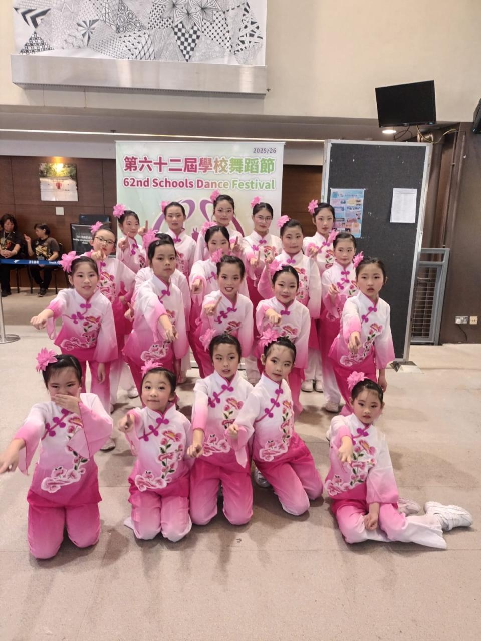 本校中國舞校隊於第六十二屆學校舞蹈節比賽中榮獲甲級獎。這次,隊員們身著漢族服飾,化身為活潑好動的女孩,舞動傳統的扇鼓,表演《扇鼓咚咚》,展現歡欣雀躍的心情,迎接幸福快樂的每一天。舞者動作剛柔並濟,節奏感強,舞台表現力極佳,展現精湛技藝與團隊默契,獲得評審與觀眾一致好評。本校感謝指導老師的細心栽培與家長義工的後勤支援。隊員們經過刻苦排練,充分展現本校藝術教育成果,期盼未來再攀高峰,繼續為校爭光。