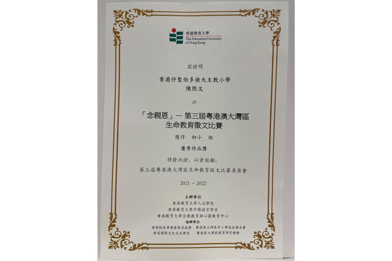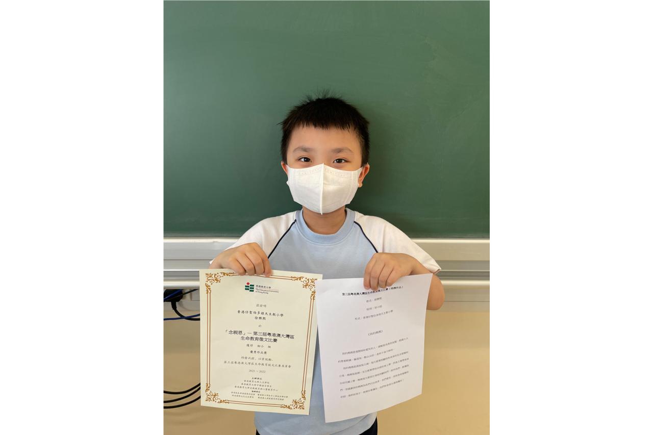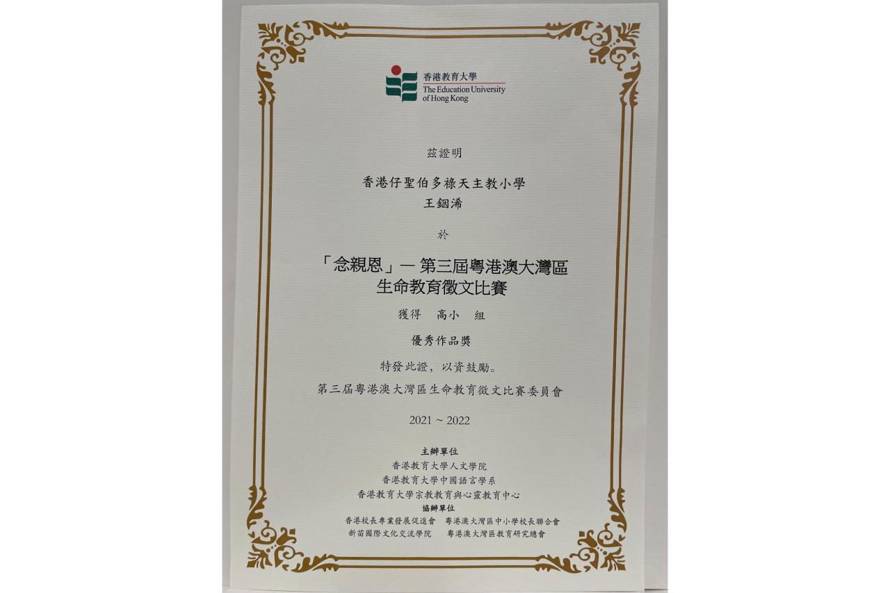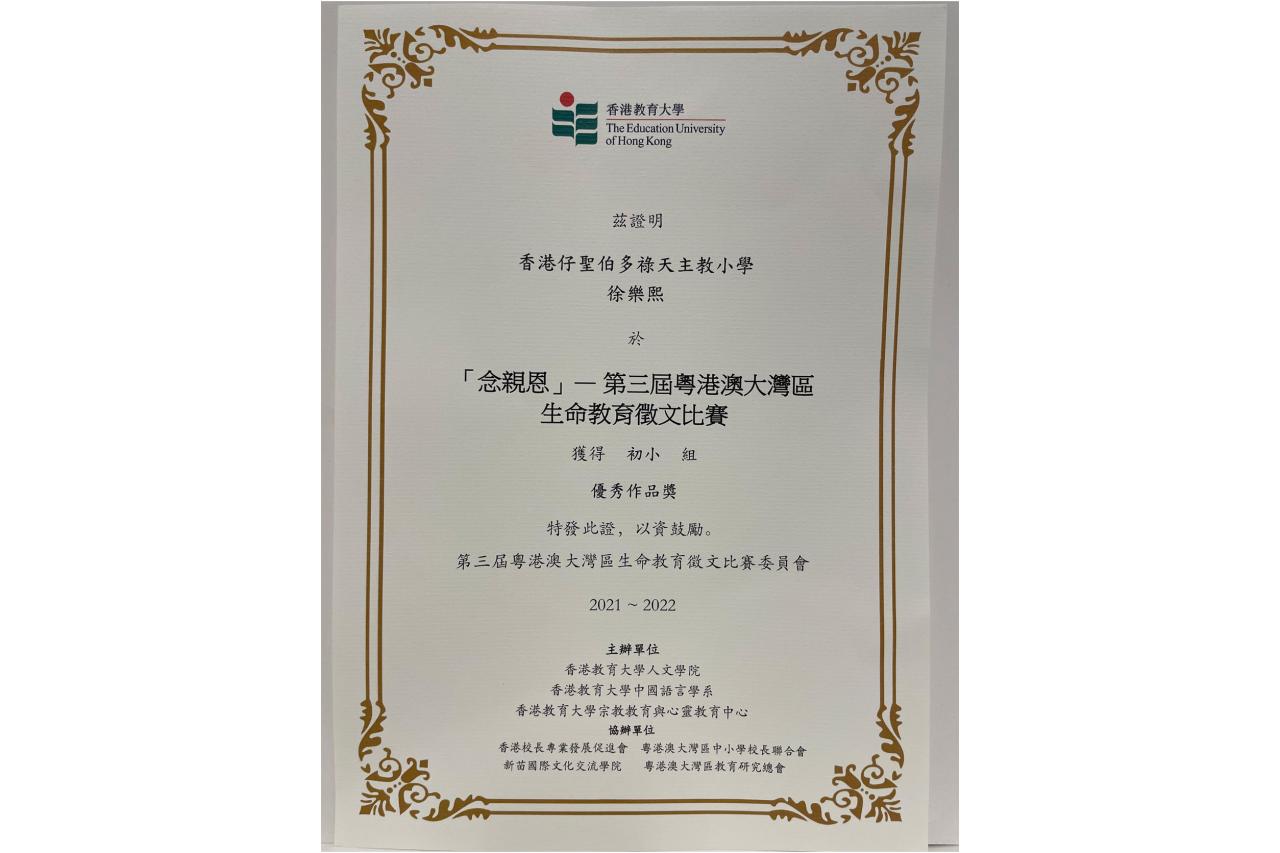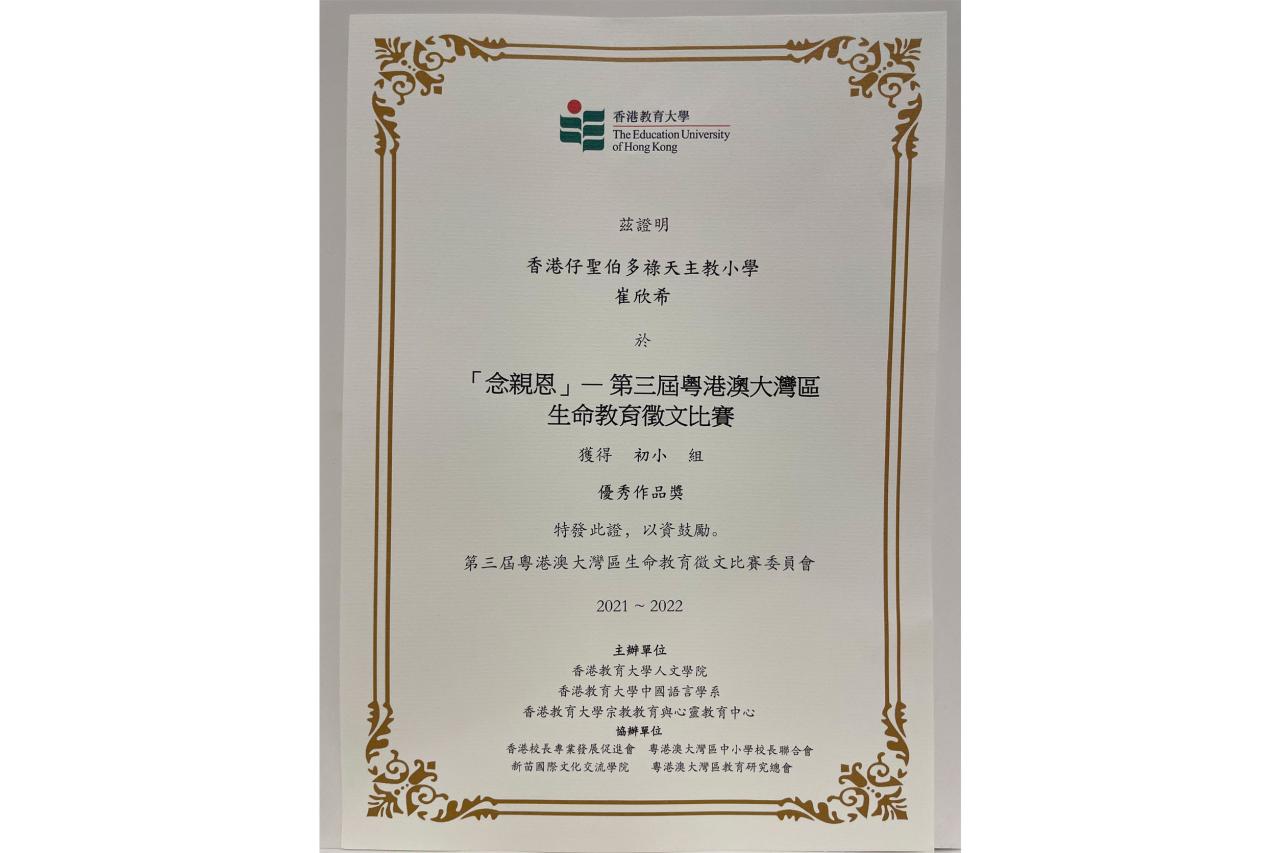 本校學生於「第三屆粵港澳大灣區生命教育徵文比賽」中榮獲「優秀作品奬」: