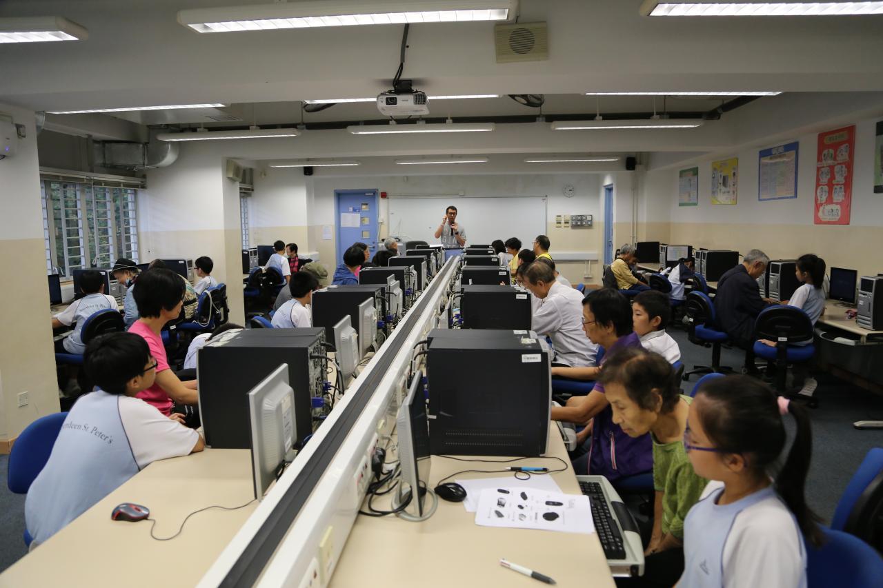 「曦朗長者學苑」由香港仔聖伯多祿天主教小學和香港仔街坊褔利會社會服務中心賽馬會黃志強長者地區中心共同合辦。本活動目標是透過學生教授長者電腦的基礎知識及上網技巧,達致跨代共融、教學相長。