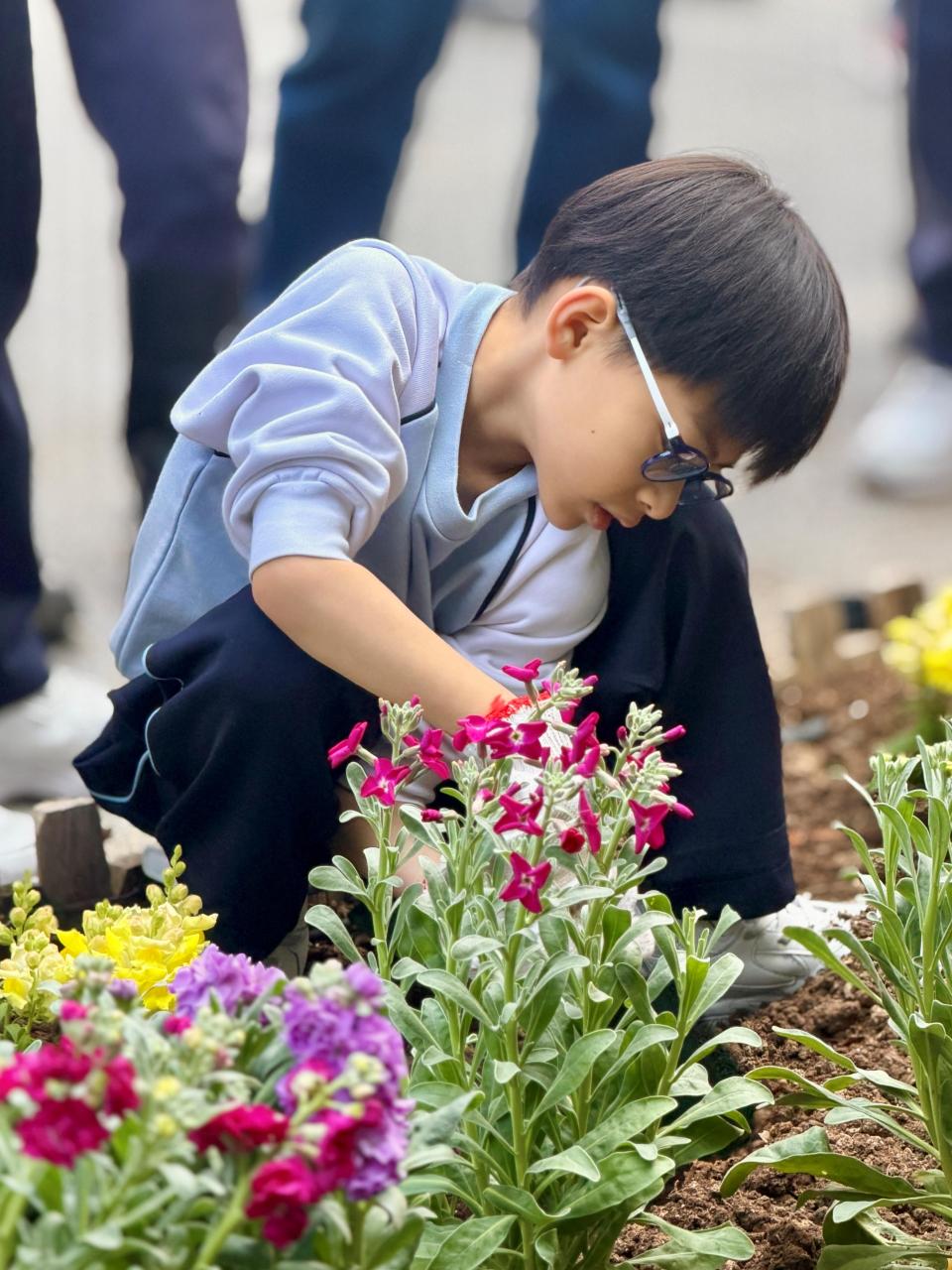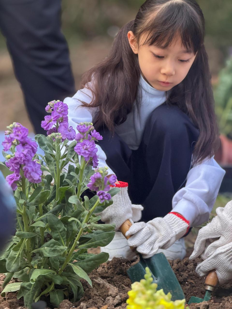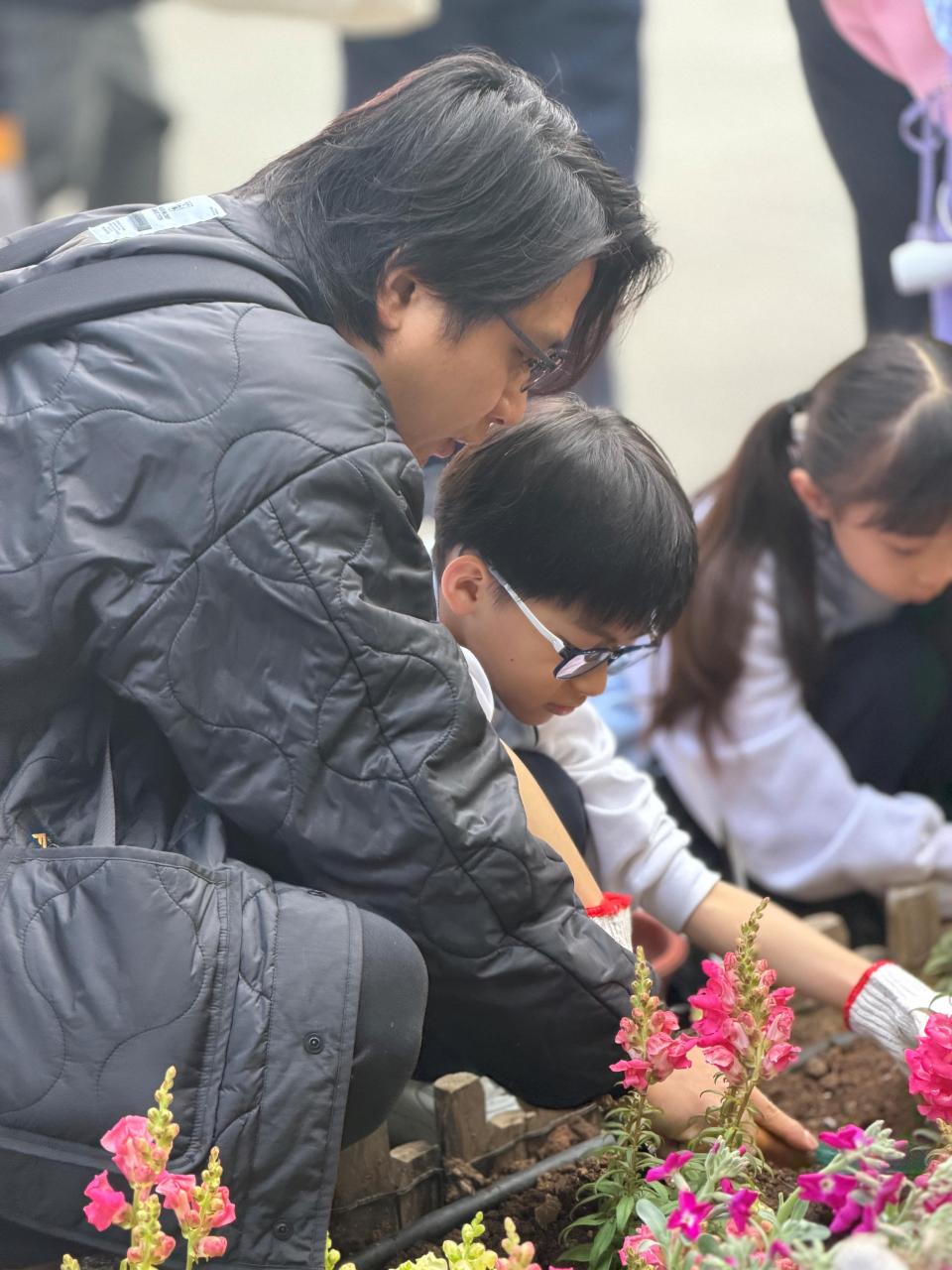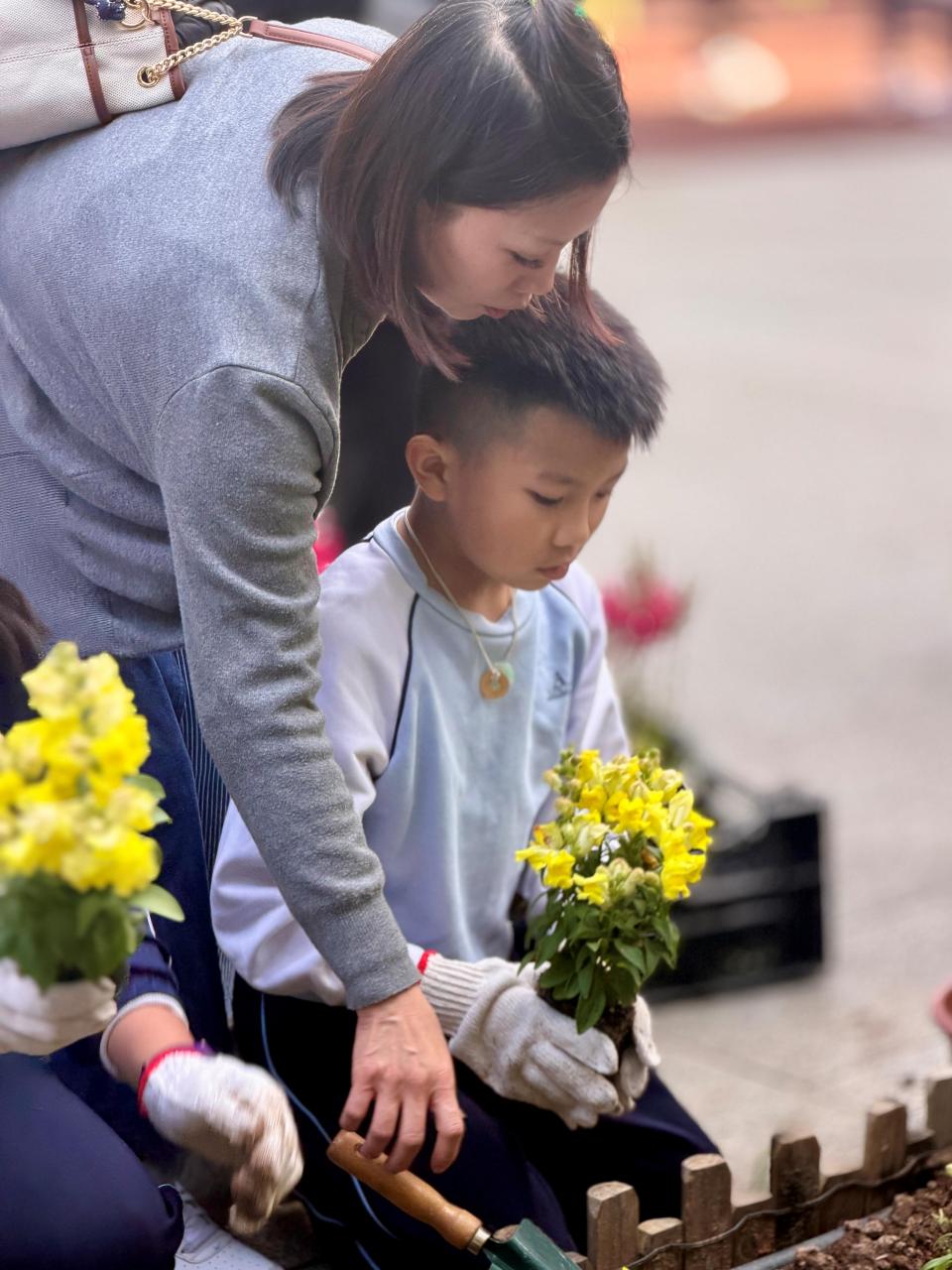 活動當日,低年級學生絲毫不遜於高年級的師兄師姐,每人都身體力行、專注投入。在家長的悉心指導下,同學們熟練操作種植工具,將紫羅蘭、小金魚草的花苗細心栽種於花圃中。從放苗、培土至澆水,每個步驟皆有板有眼,小小身軀盡顯對自然的珍視與責任感。