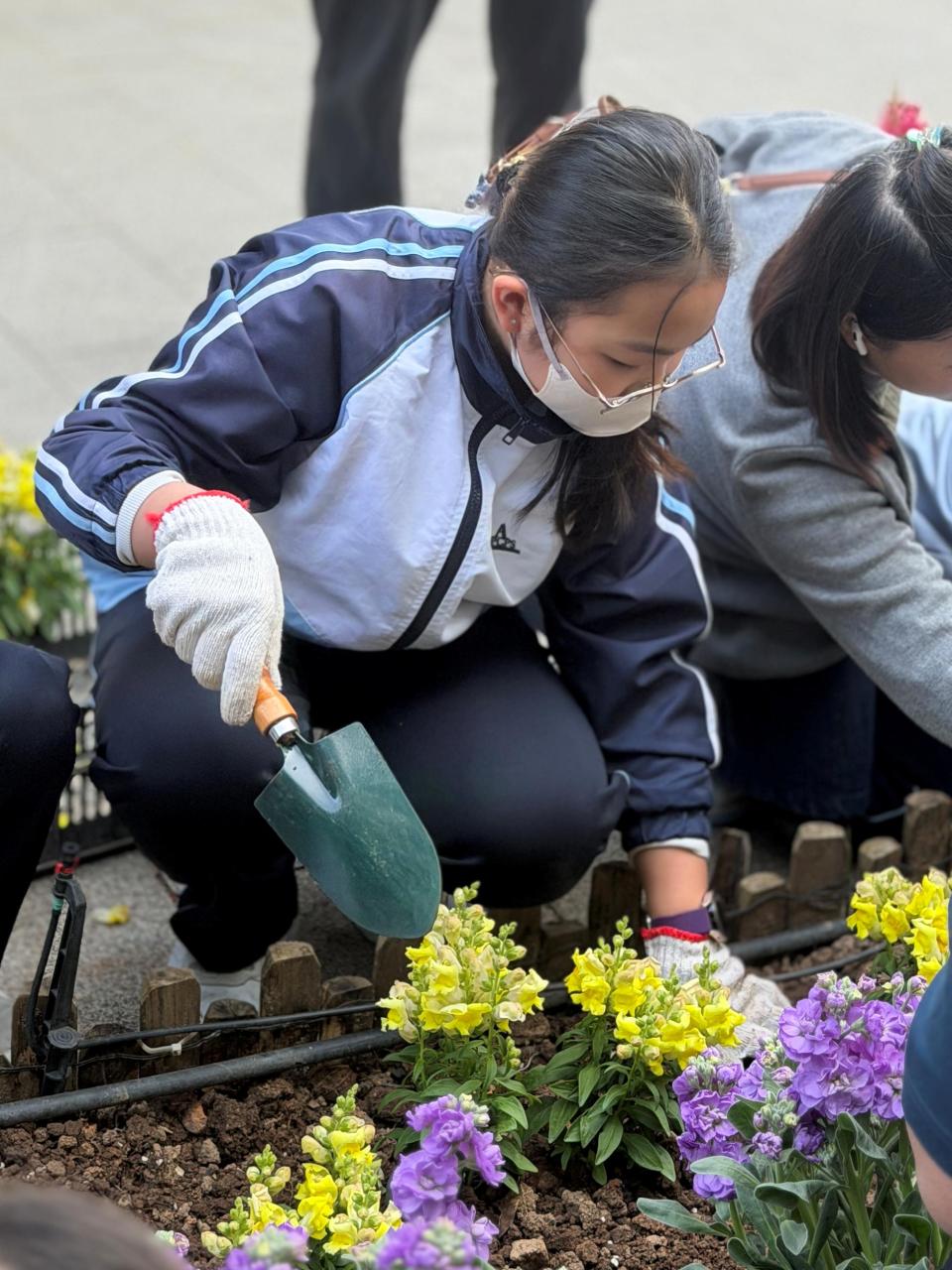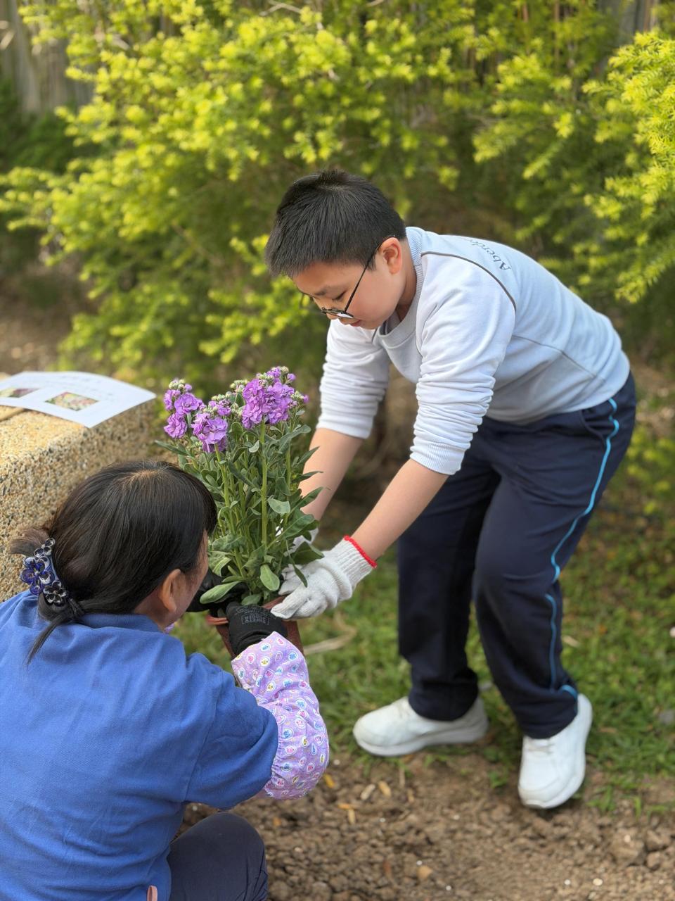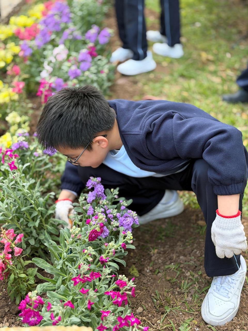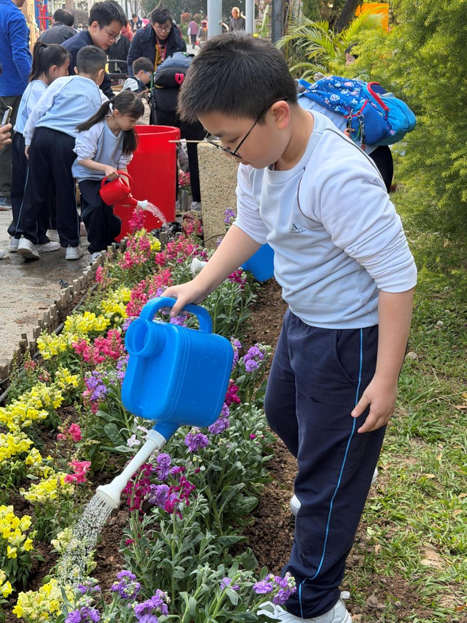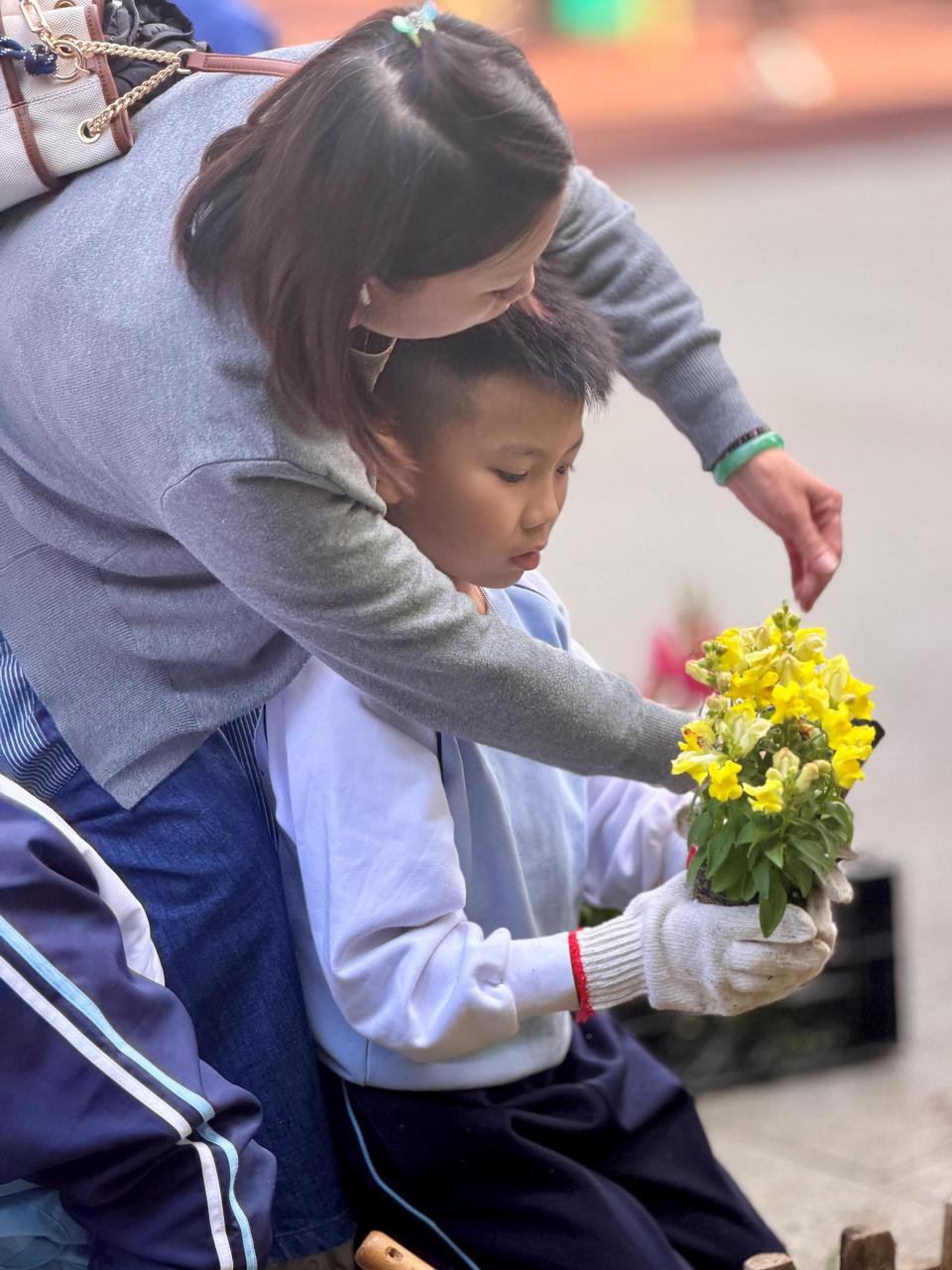 活動當日,低年級學生絲毫不遜於高年級的師兄師姐,每人都身體力行、專注投入。在家長的悉心指導下,同學們熟練操作種植工具,將紫羅蘭、小金魚草的花苗細心栽種於花圃中。從放苗、培土至澆水,每個步驟皆有板有眼,小小身軀盡顯對自然的珍視與責任感。
