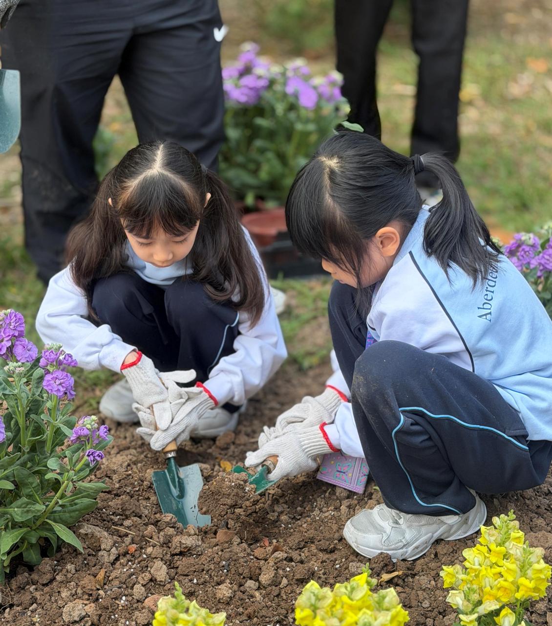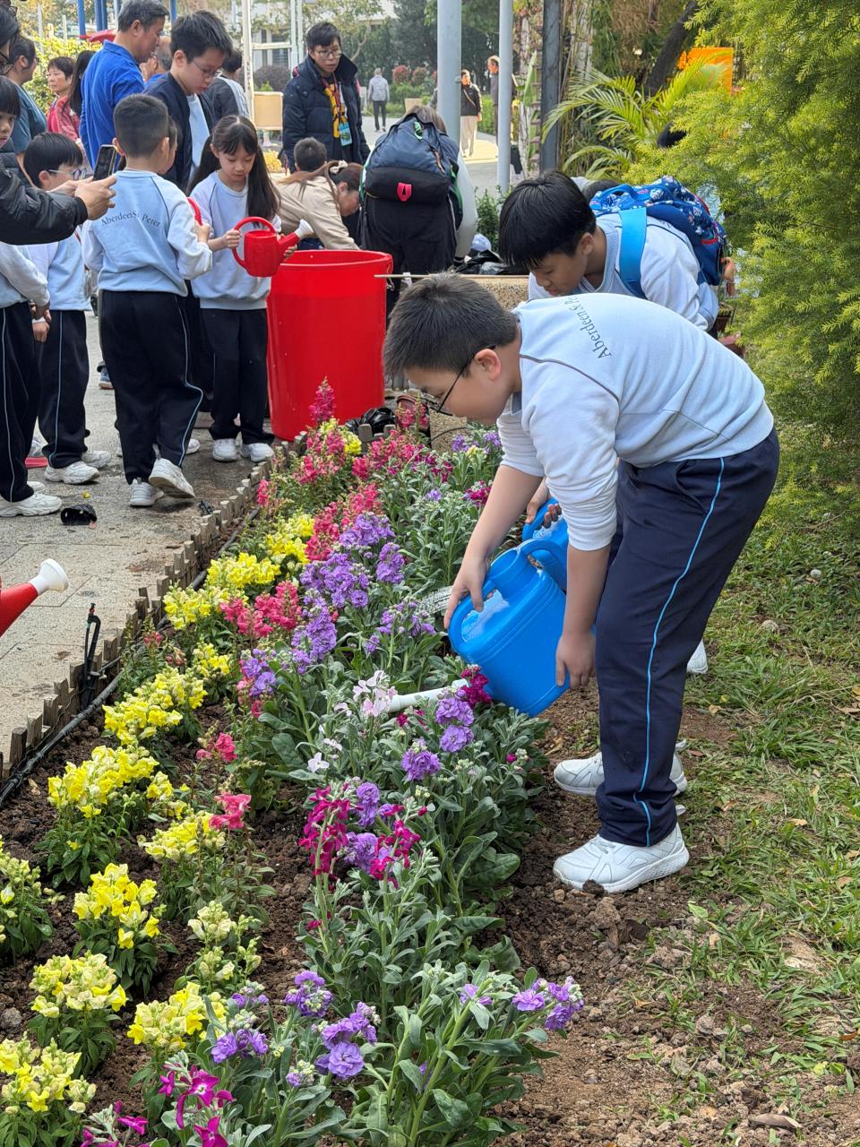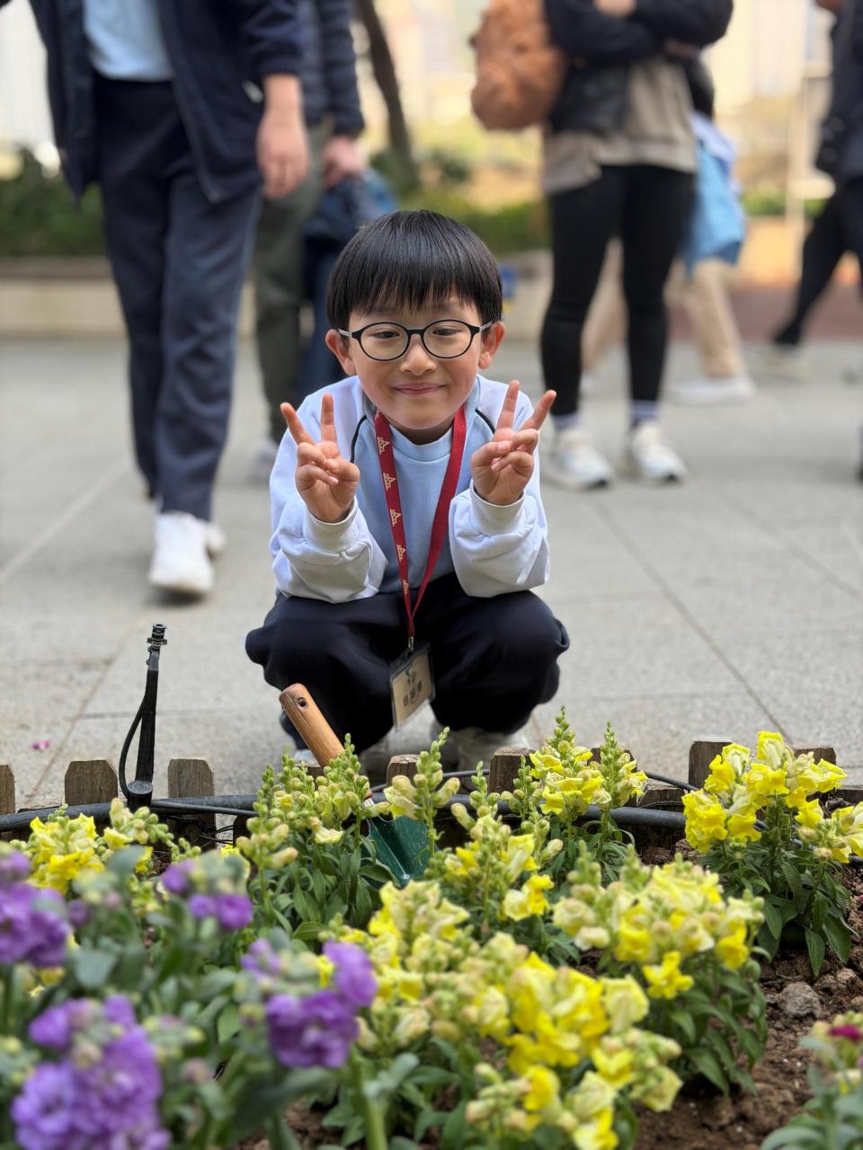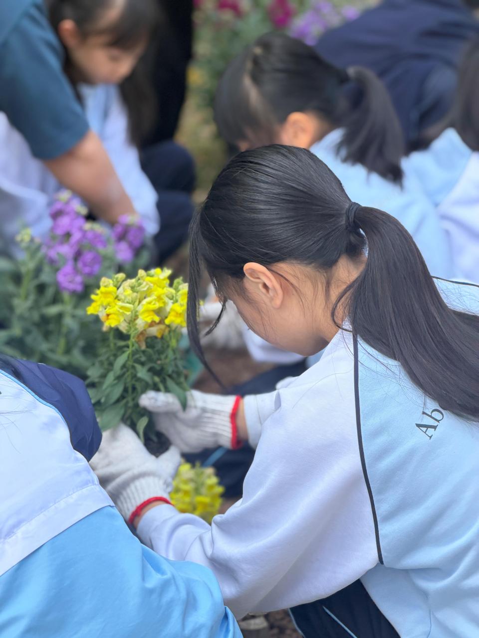 活動當日,低年級學生絲毫不遜於高年級的師兄師姐,每人都身體力行、專注投入。在家長的悉心指導下,同學們熟練操作種植工具,將紫羅蘭、小金魚草的花苗細心栽種於花圃中。從放苗、培土至澆水,每個步驟皆有板有眼,小小身軀盡顯對自然的珍視與責任感。