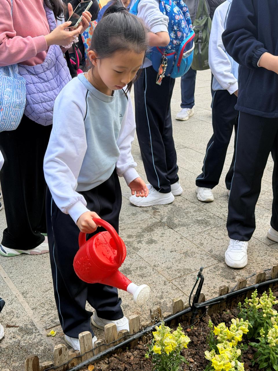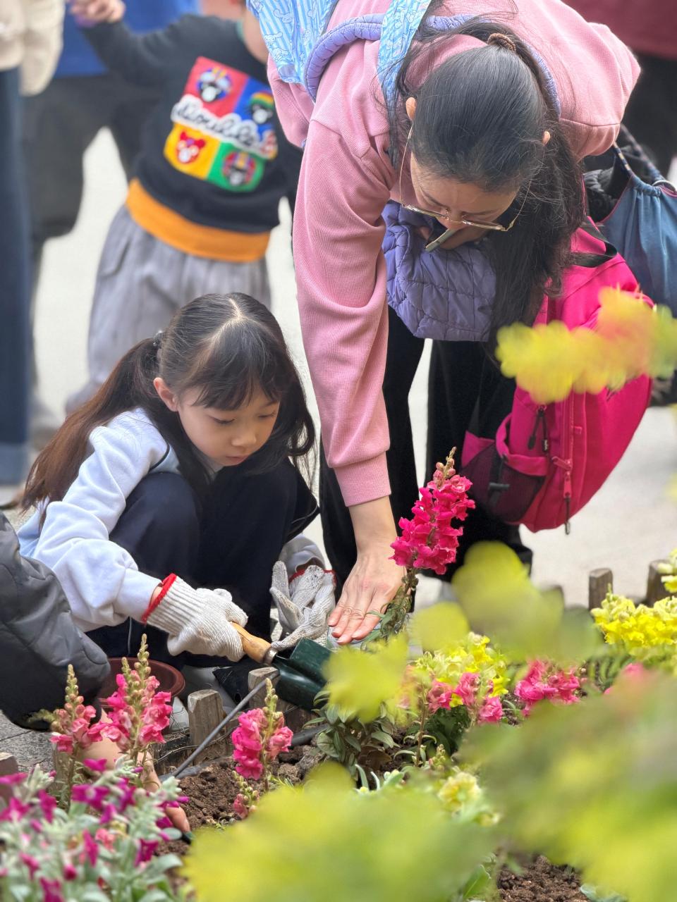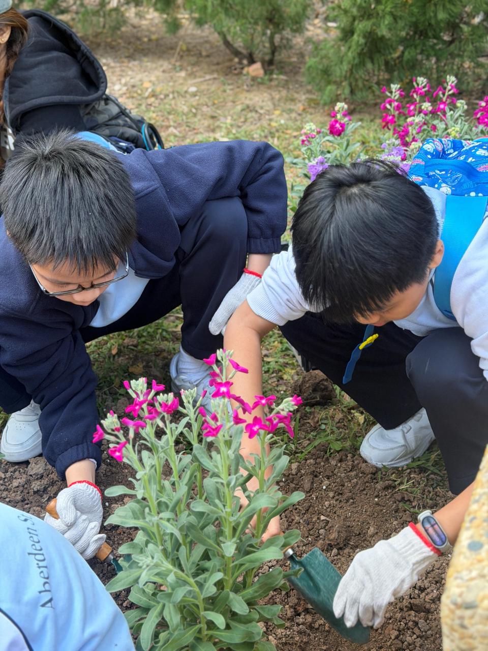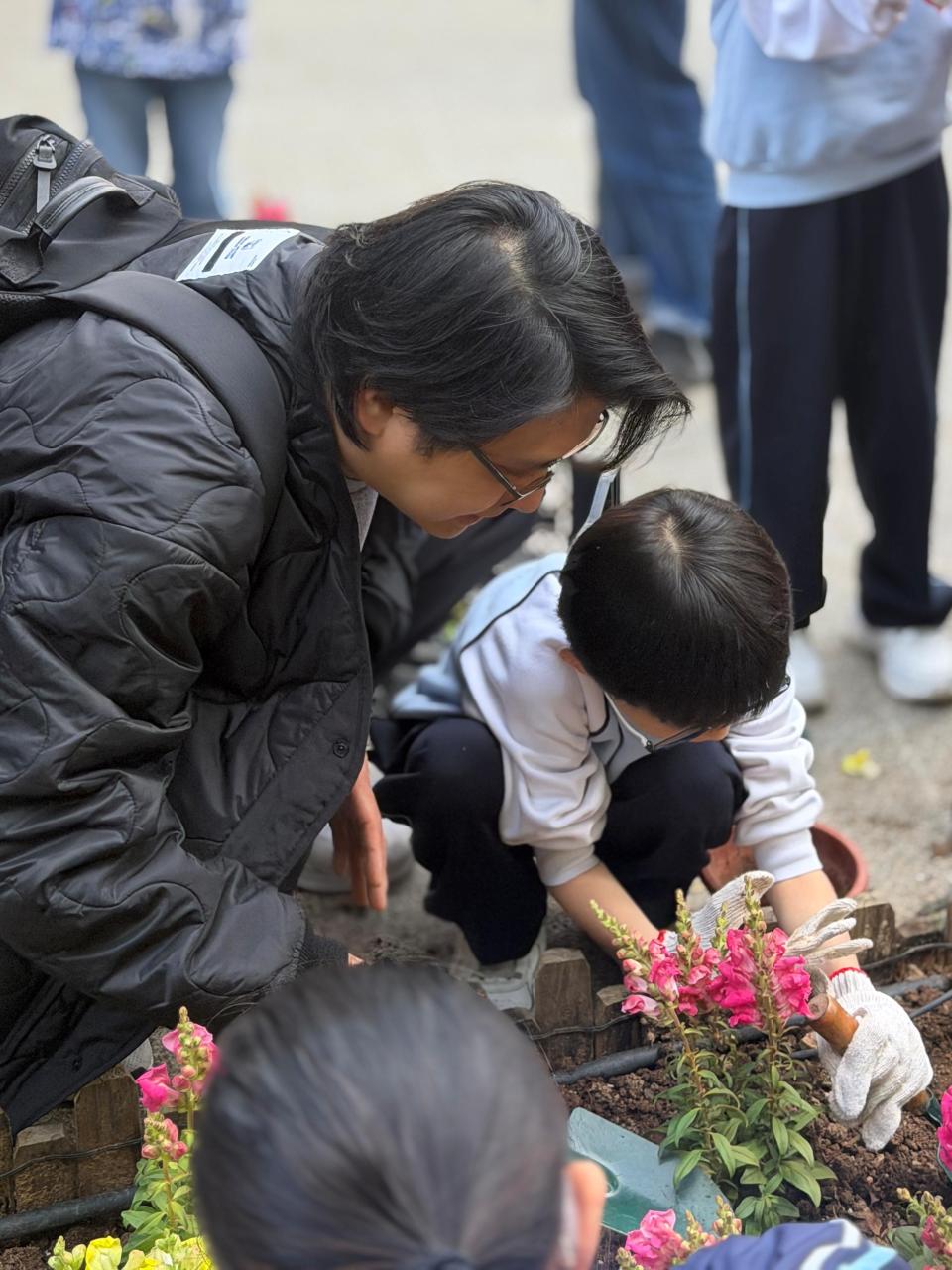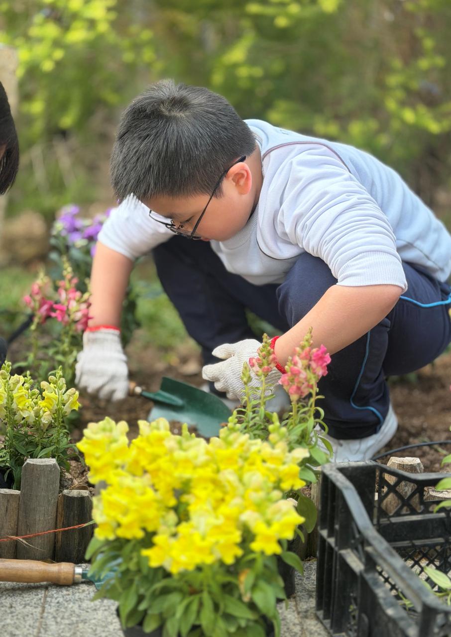 活動當日,低年級學生絲毫不遜於高年級的師兄師姐,每人都身體力行、專注投入。在家長的悉心指導下,同學們熟練操作種植工具,將紫羅蘭、小金魚草的花苗細心栽種於花圃中。從放苗、培土至澆水,每個步驟皆有板有眼,小小身軀盡顯對自然的珍視與責任感。