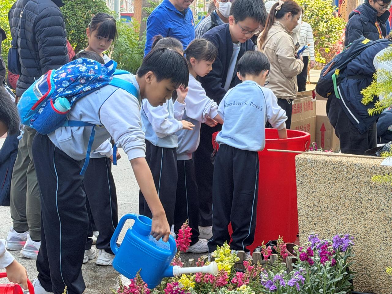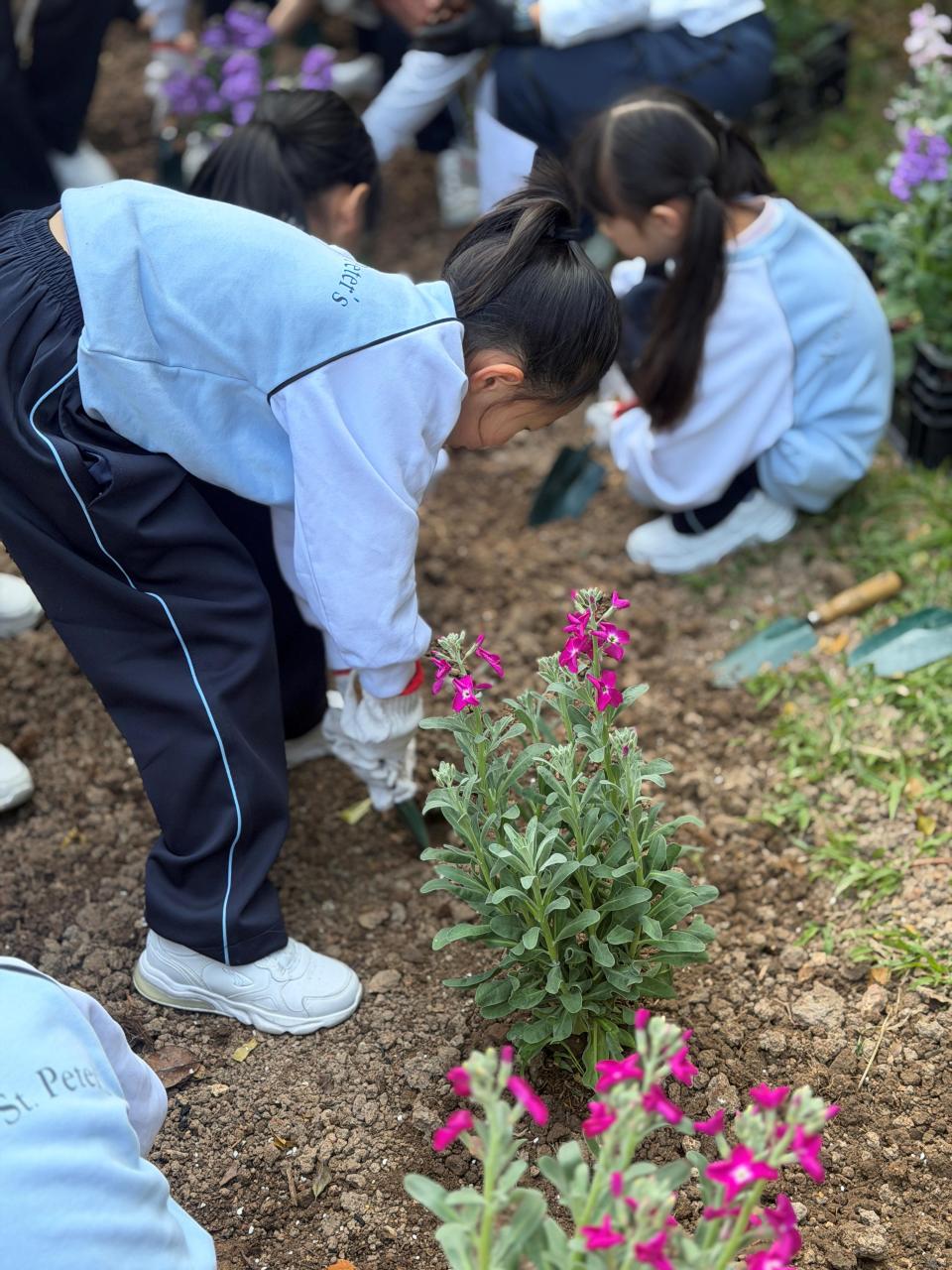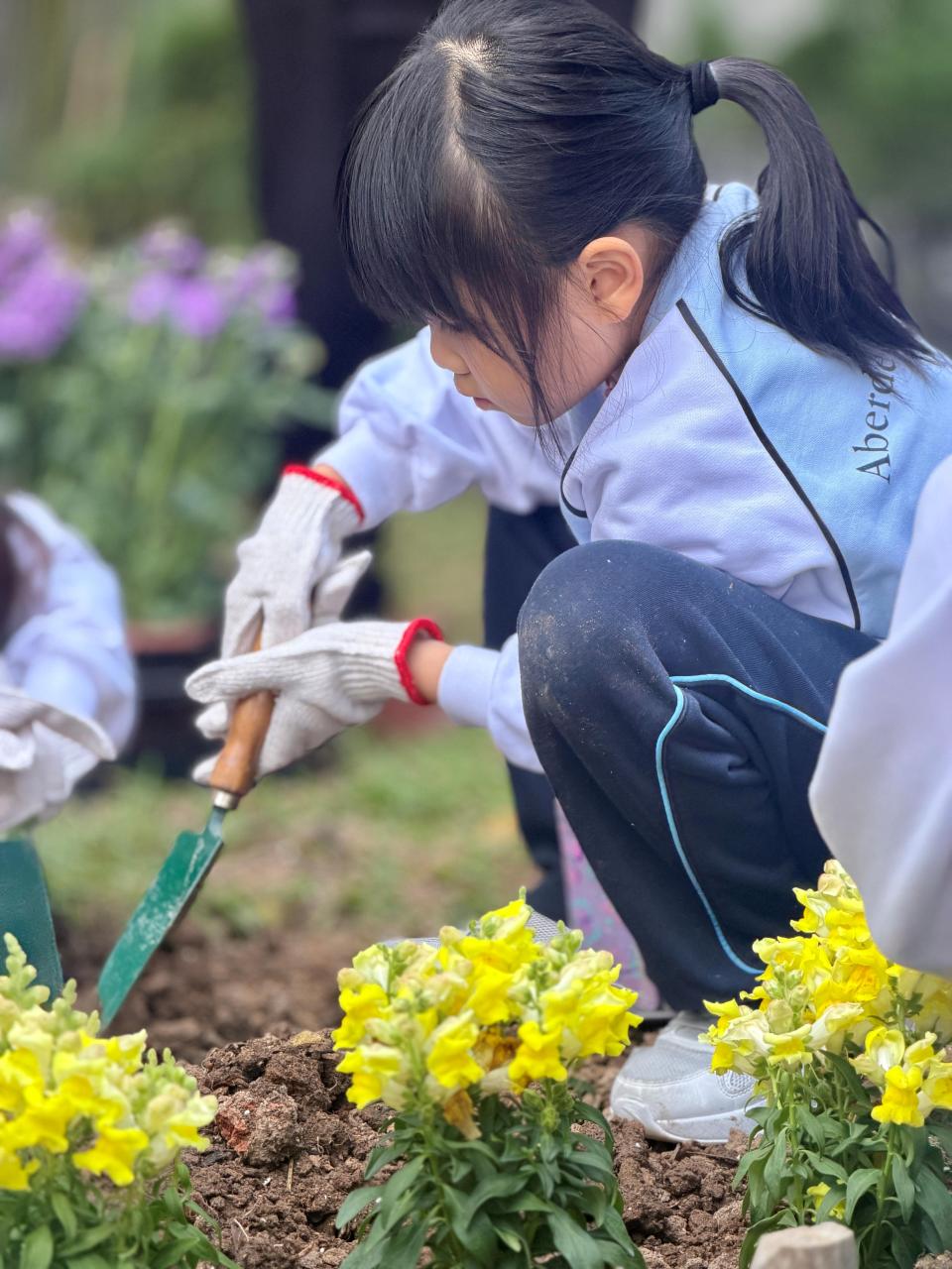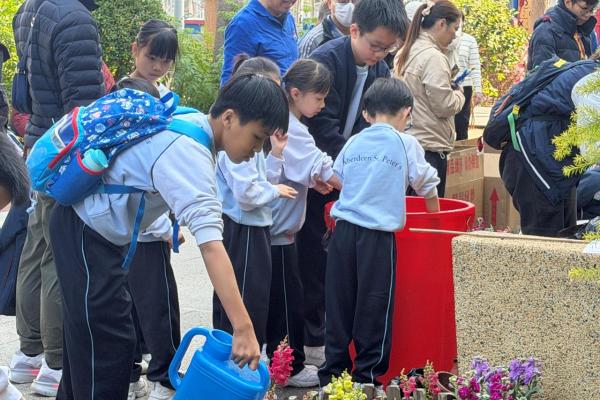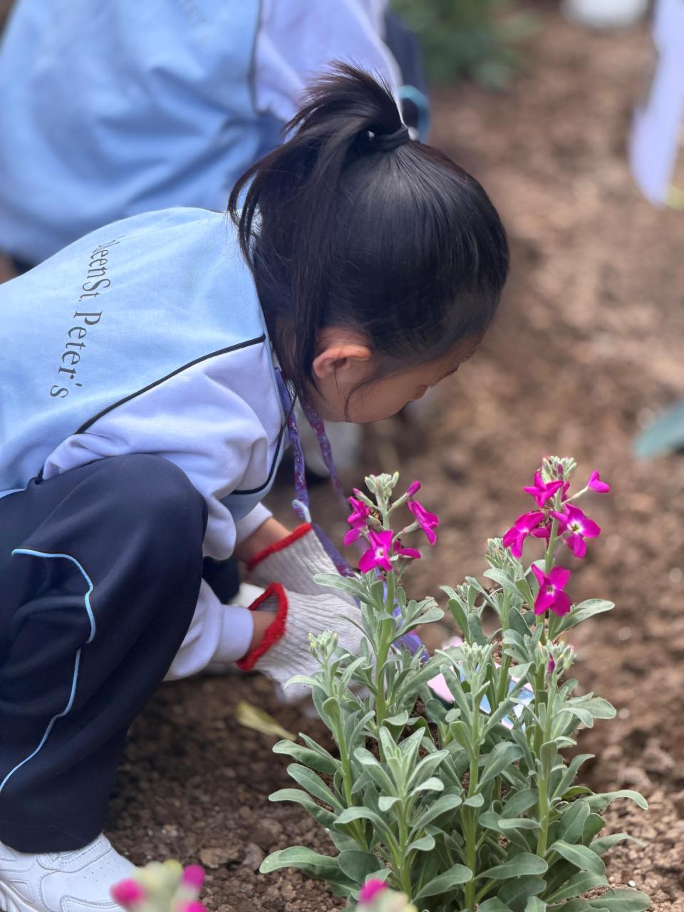活動當日,低年級學生絲毫不遜於高年級的師兄師姐,每人都身體力行、專注投入。在家長的悉心指導下,同學們熟練操作種植工具,將紫羅蘭、小金魚草的花苗細心栽種於花圃中。從放苗、培土至澆水,每個步驟皆有板有眼,小小身軀盡顯對自然的珍視與責任感。