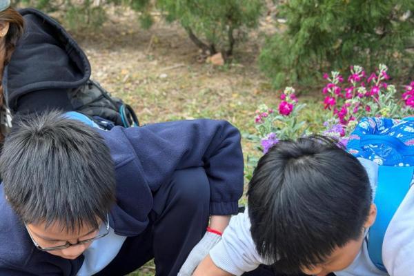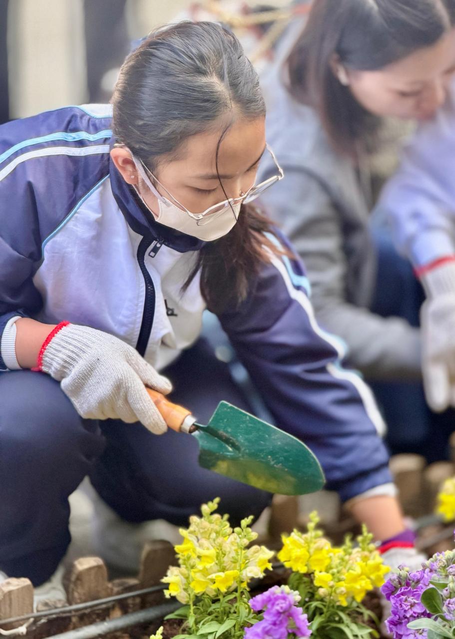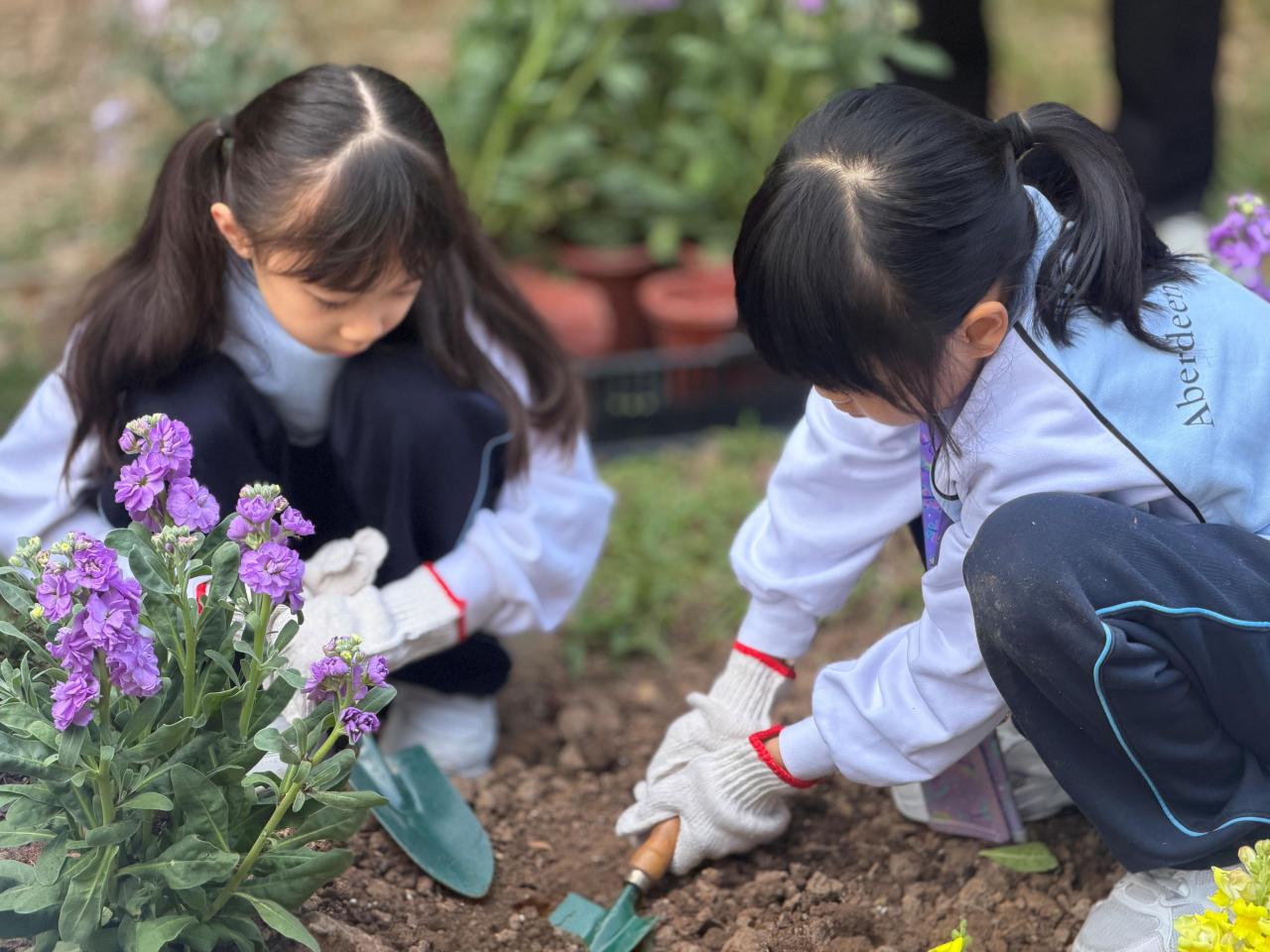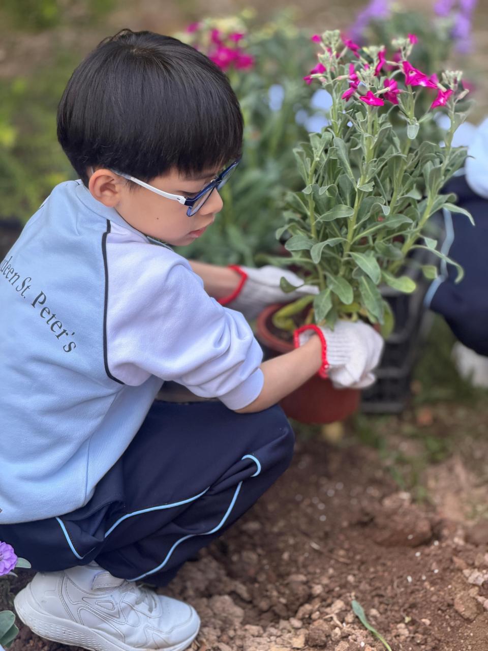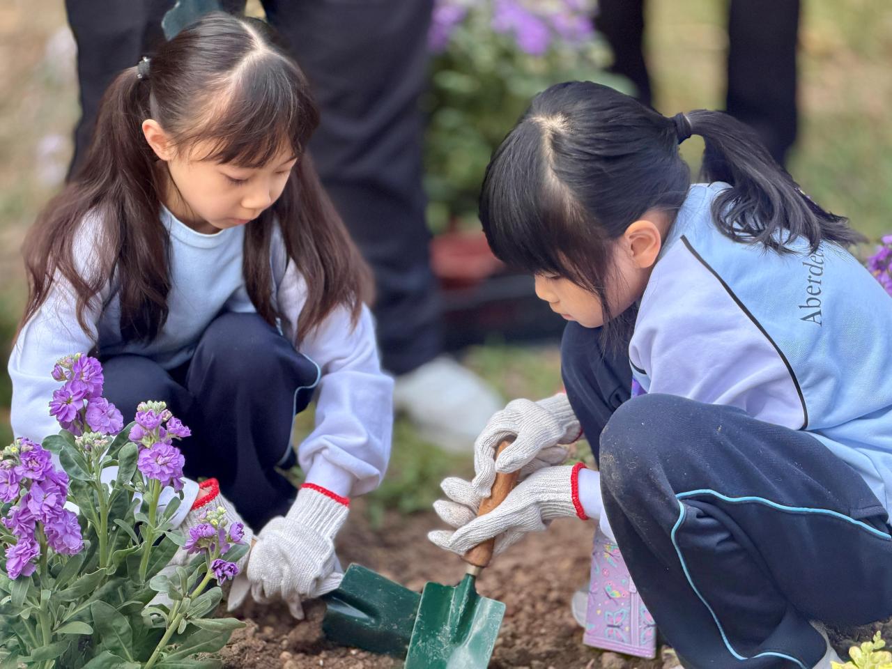 活動當日,低年級學生絲毫不遜於高年級的師兄師姐,每人都身體力行、專注投入。在家長的悉心指導下,同學們熟練操作種植工具,將紫羅蘭、小金魚草的花苗細心栽種於花圃中。從放苗、培土至澆水,每個步驟皆有板有眼,小小身軀盡顯對自然的珍視與責任感。