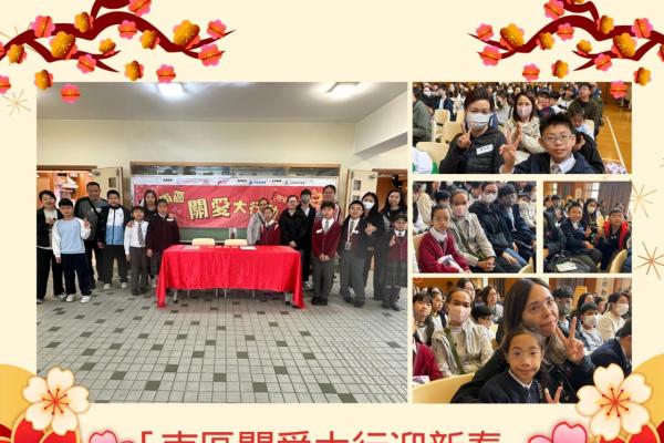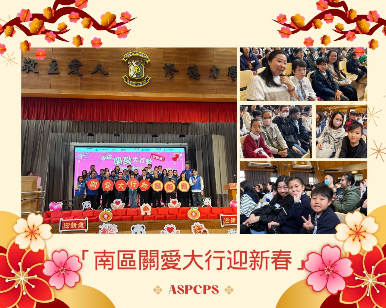 31/01/2026(六),南區民政事務處南區民政事務專員張佩珊女士, JP、中聯辦港島工作部宣教處副處長黃鵬舉先生、全國人大代表朱立威先生, MH、全國政協委員周厚立先生, MH, JP、香港南區各界聯會理事長陳南坡先生, SBS, JP、立法會議員陳學鋒先生, MH, JP、南區關愛隊聯席召集人彭兆基先生以及南區學校聯會主席侯麗珊校長蒞臨本校,和我們學校的親子義工一同出席「南區關愛大行動迎新歲」活動。