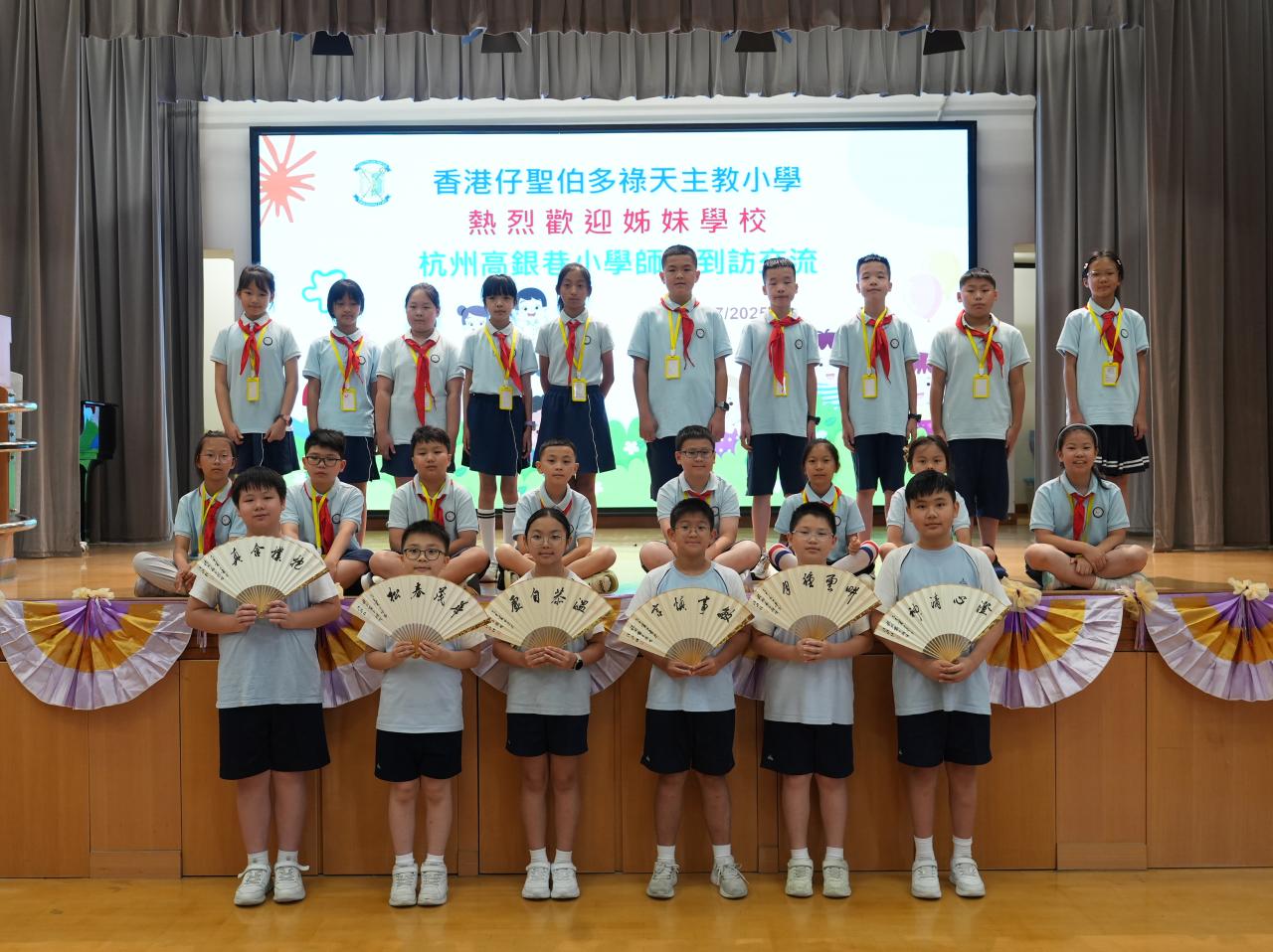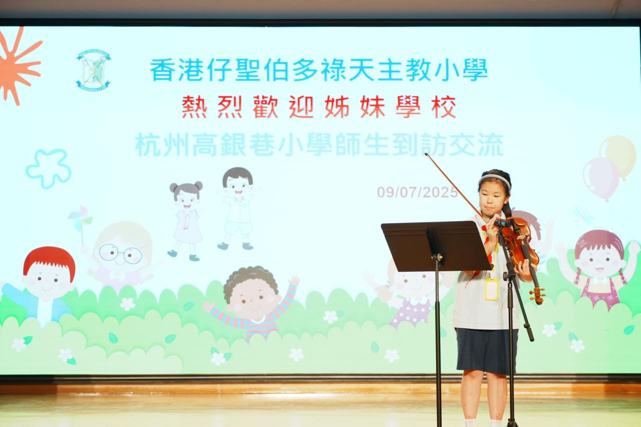 09-07-2025(三),杭州市高銀巷小學師生蒞臨本校。賓客們參觀校舍,與本校學生一起上課,與學生一起互動,還欣賞了精彩的英語話劇,氣氛熱烈融洽,參觀尾聲,杭州同學更表演🎻,為兩校交流添上了生動的一曲。