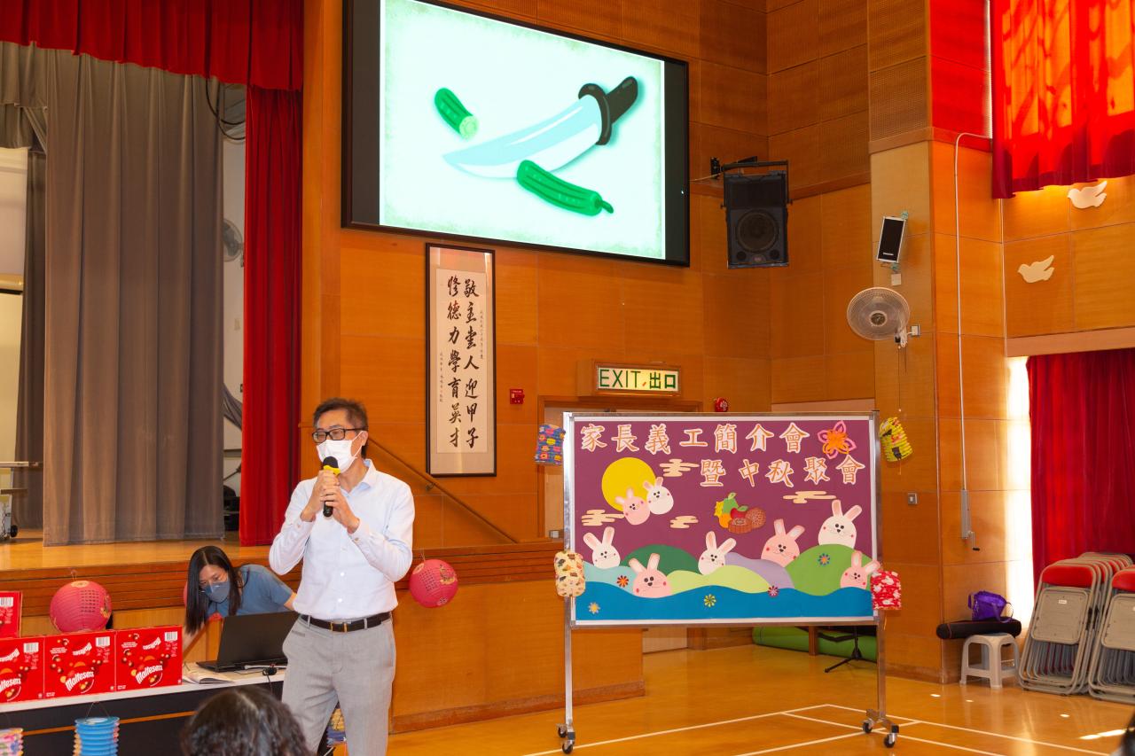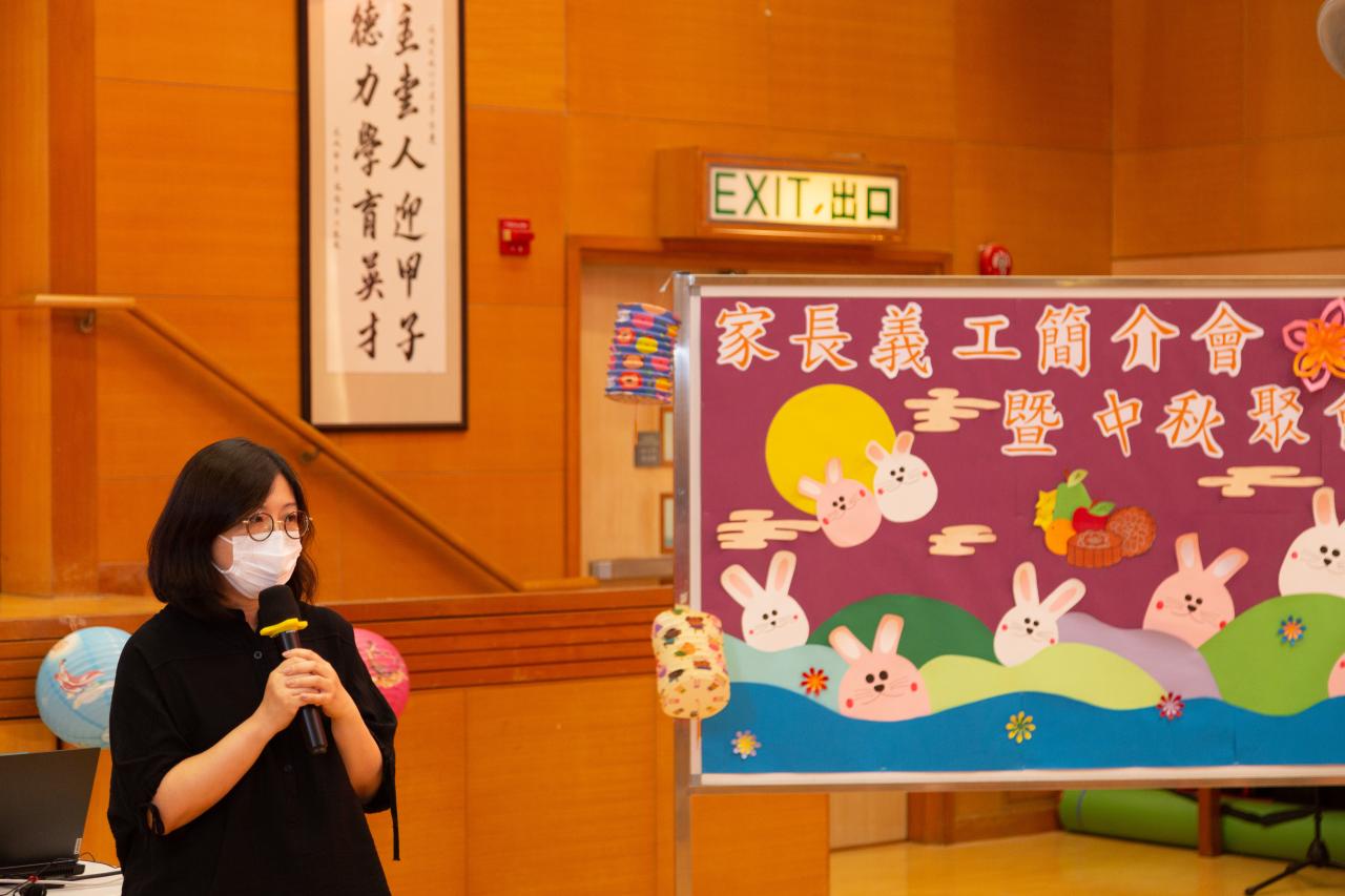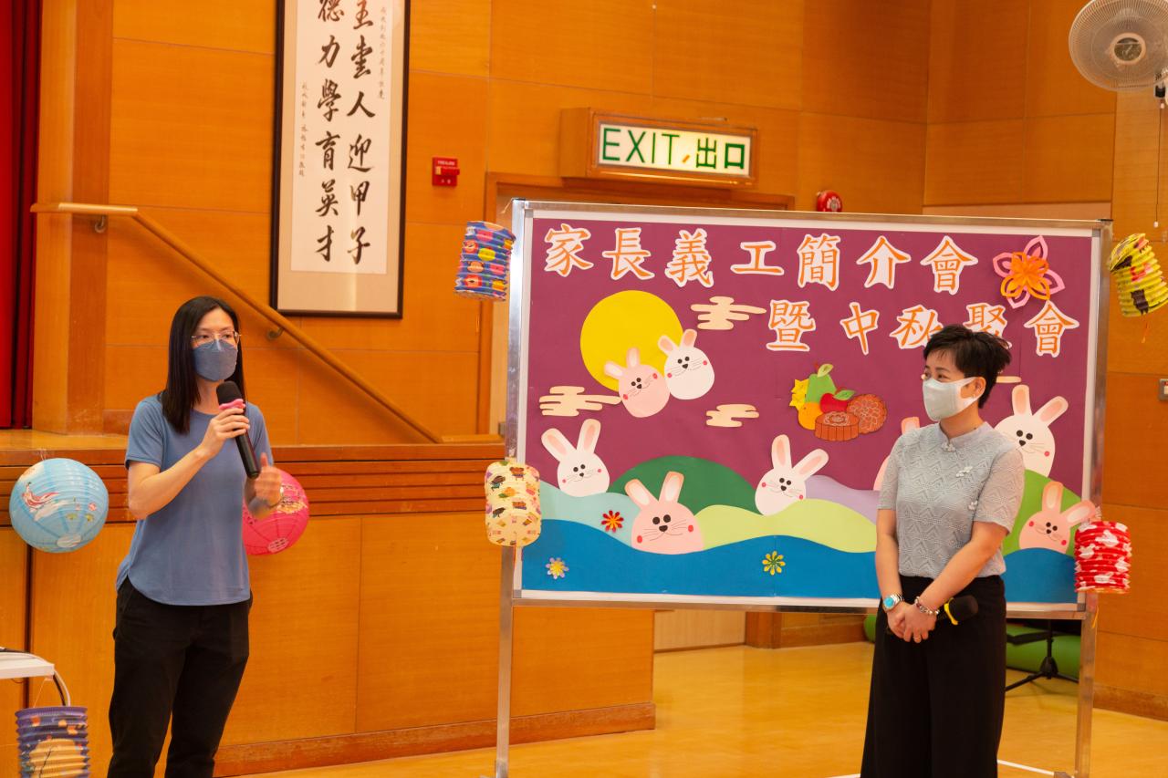 隨後,楊美嘉副校長及圖書館主任黎佩玲老師簡介義工服務,東華三院利東綜合服務中心何金玉姑娘為家長分享義工守則,而蘇健勝主任及項俊威老師與家長進行互動遊戲,讓大家笑聲不絕。最後的抽獎環節亦為聚會增添不少歡樂氣氛,讓大家一同喜迎中秋。