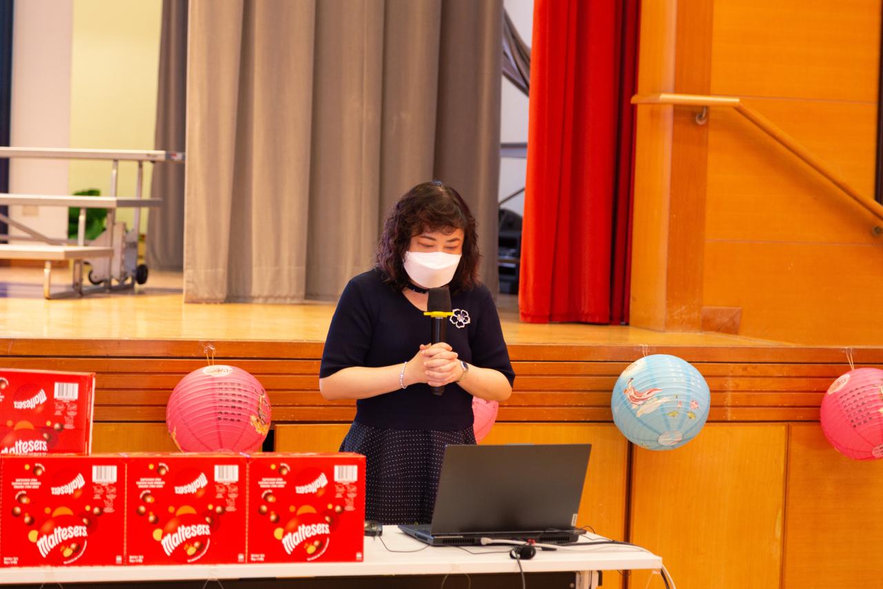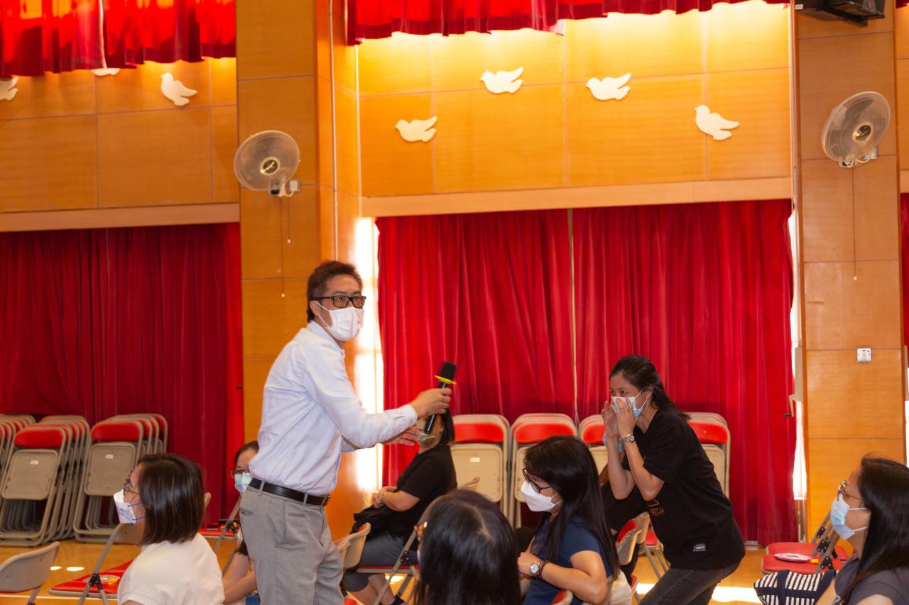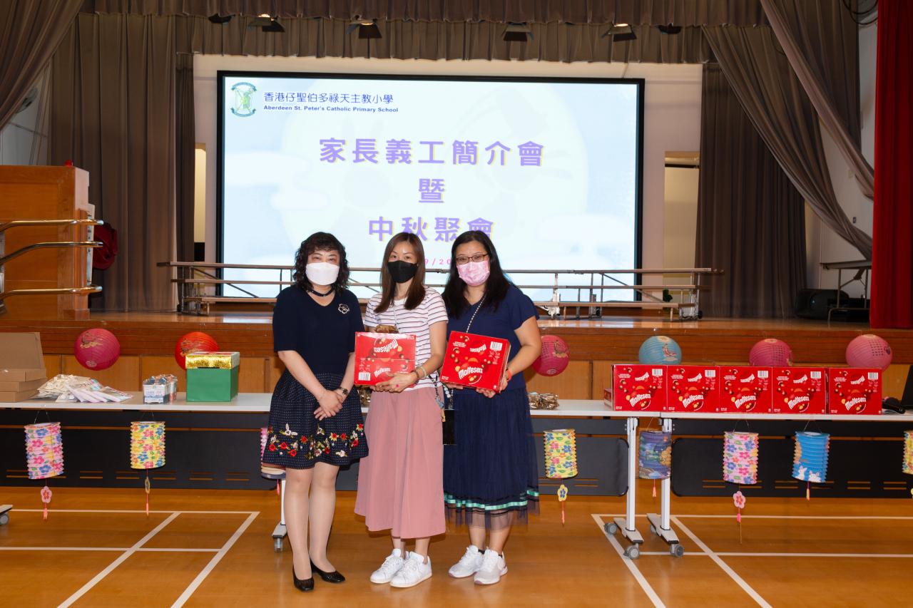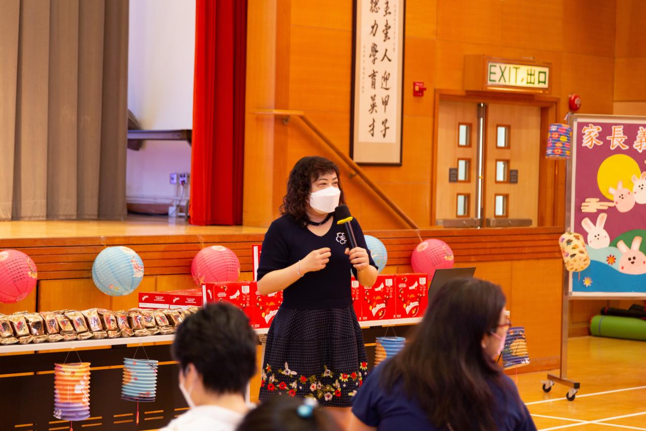 隨後,楊美嘉副校長及圖書館主任黎佩玲老師簡介義工服務,東華三院利東綜合服務中心何金玉姑娘為家長分享義工守則,而蘇健勝主任及項俊威老師與家長進行互動遊戲,讓大家笑聲不絕。最後的抽獎環節亦為聚會增添不少歡樂氣氛,讓大家一同喜迎中秋。