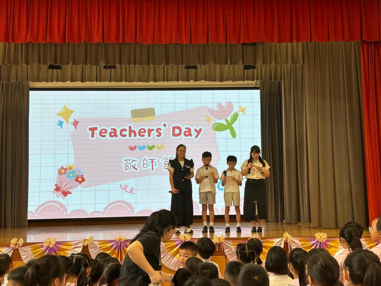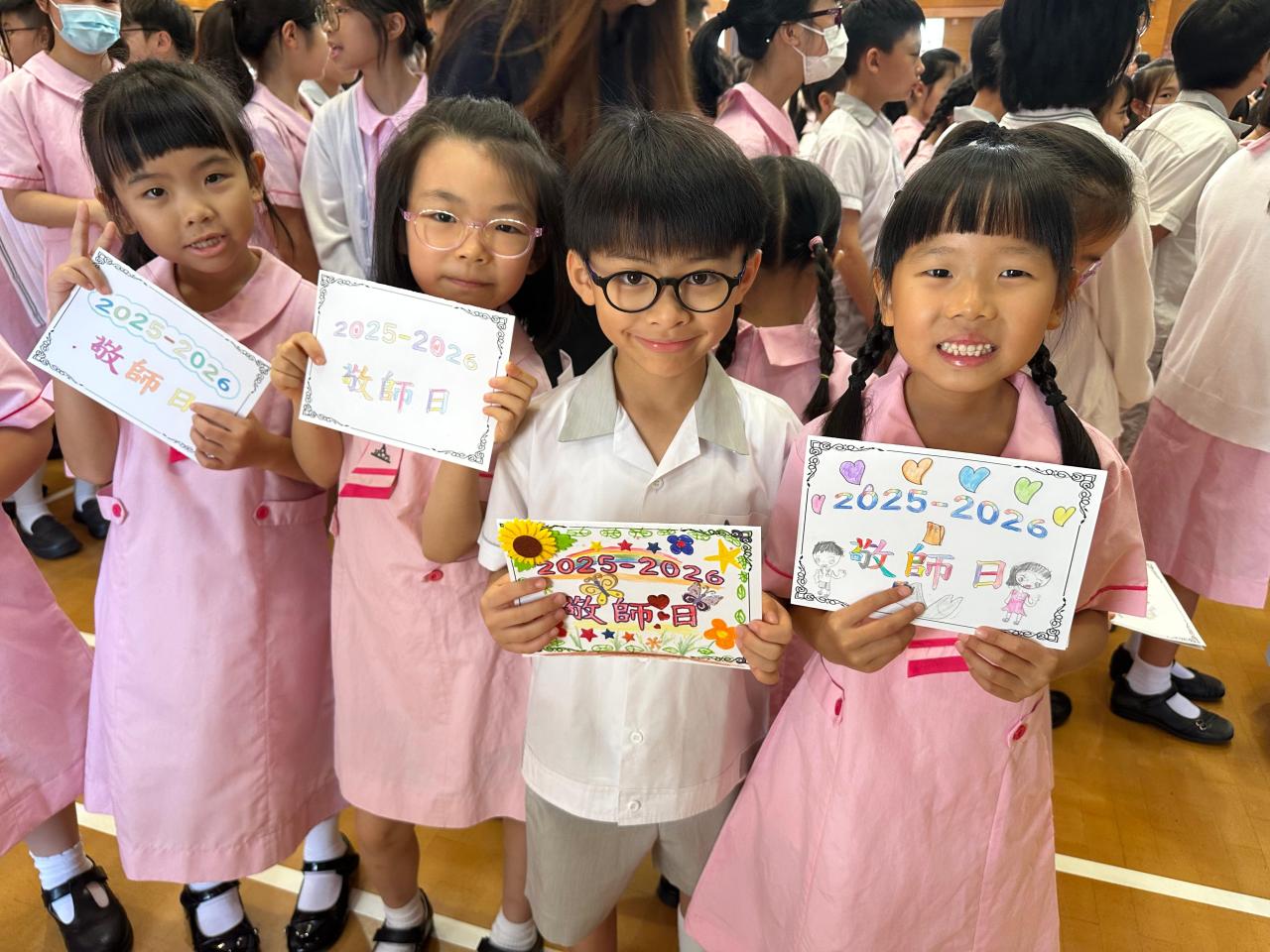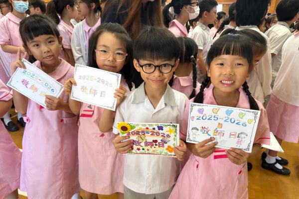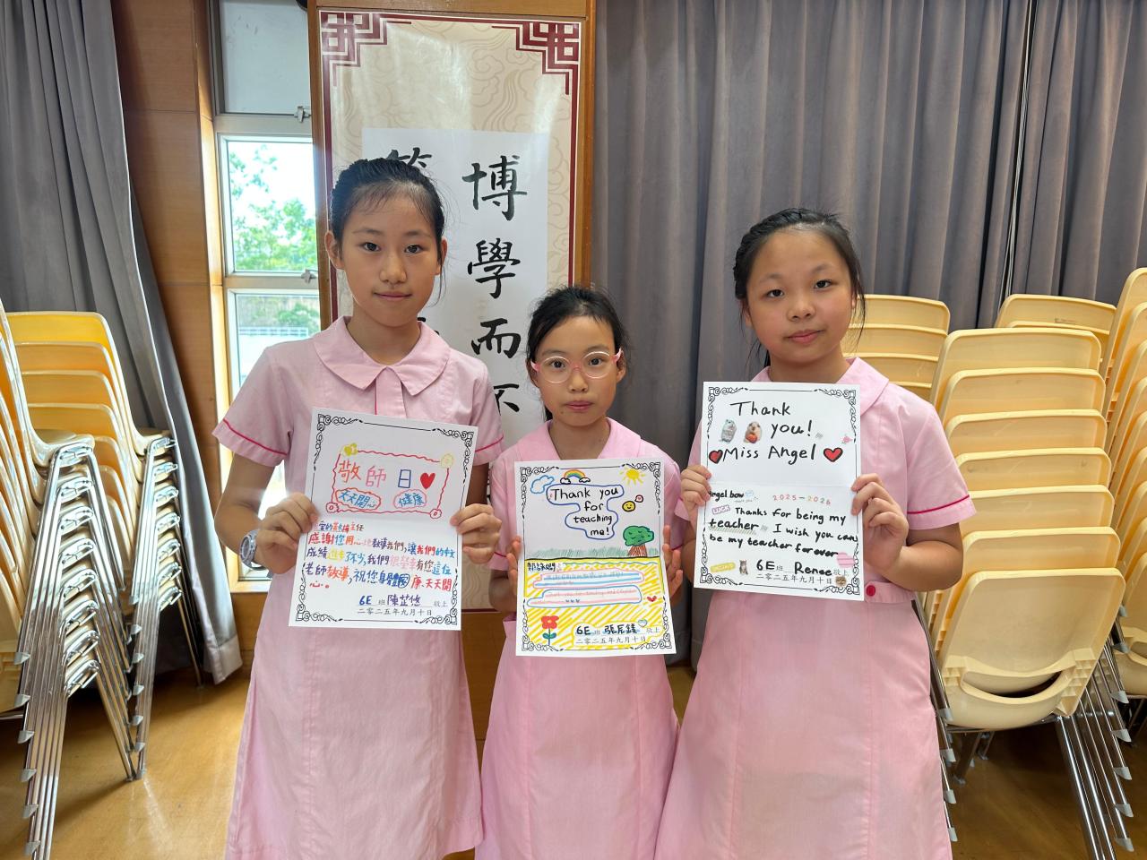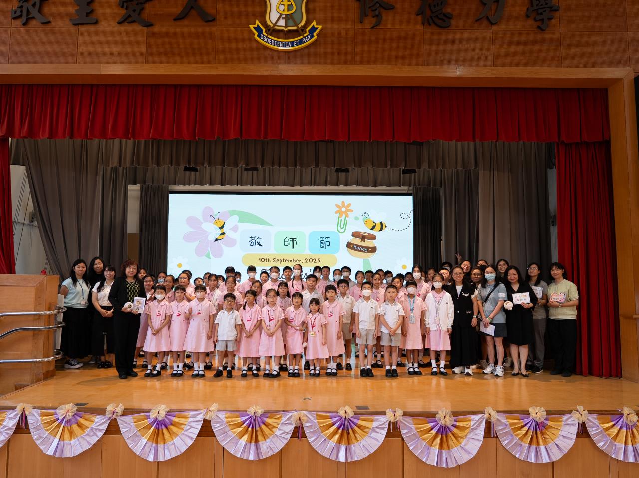 10/09/2025(三)在敬師日活動中,家長教師會主席葉佩恩女士、副主席陳子敏女士,5A 陳孜濬同學與陳冠明同學共同主持是此次活動。 活動內容豐富,首先播放了孩子表達對老師感恩之情的片段,緊接著 6A 班同學獻上唱歌表演。其後,同學向校長、副校長及全體老師致送敬師卡和水果,以表達深深的感激之意。 隨後,校長勉勵同學銘記感恩之心,同時代表學校老師向家長和同學的心意致以謝意。校長強調要實踐校訓「敬主愛人 修德力學」,來報答老師的教導。