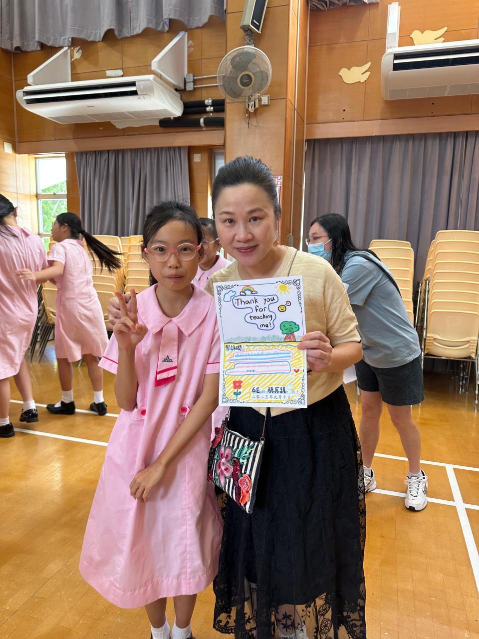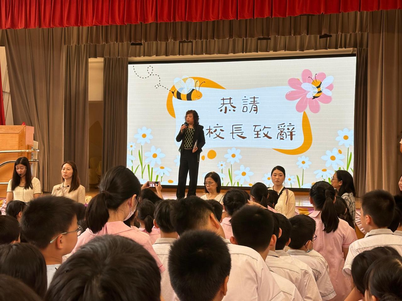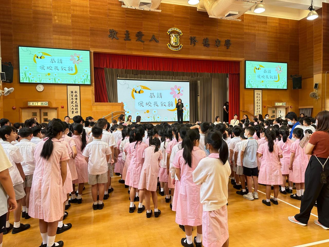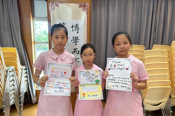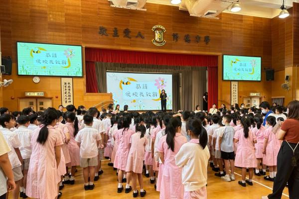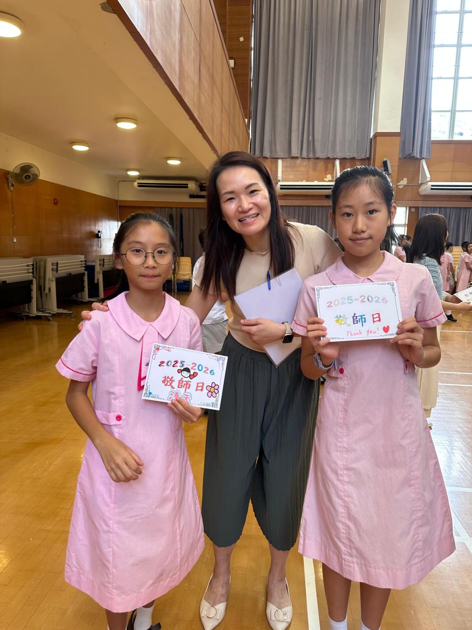 10/09/2025(三)在敬師日活動中,家長教師會主席葉佩恩女士、副主席陳子敏女士,5A 陳孜濬同學與陳冠明同學共同主持是此次活動。 活動內容豐富,首先播放了孩子表達對老師感恩之情的片段,緊接著 6A 班同學獻上唱歌表演。其後,同學向校長、副校長及全體老師致送敬師卡和水果,以表達深深的感激之意。 隨後,校長勉勵同學銘記感恩之心,同時代表學校老師向家長和同學的心意致以謝意。校長強調要實踐校訓「敬主愛人 修德力學」,來報答老師的教導。