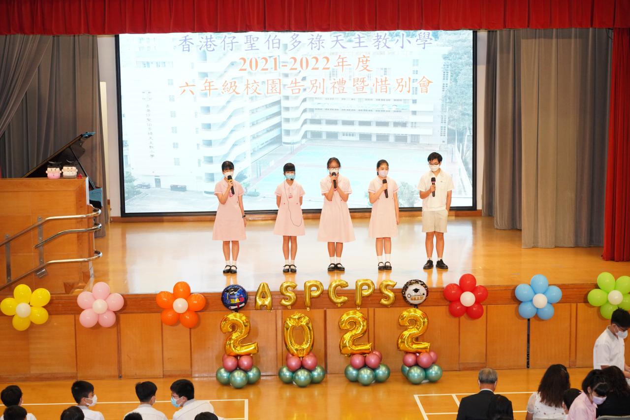 香港仔聖伯多祿天主教小學於二零二二年七月二十二日(星期五)假本校禮堂舉行六年級之「校園告別禮暨惜別會」。典禮開始後,由校監伍國寶神父主持祈禱禮。接着,教育局中西及南區總學校發展主任江琳女士、校監伍國寶神父、校董許瀚賢校長、家長校董葉妙霞女士、楊惠敏女士,以及校友校董何倩恆小姐在侯麗珊校長陪同下為六年級畢業生授憑和頒獎,再由畢業生代表致謝詞,感謝母校的栽培、同學的陪伴支持及家長的悉心照顧。