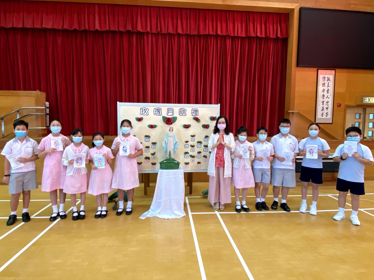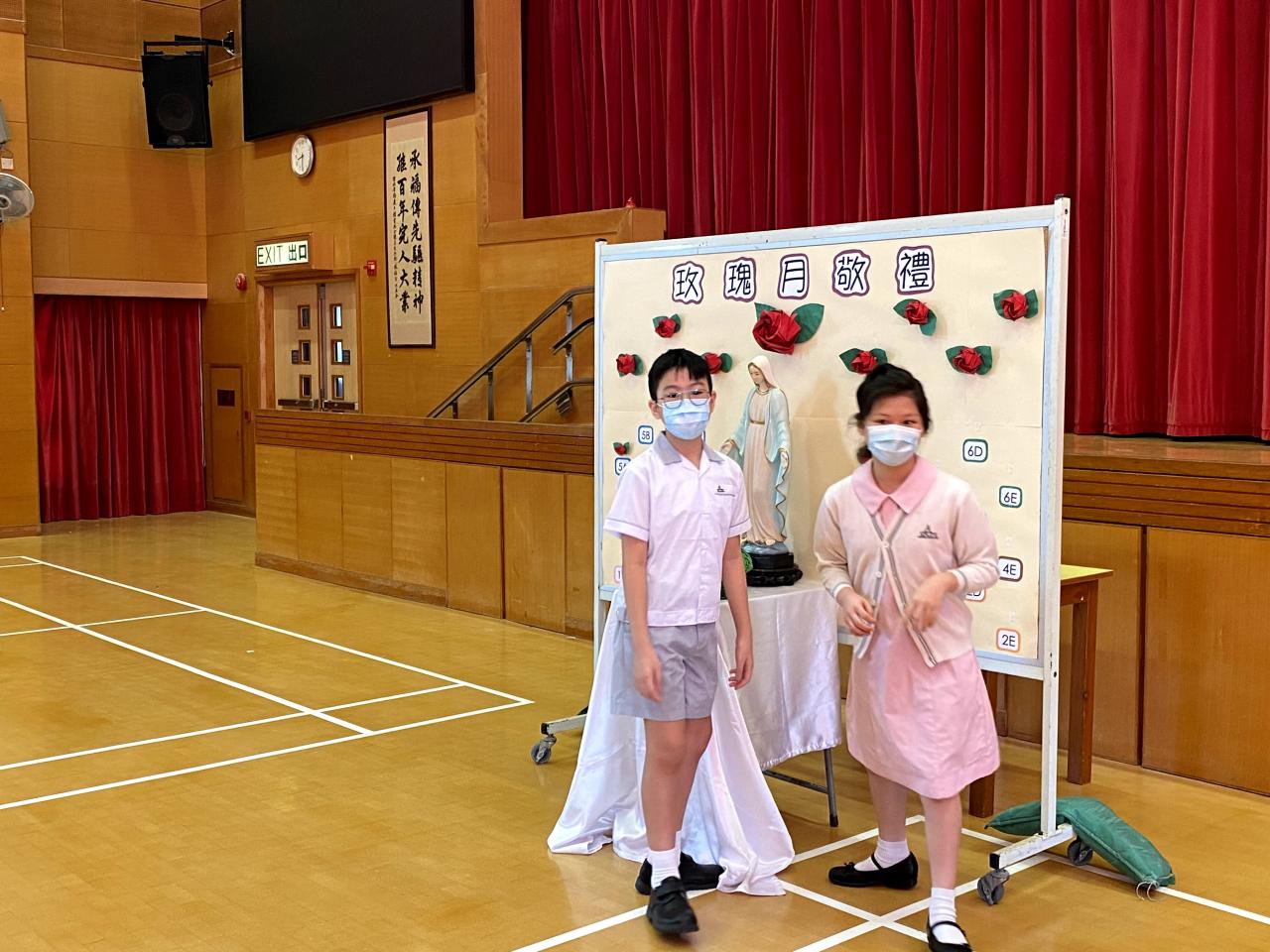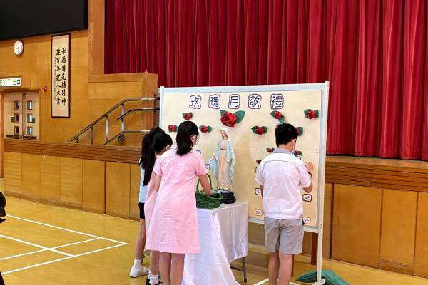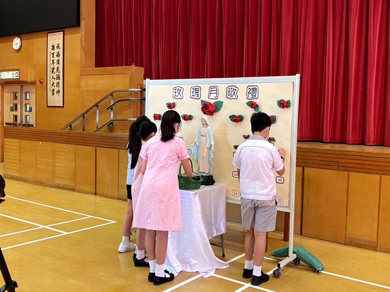 今天在學校禮堂進行了玫瑰月早會敬禮,校長、老師及同學們虔誠地向聖母瑪利亞獻花。
