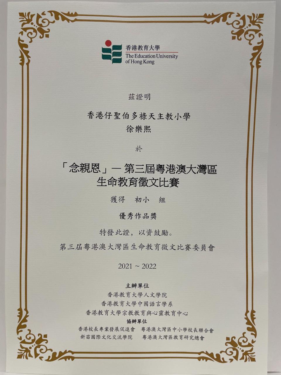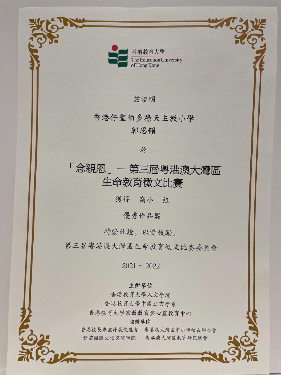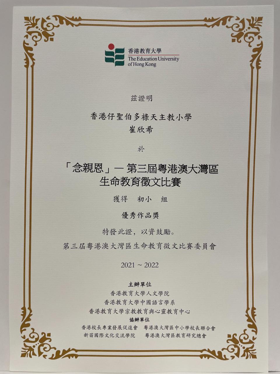 本校秉承「敬主愛人,修德力學」的校訓作育英才,為推動校內「感恩-愛人」的風氣,啓發同學理解中華文化「感恩」與「愛人」的道德內涵,中文科鼓勵學生參與香港教育大學四月舉辦的「第三屆粵港澳大灣區生命教育徵文比賽」。本校更有五位學生榮獲「優秀作品獎」,歡迎大家到學校網頁中「學生作品」一欄欣賞他們的佳作。