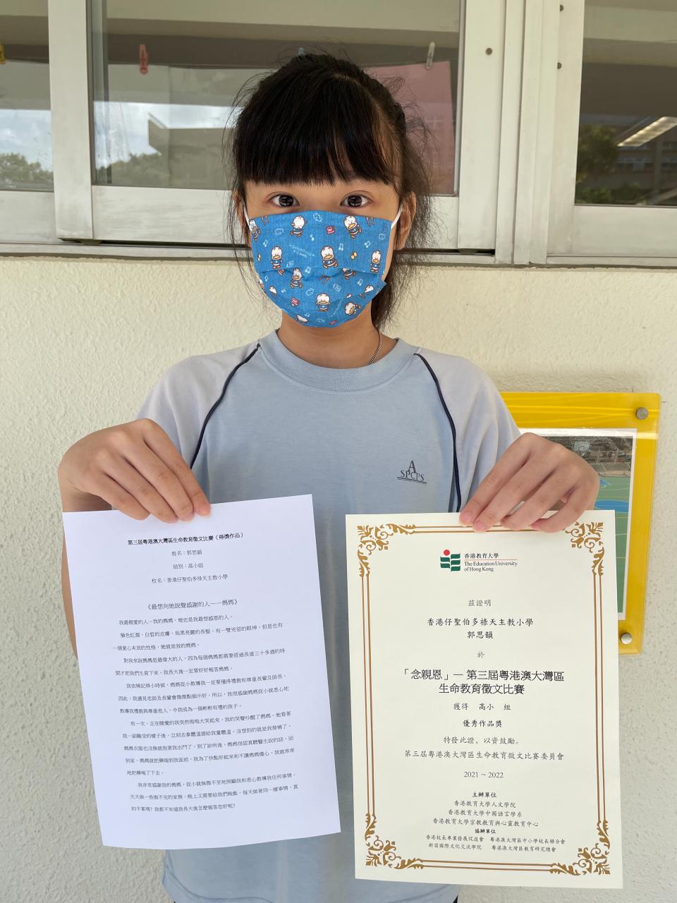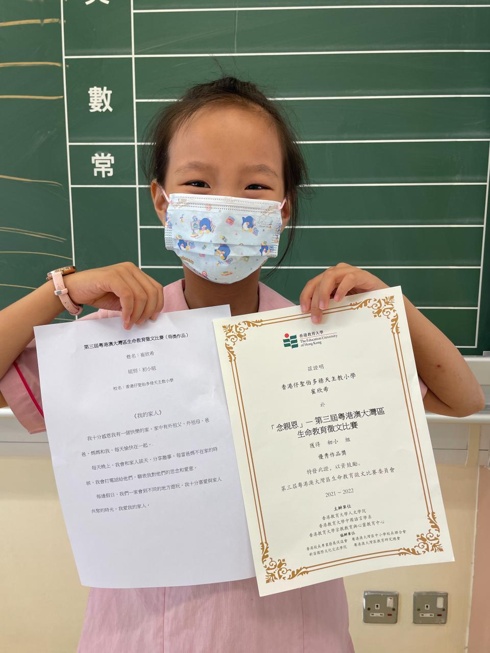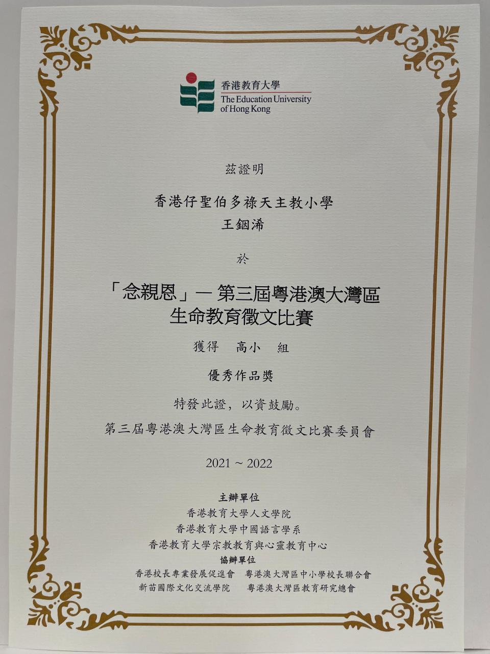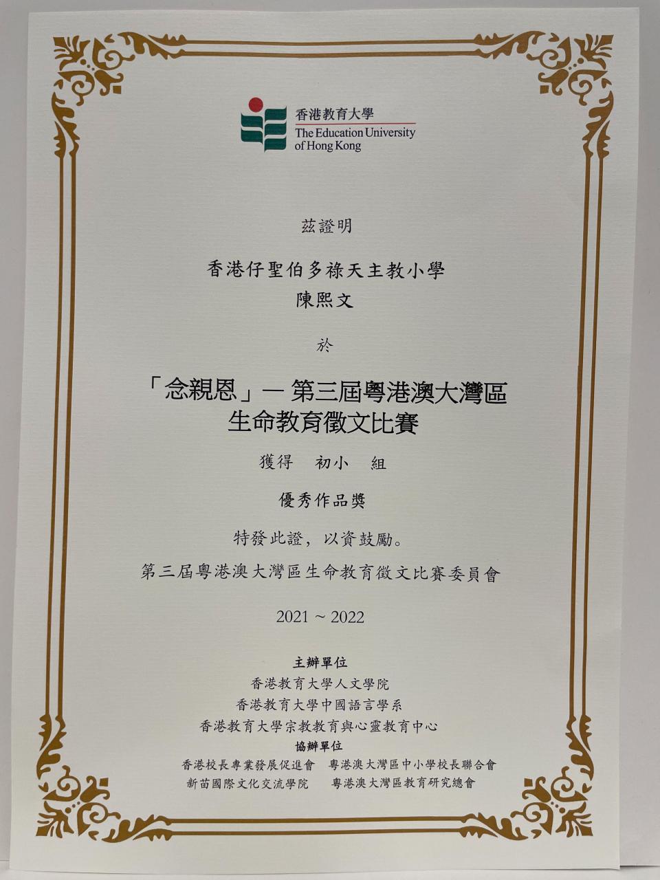 本校秉承「敬主愛人,修德力學」的校訓作育英才,為推動校內「感恩-愛人」的風氣,啓發同學理解中華文化「感恩」與「愛人」的道德內涵,中文科鼓勵學生參與香港教育大學四月舉辦的「第三屆粵港澳大灣區生命教育徵文比賽」。本校更有五位學生榮獲「優秀作品獎」,歡迎大家到學校網頁中「學生作品」一欄欣賞他們的佳作。
