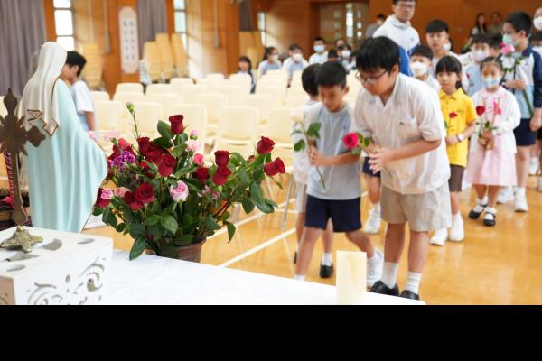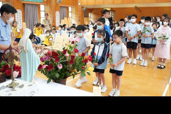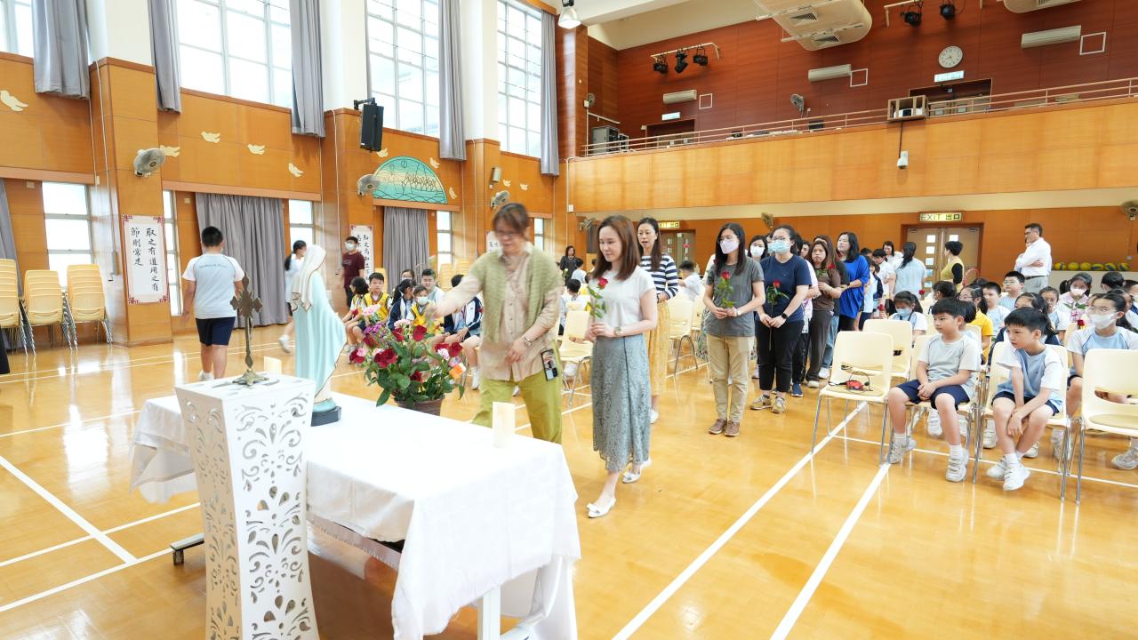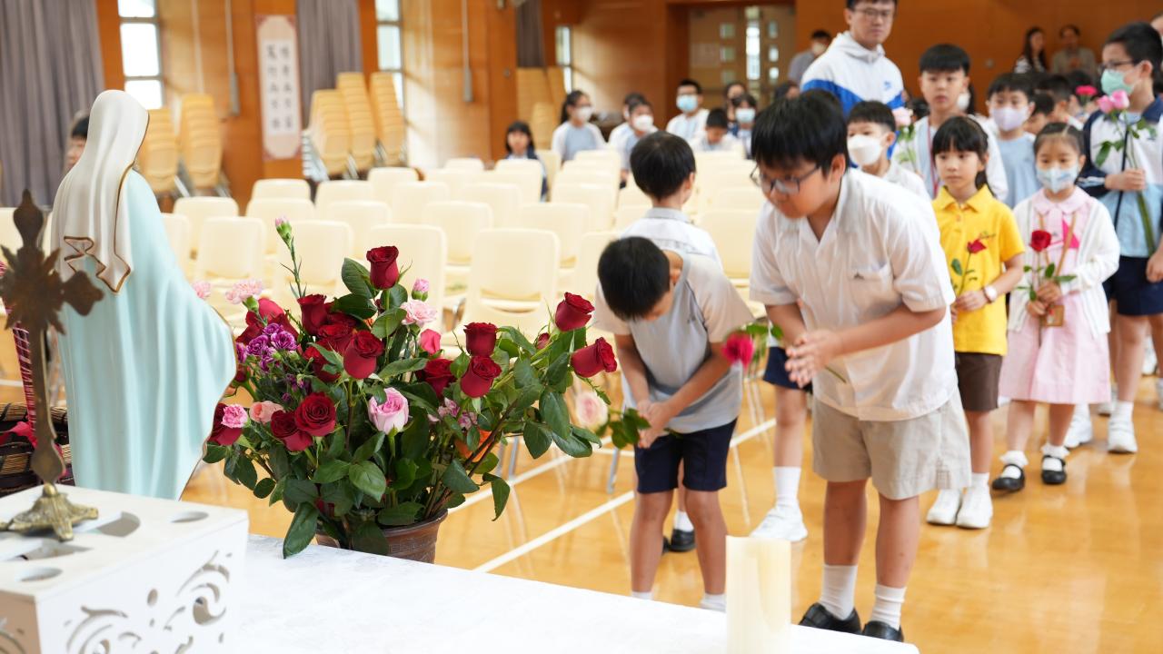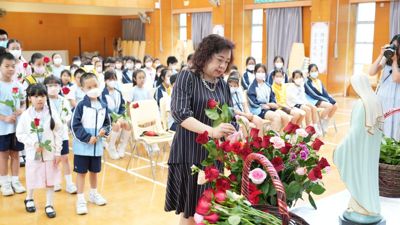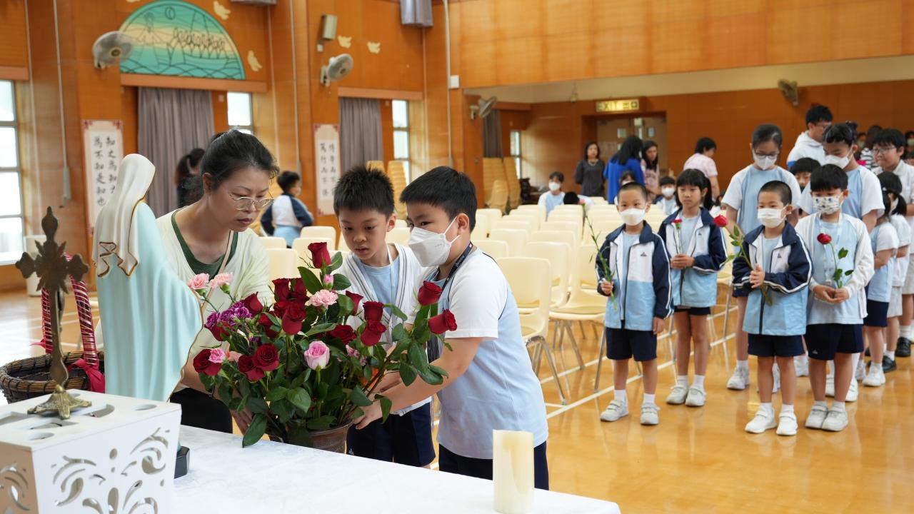 本校於5月3日在學校禮堂舉「聖母月敬禮」,侯麗珊校長帶領一眾學生獻鮮花予聖母瑪利亞,表達對聖母媽媽的孝愛之情,齊聲讚頌她。 校長更鼓勵學生送上神花(好行為)給聖母,並時常與聖母媽媽訴心聲及頌唸玫瑰經。