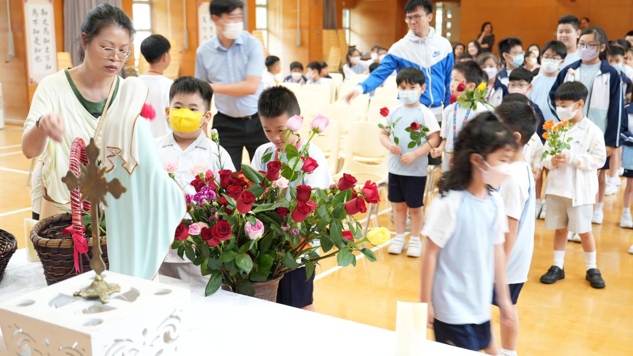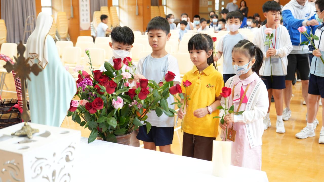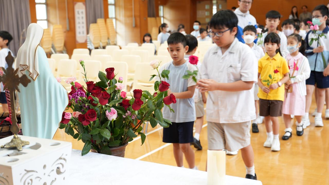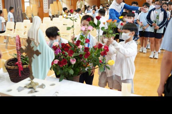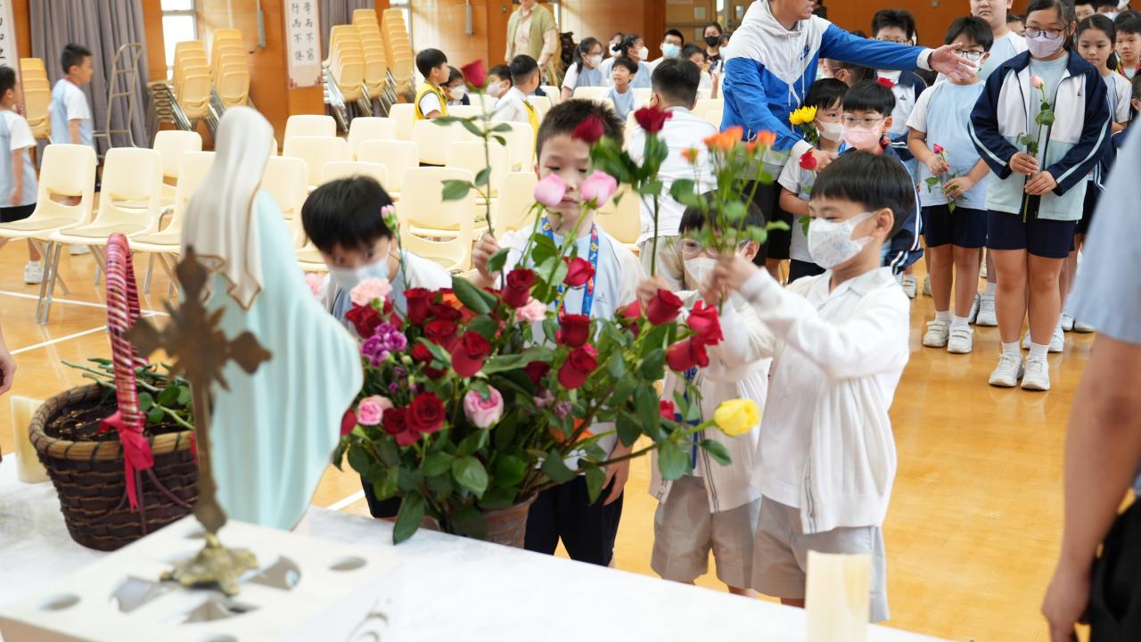 本校於5月3日在學校禮堂舉「聖母月敬禮」,侯麗珊校長帶領一眾學生獻鮮花予聖母瑪利亞,表達對聖母媽媽的孝愛之情,齊聲讚頌她。 校長更鼓勵學生送上神花(好行為)給聖母,並時常與聖母媽媽訴心聲及頌唸玫瑰經。