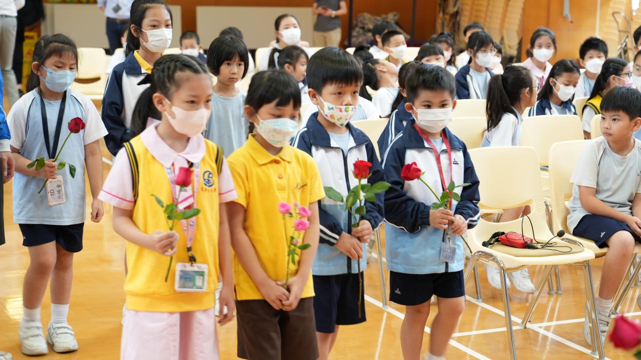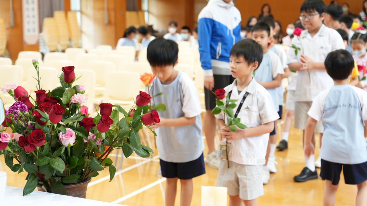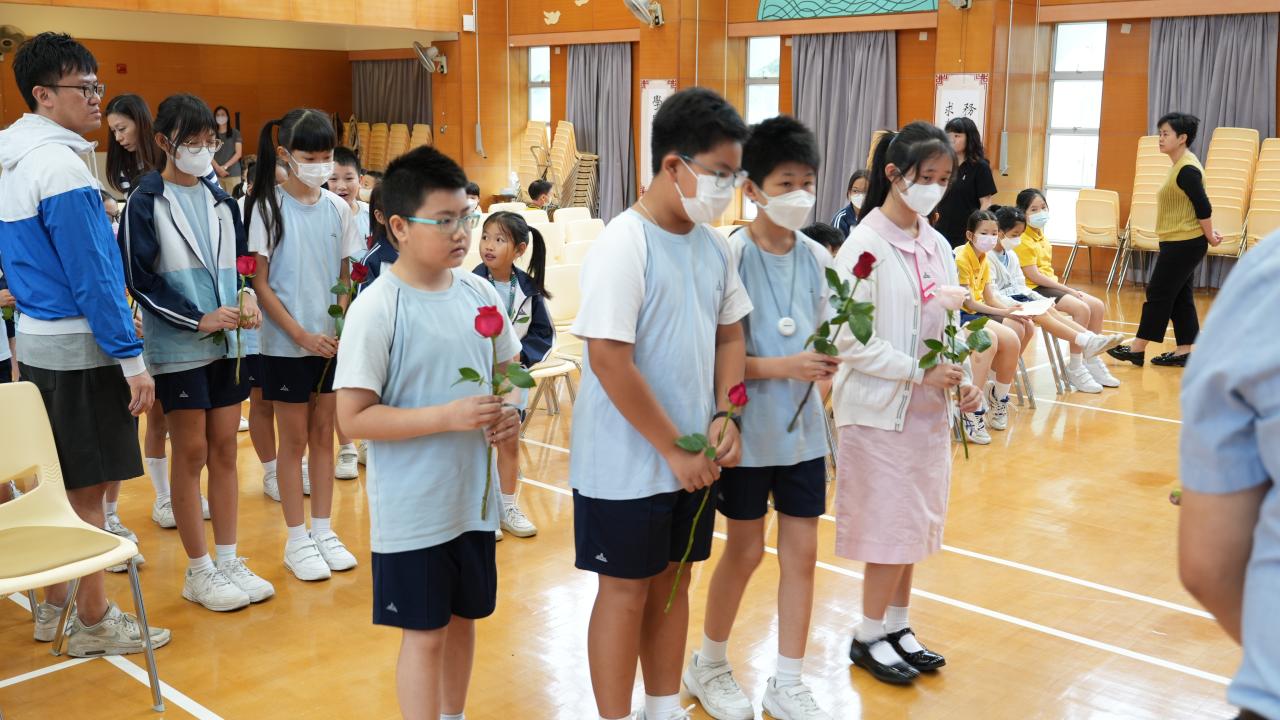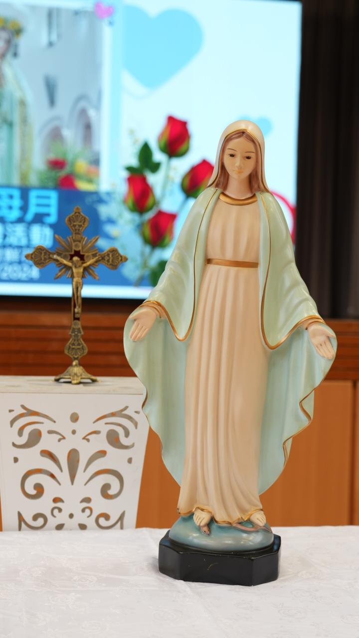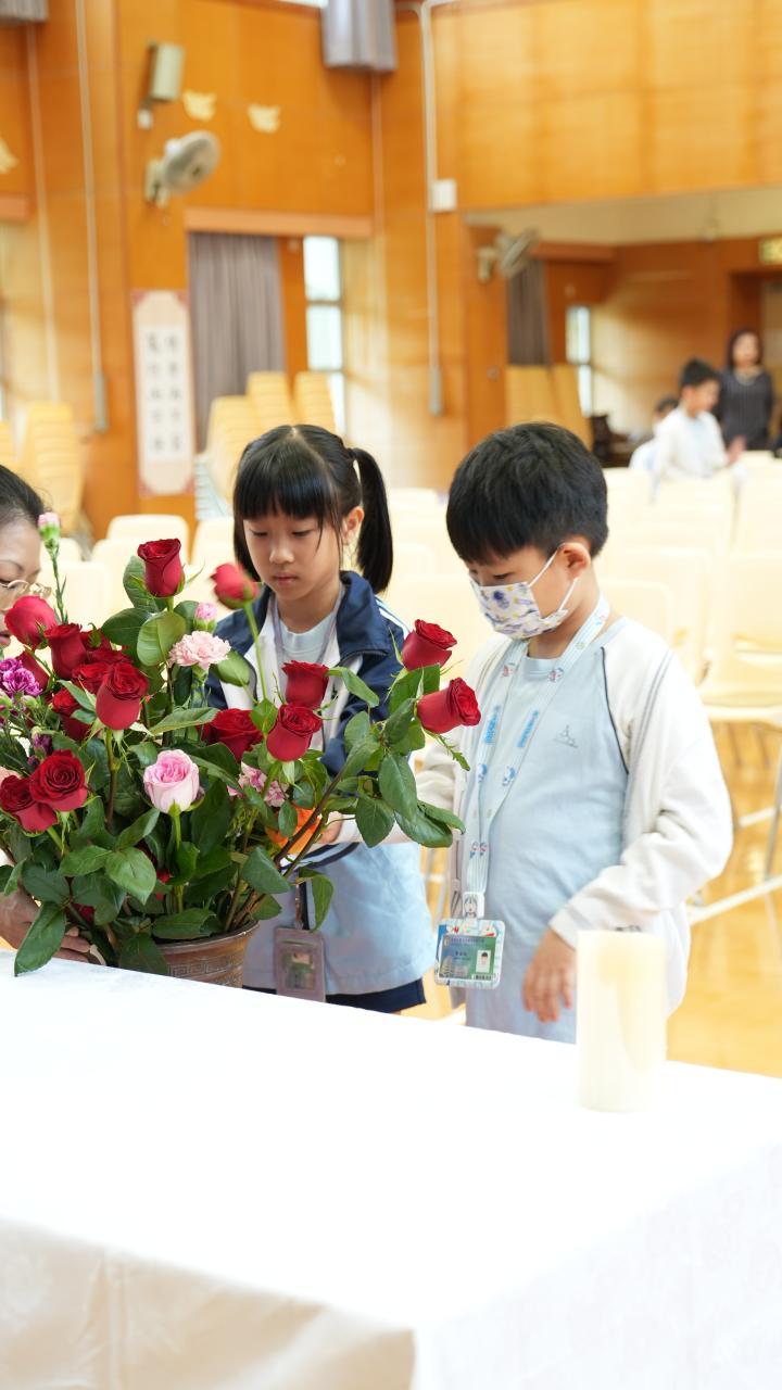 本校於5月3日在學校禮堂舉「聖母月敬禮」,侯麗珊校長帶領一眾學生獻鮮花予聖母瑪利亞,表達對聖母媽媽的孝愛之情,齊聲讚頌她。 校長更鼓勵學生送上神花(好行為)給聖母,並時常與聖母媽媽訴心聲及頌唸玫瑰經。