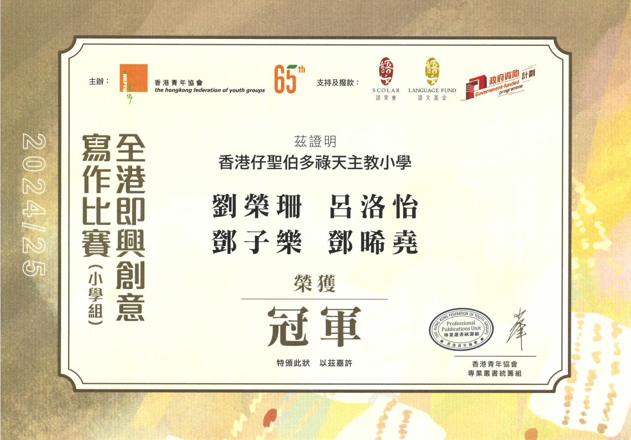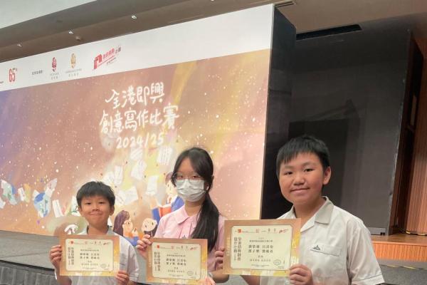 由語文教育及研究常務委員會(語常會)支持及語文基金撥款,香港青年協會主辦的「全港即興創意寫作比賽2024/25」,本校由六年級四位同學組成的隊伍榮獲小學組冠軍。