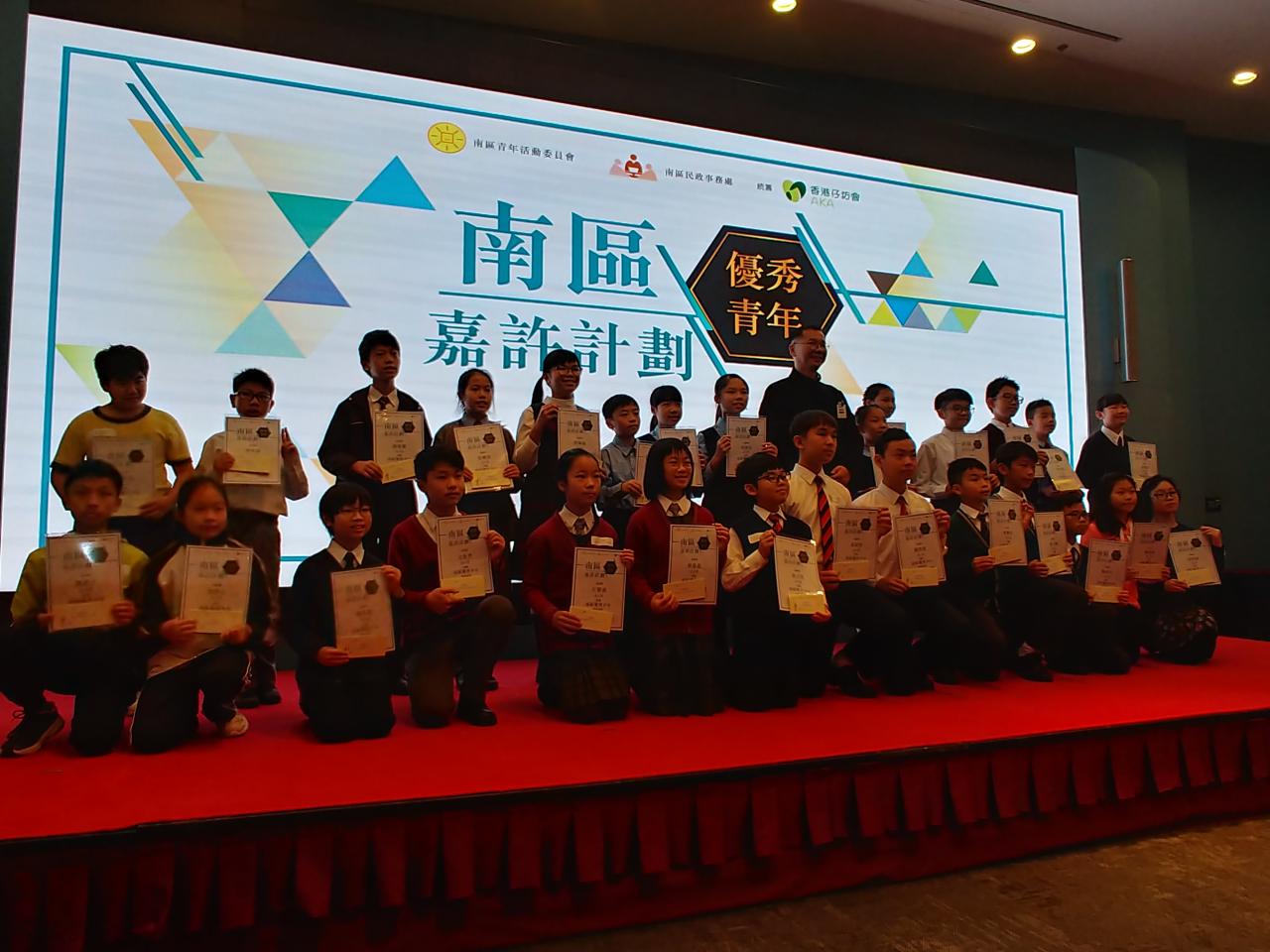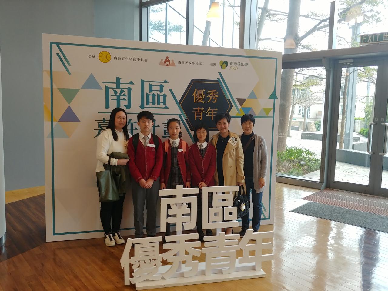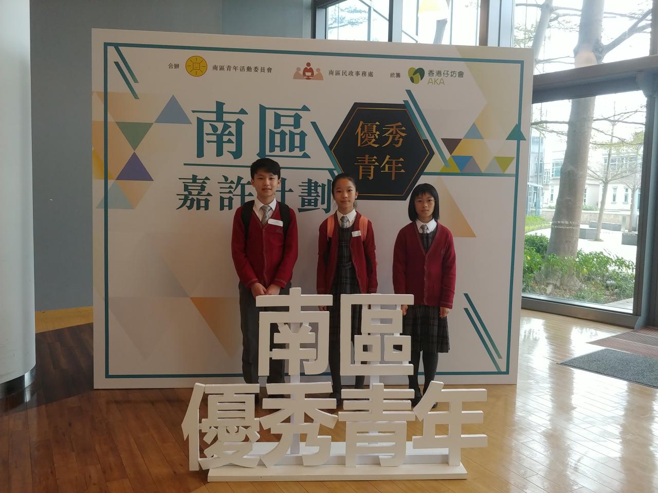 本校共有三位學生:6A江紫睿、6D文振學及林嘉慧,參加了由南區青年活動委員會聯同南區民政事務處舉辦的「南區優秀青年嘉許計劃」,並獲評選為「優秀青年」,實在可喜可賀! 獲選的同學與家長亦於2019年12月22日出席了「南區優秀青年嘉許禮」。
