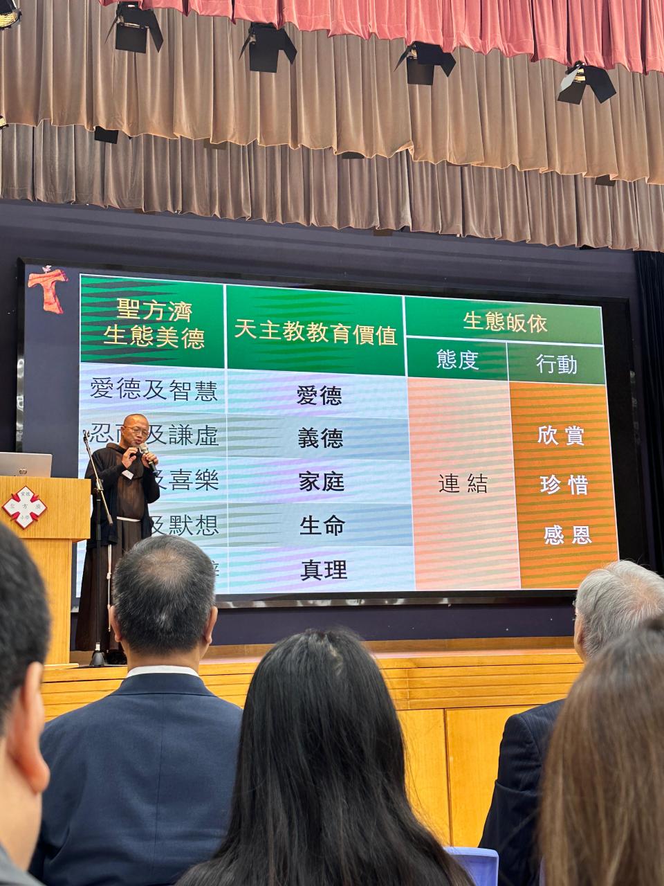 原定於2025年7月舉行的「賽馬會節能減電學校計劃——教區及明愛學校成果分享會暨頒獎典禮」因受惡劣天氣影響而延期至07/11/2025(四)舉行。當天,天主教香港教區副主教陳永超神父、天主教香港教區教育事務主教代表龔廣培先生代表致勉,回顧計劃進行一年多以來之成果。環保教育講座後,有學校代表分享參加此計劃於工程或環保教育活動取得之經驗,頒獎典禮部分則頒發了標語設計比賽的各個獎項。本校5A班戚明謙同學榮獲小學組季軍。 得獎作品: 愛主愛人愛地球,省電節能不奢求 創作理念: 天主創造萬物給人類,人類應該奉行愛主愛人的精神,並且愛地球,以求令人類可以繼續保存天主的愛。省電節能每天都要實行,以配合愛地球的目的,不奢求會有更多資源源源不絕地提供,應要減省能源作為目標,讓世世代代可享受天主的愛。