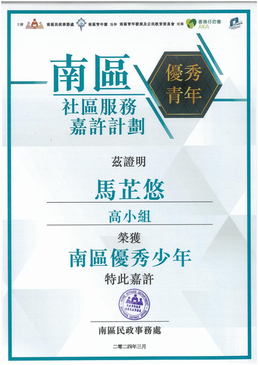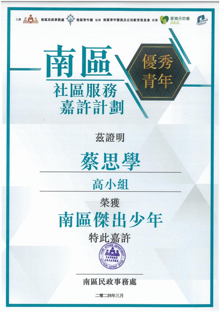 由南區青年團及南區民政事務處主辦、南區青年發展及公民教育委員會協辦的「2023年南區優秀青年社區服務嘉許計劃」,本校學生榮獲殊榮,名單如下: